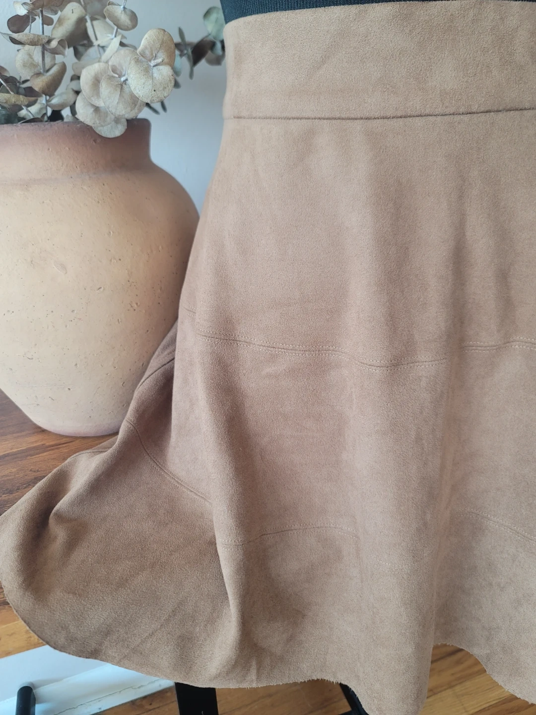 Chic A-line skirt by David Lerner. Soft tan fabric. Versatile and stylish. #70sstyle #retro #bohemian #boho-chic #suedestyle #panaled #winter #spring #earthtone #minimal #casual #oldmoneystyle #quietluxurystyle #a-line #mini #midi #western #neutral #businesscasual #office #layers #preppy #collegiate #professional #vintageinspired #festival #theme #cottage #designer #eclecticgrandpa #tights #boots #sustainablefashion approximate measurements included