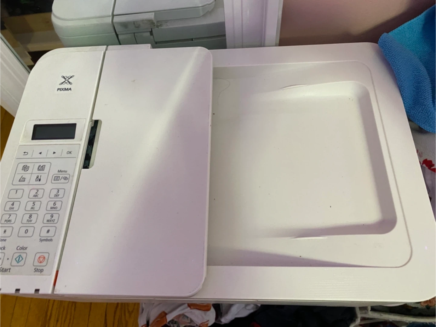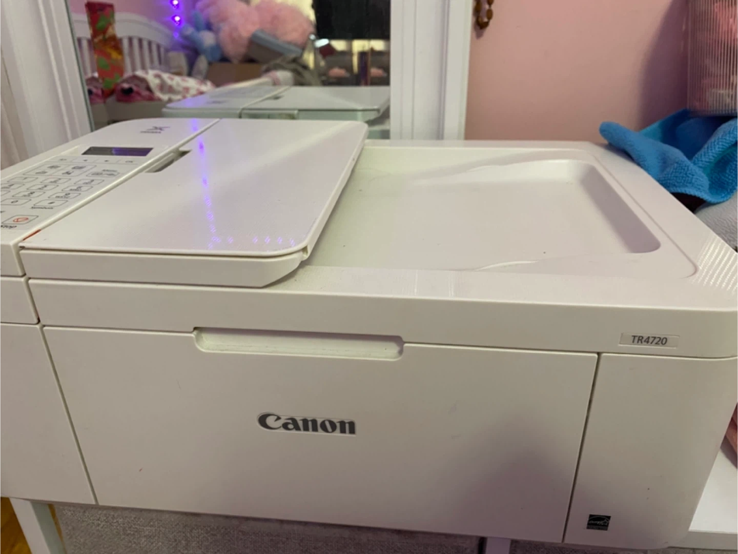 This is a white Canon PIXMA TR4720 all-in-one printer. It's capable of printing, scanning, and copying. Includes a document feeder for scanning multiple pages.