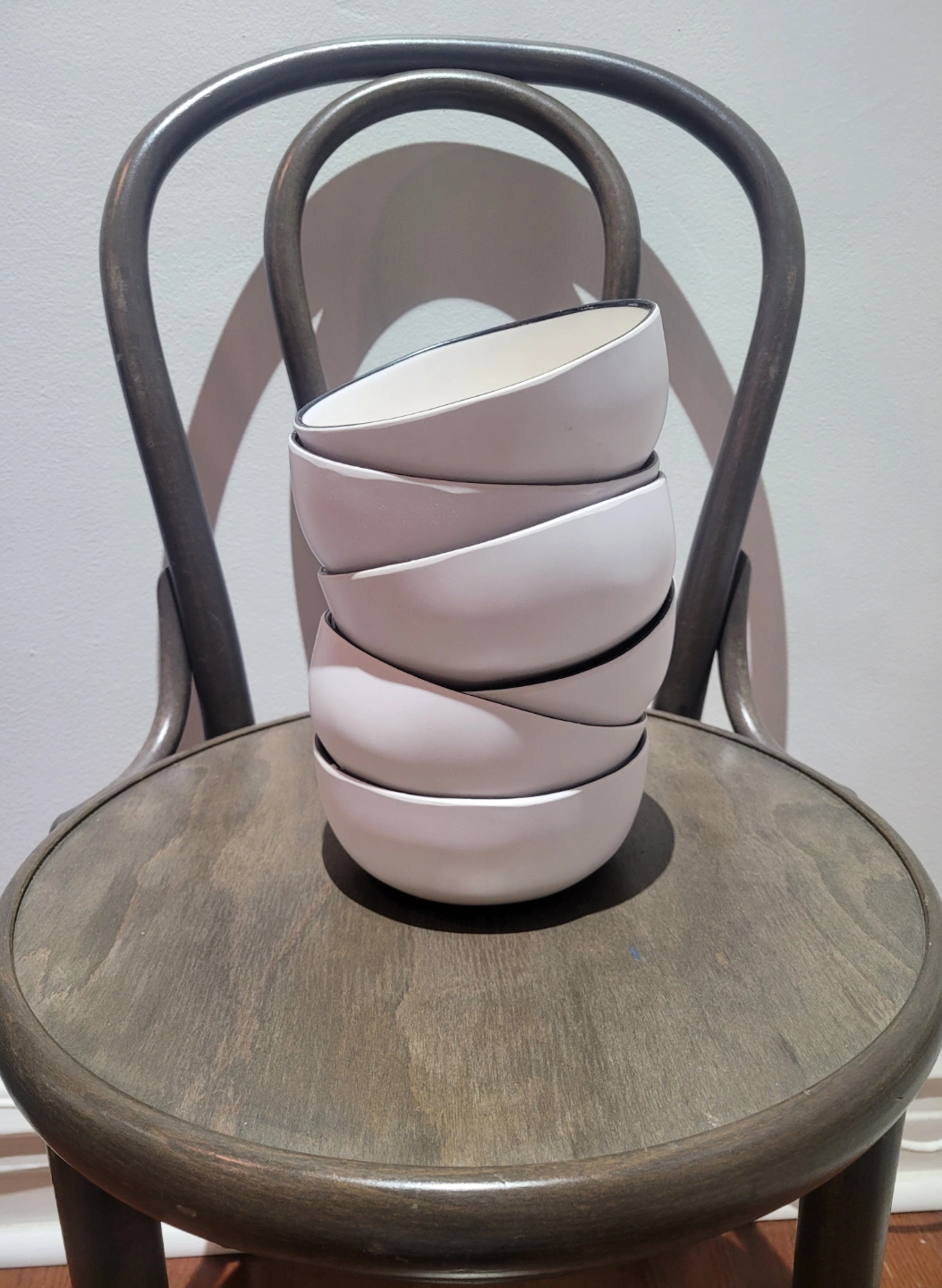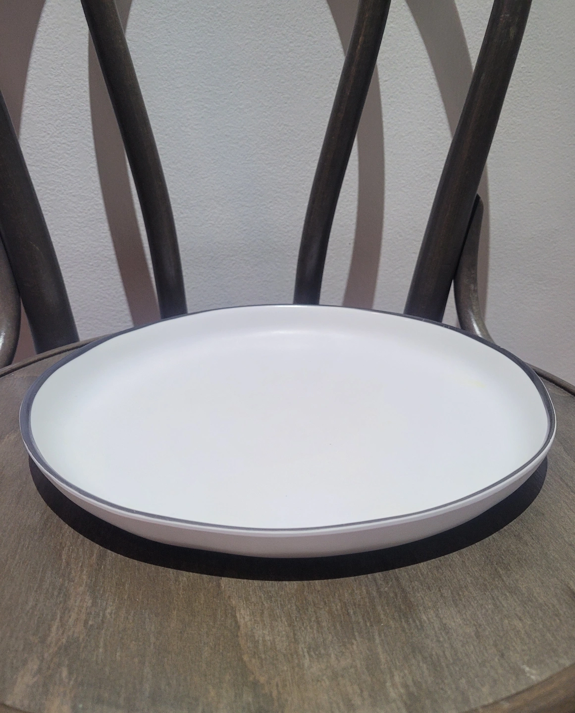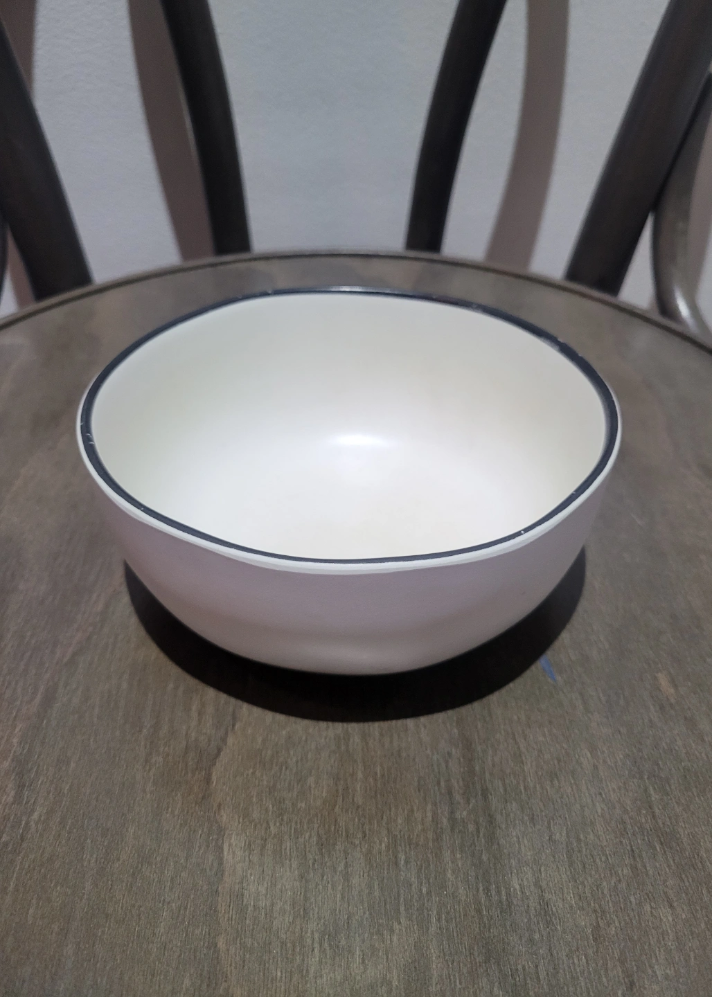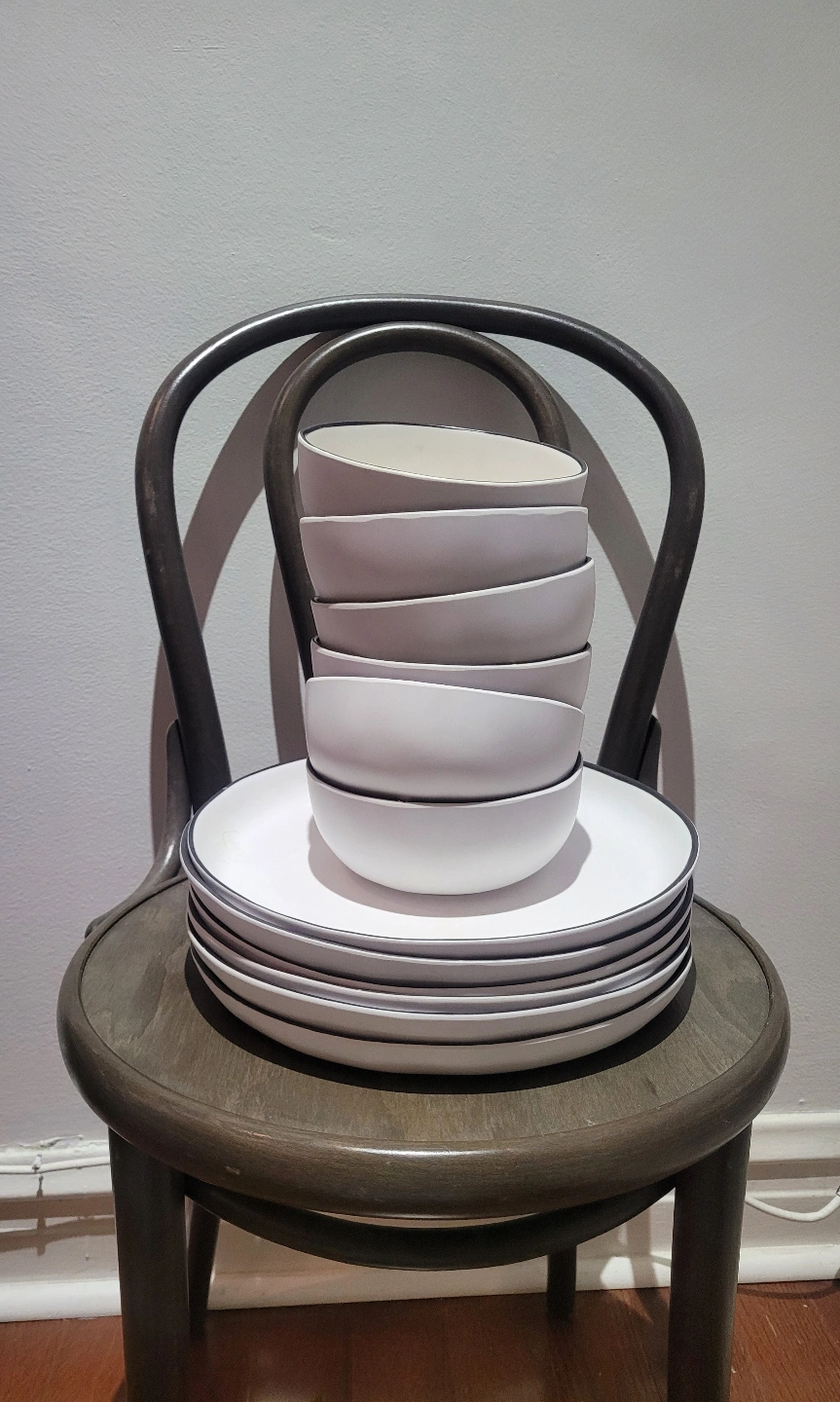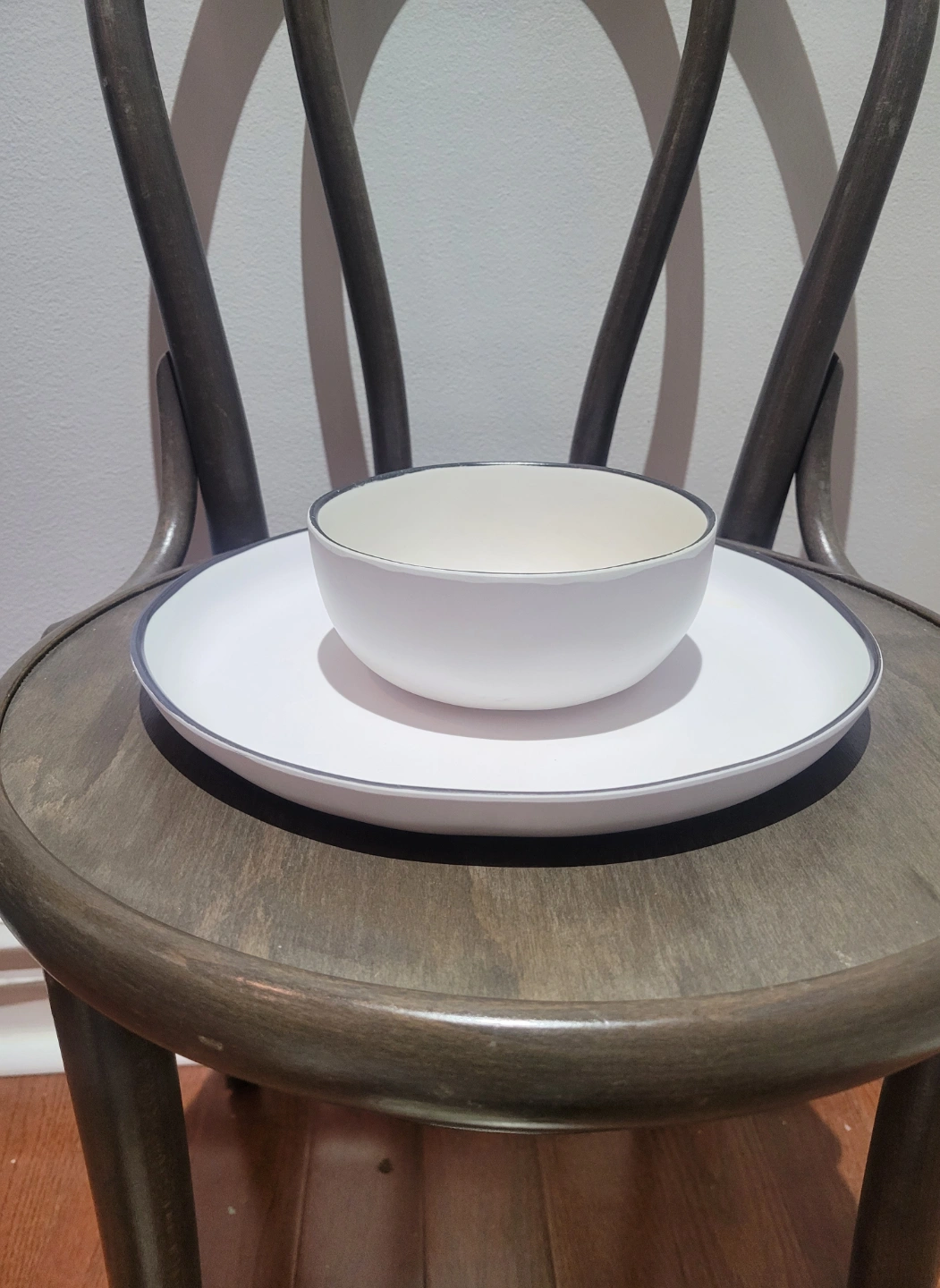 Set of 6 melamine bowls and plates from Crate and Barrel (still sold on website). Off-white with a black rim. Great for casual dining and kids, since they're hard to break. Dishwasher safe. Some slight food stains and faded trim, but lots of life left. I'm trying to declutter.