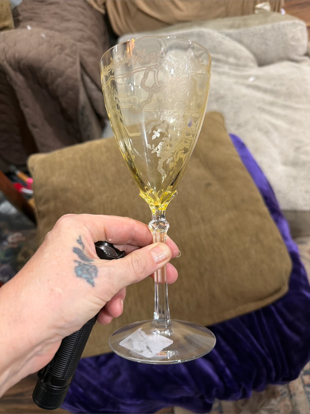 This yellow glass goblet features an etched floral design. It's perfect for serving wine or other beverages. Glass material. I have 2 available