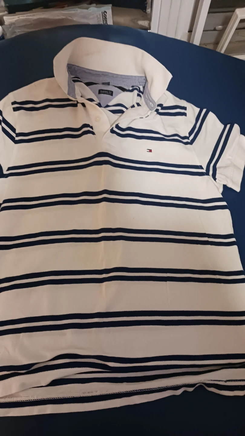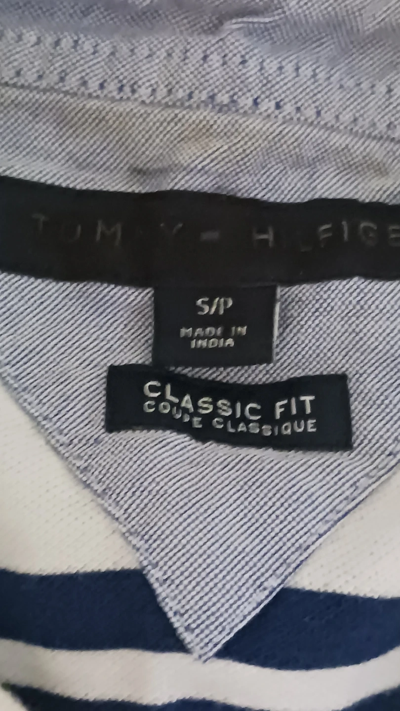 Tommy Hilfiger short-sleeve polo shirt in a classic fit. It's white with navy blue stripes. Size is S/P. Made in India. Never worn!