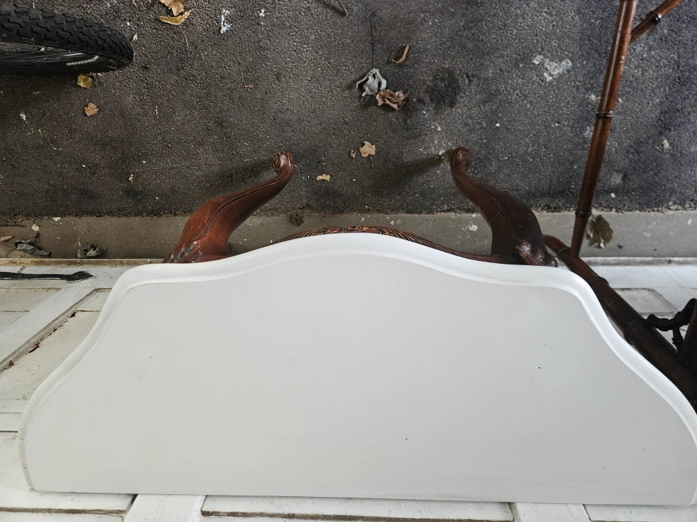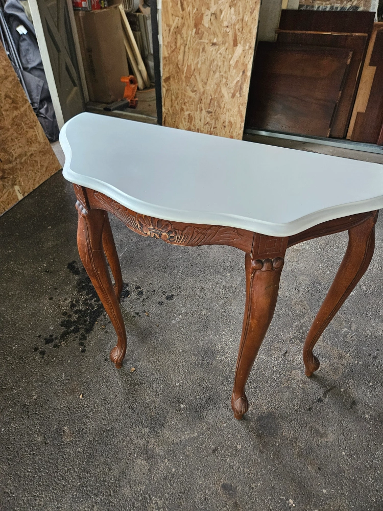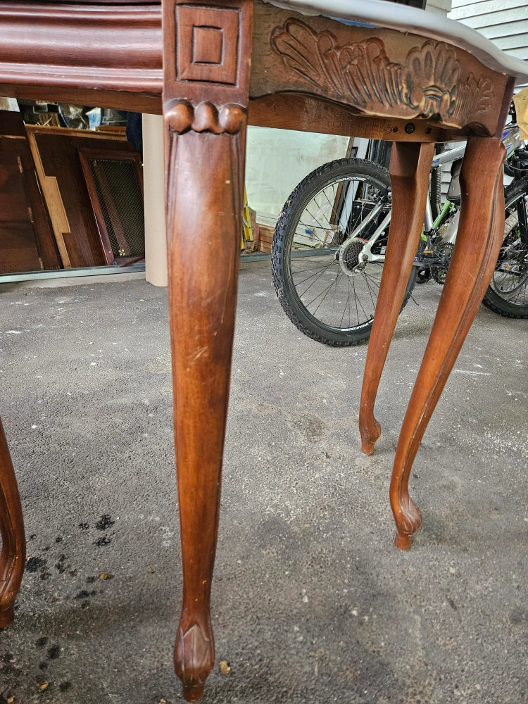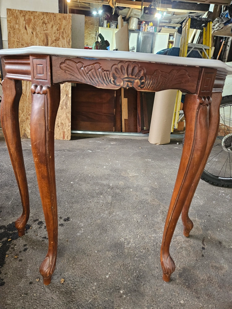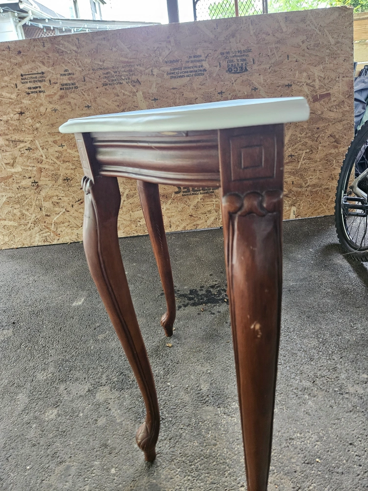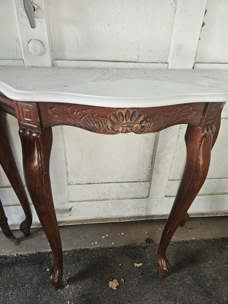 Ornate wooden console table. Features a curved marble top and carved details. Unique legs. Perfect for entryway or living room.
