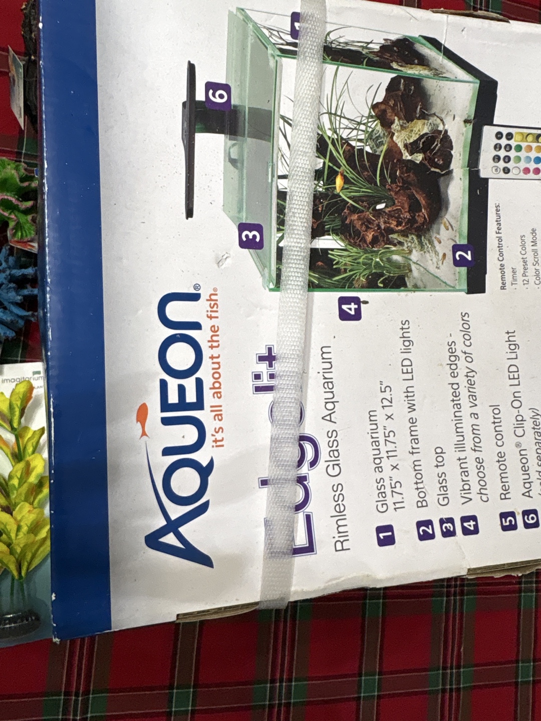 I'm selling an Aqueon Rimless Glass Aquarium. It comes with vibrant illuminated edges so you can choose from a variety of colors. It also includes a remote control with a timer and 12 preset colors. The dimensions are 11.75" x 11.75" x 12.5". It also includes an Aqueon Clip-On LED light