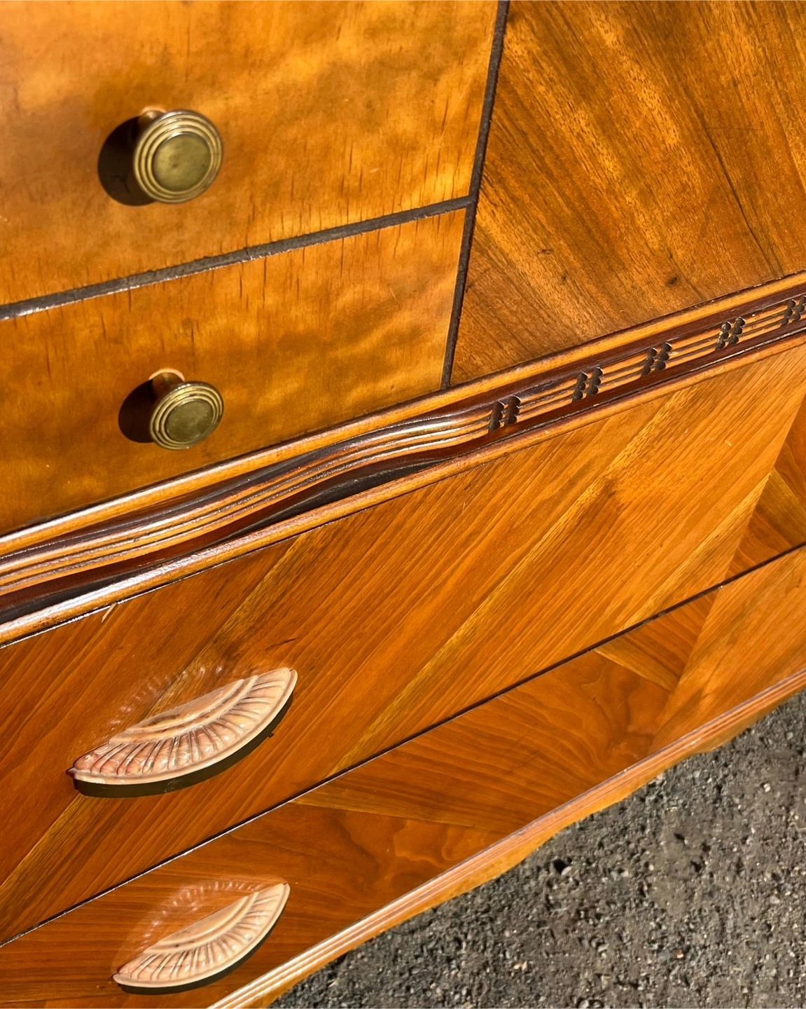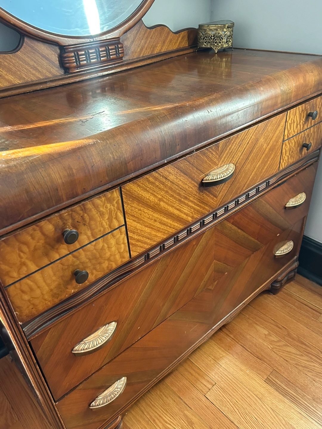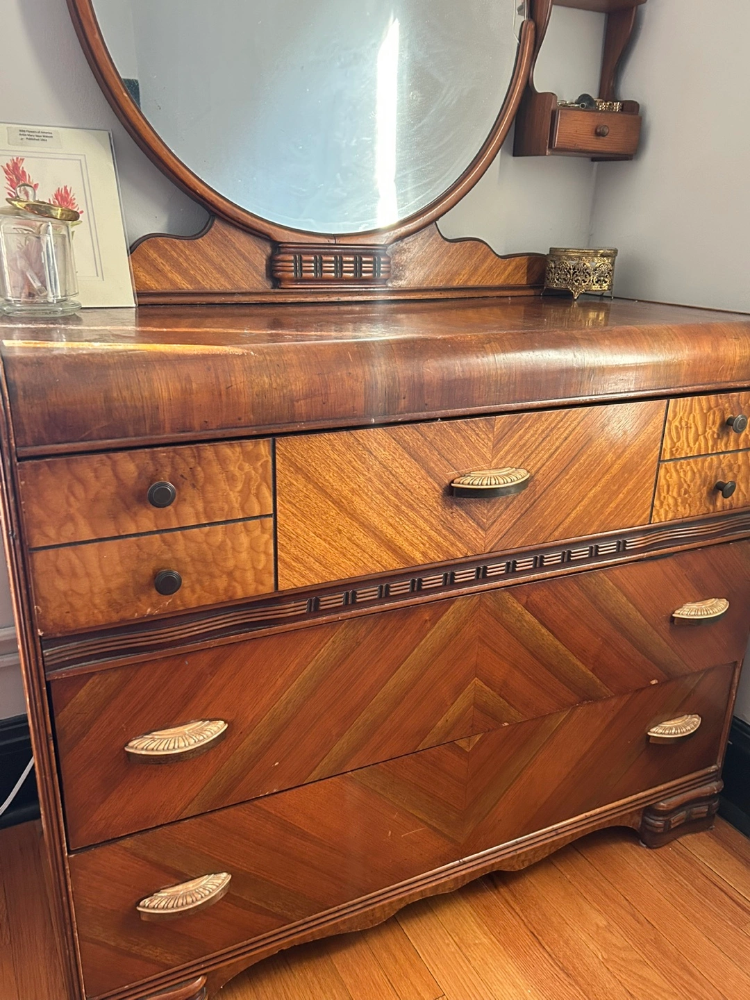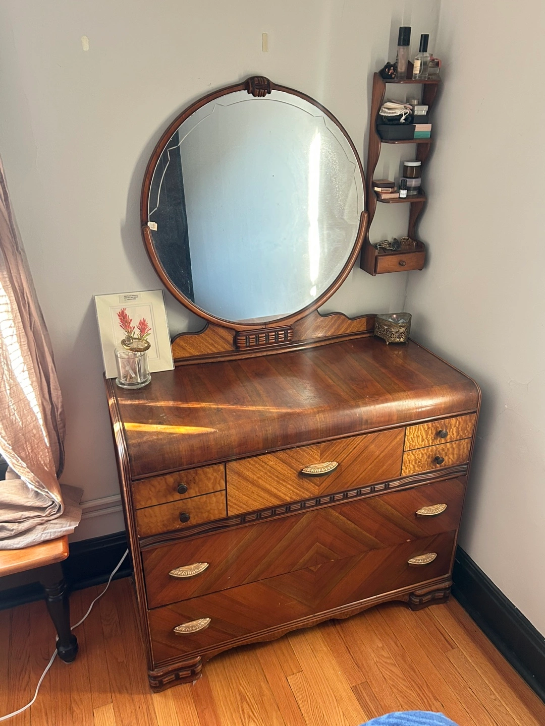 Beautiful antique 1930’s wood waterfall edge dresser with detachable round mirror.