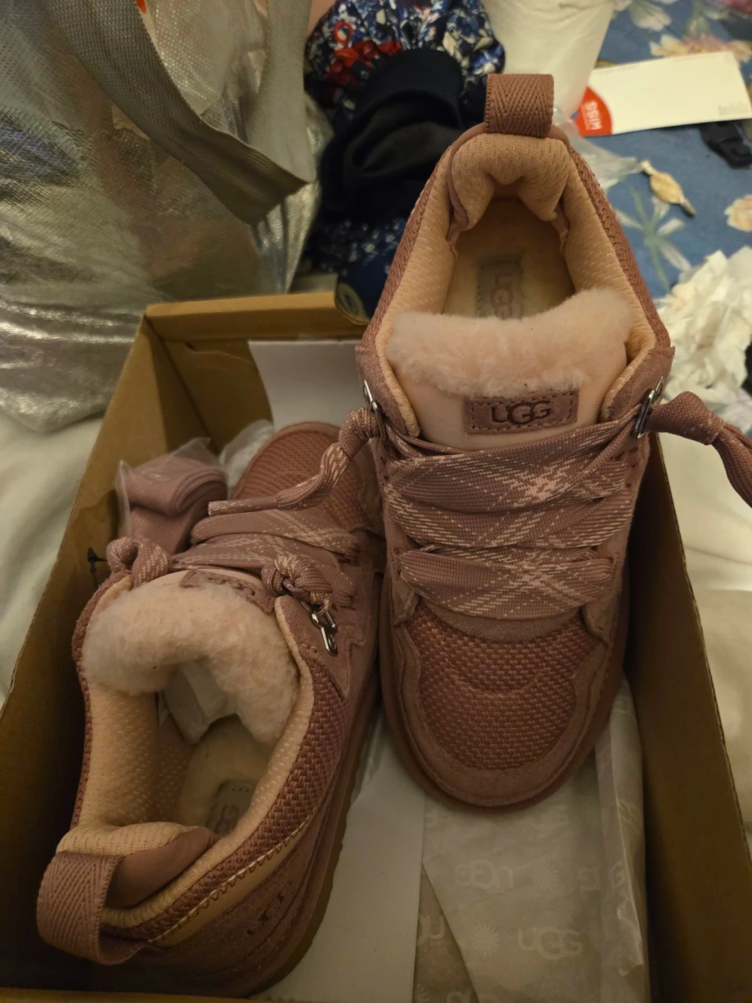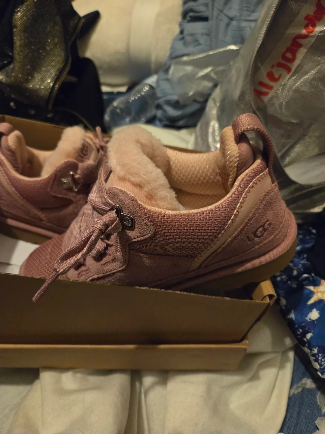 UGG sneakers in a dusty pink color. Features suede and mesh upper with cozy faux fur lining. Comes with original box and extra laces. Perfect for casual wear!