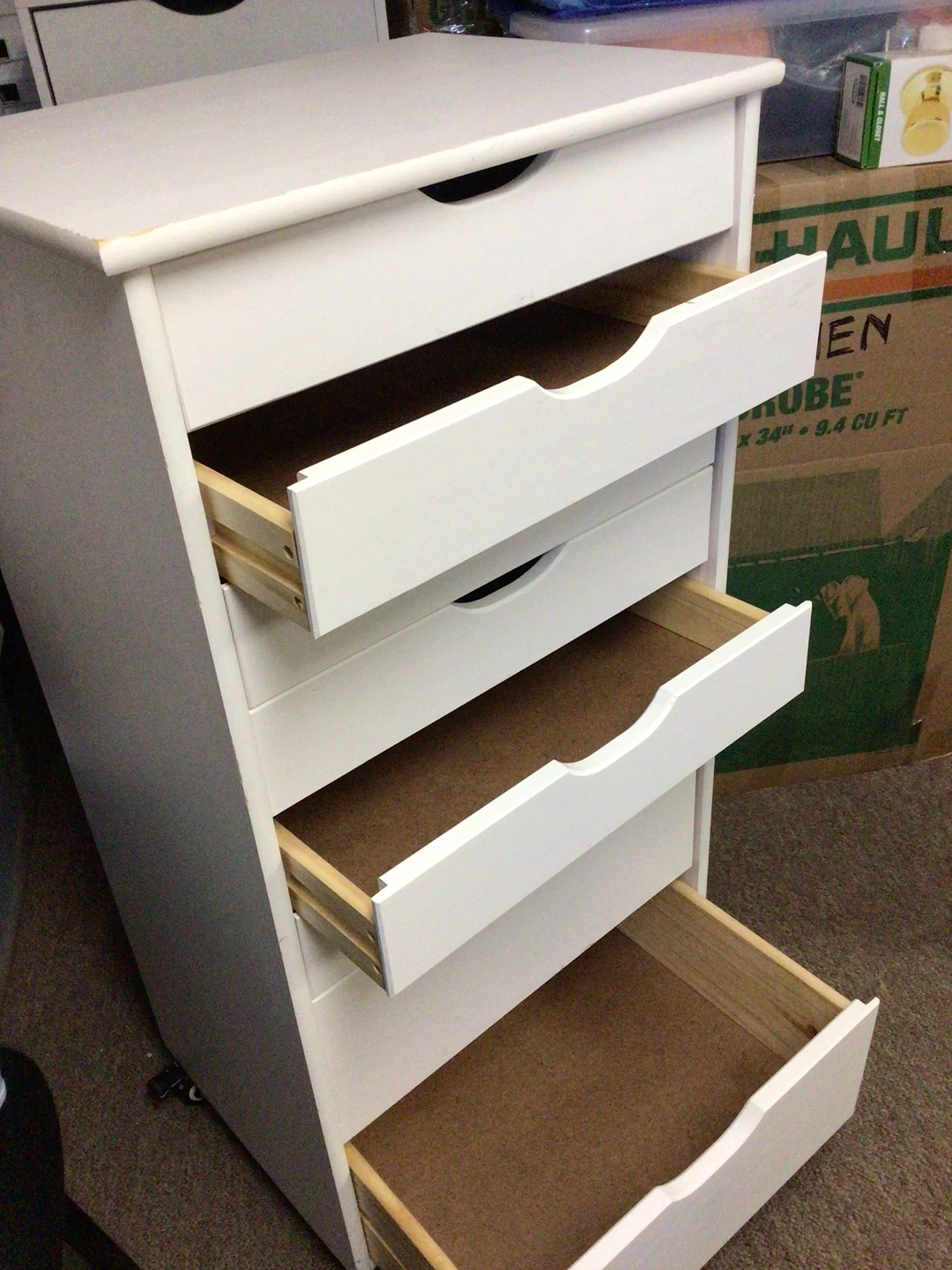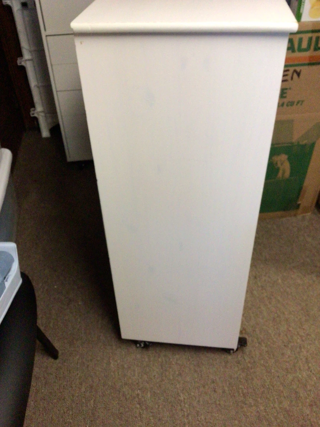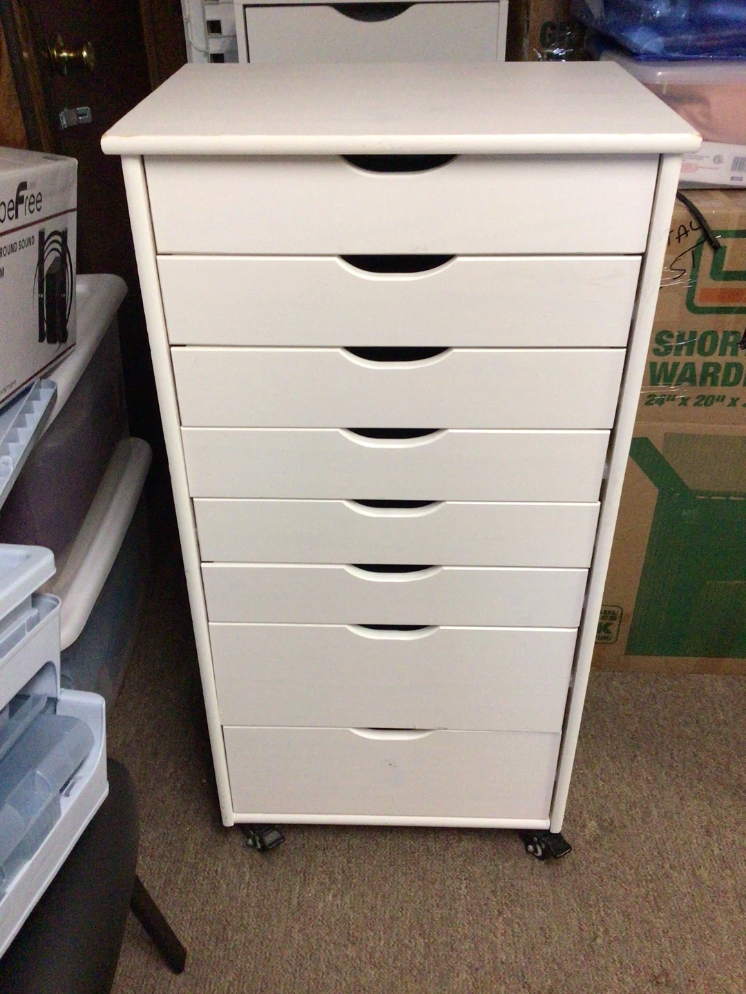 White 8-drawer rolling storage cart. Perfect for organizing craft supplies or office essentials. Features casters for easy mobility. Dimensions 20x15 height is 41 inches