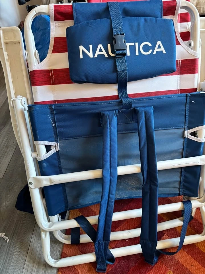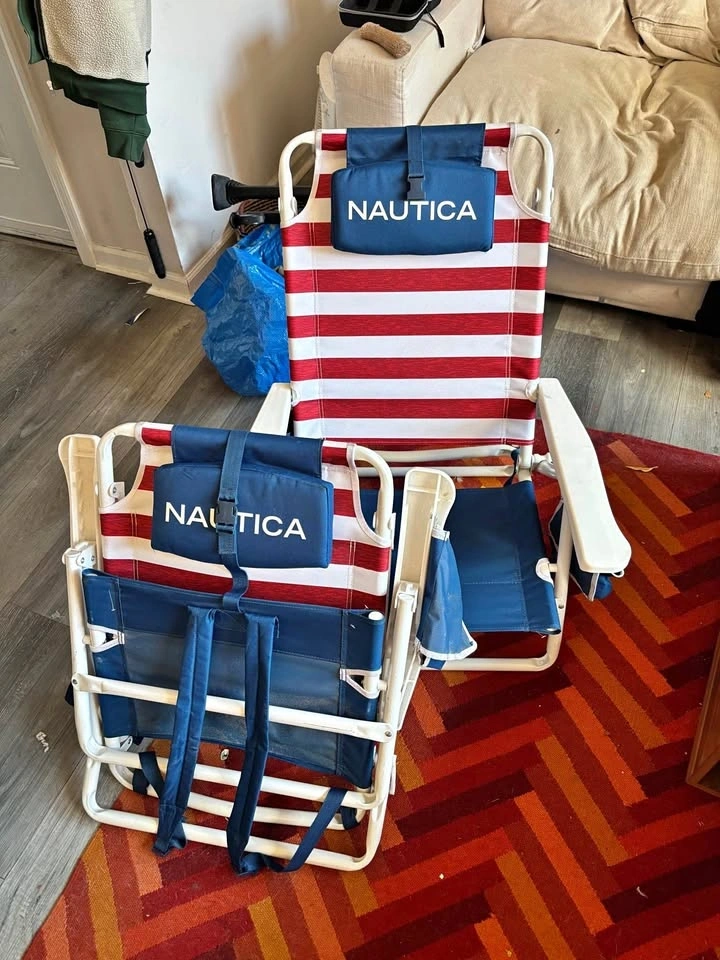 These are Nautica brand beach chairs featuring a white steel frame, red and white striped fabric, and backpack straps for easy carrying. Price for both.