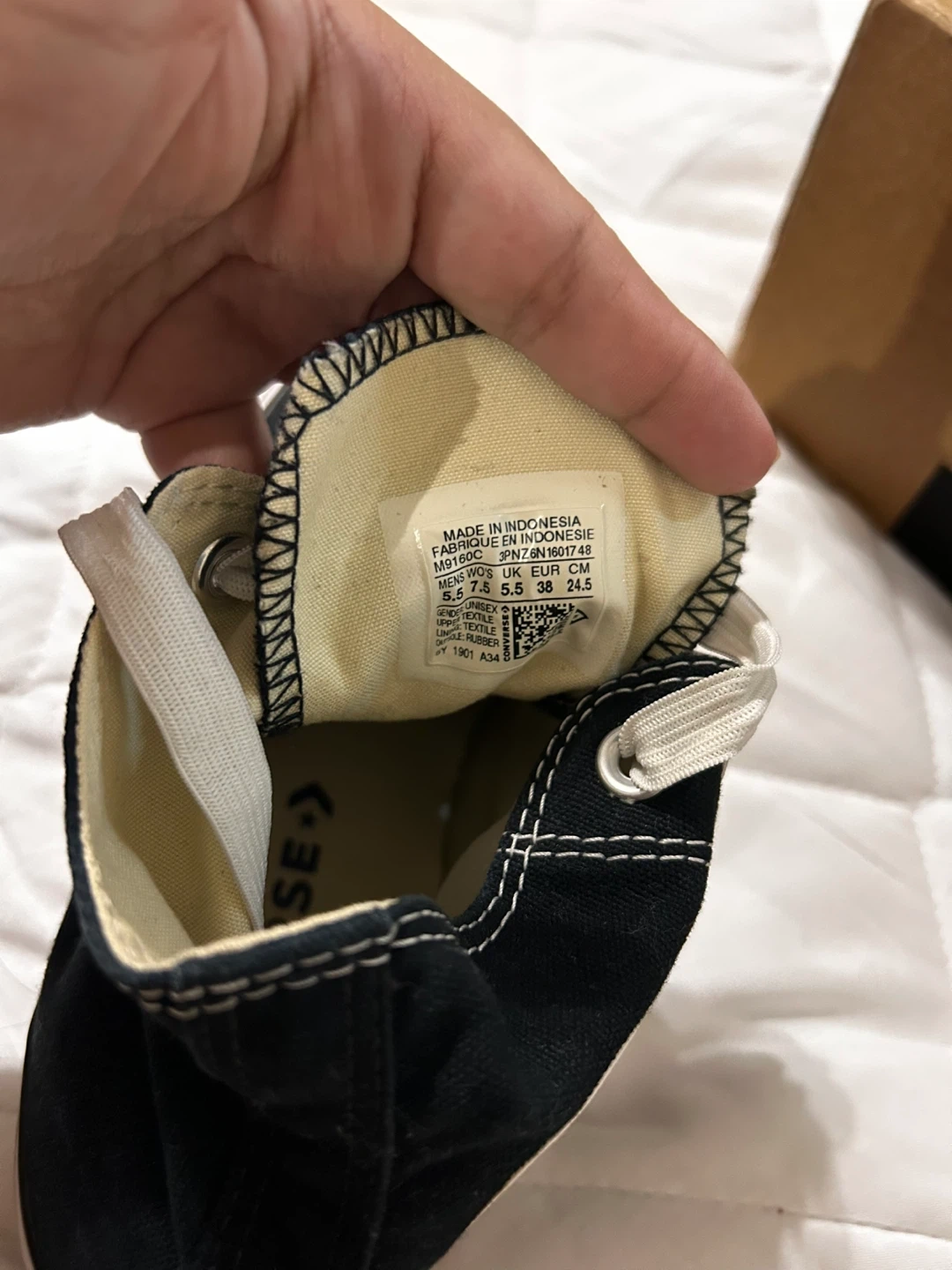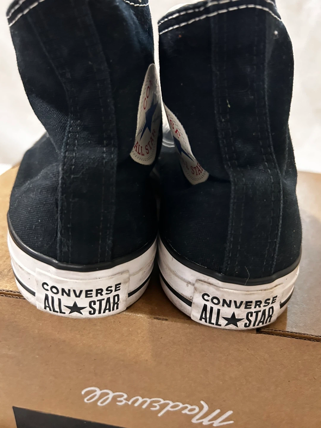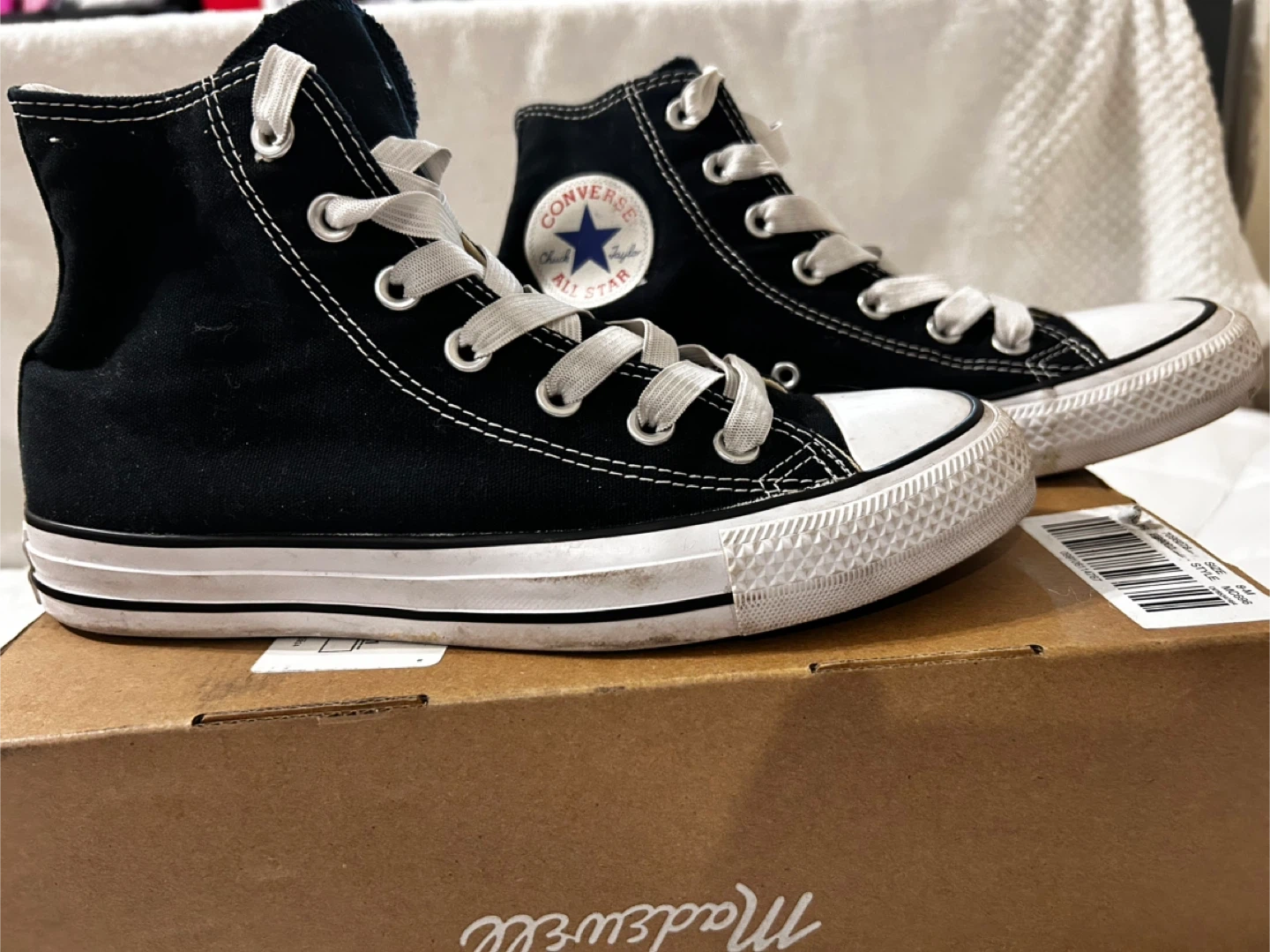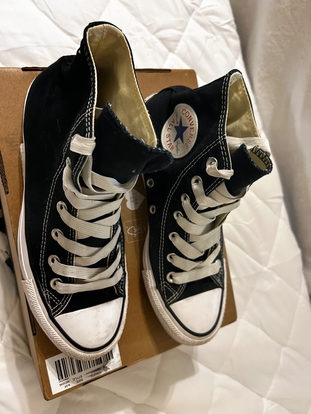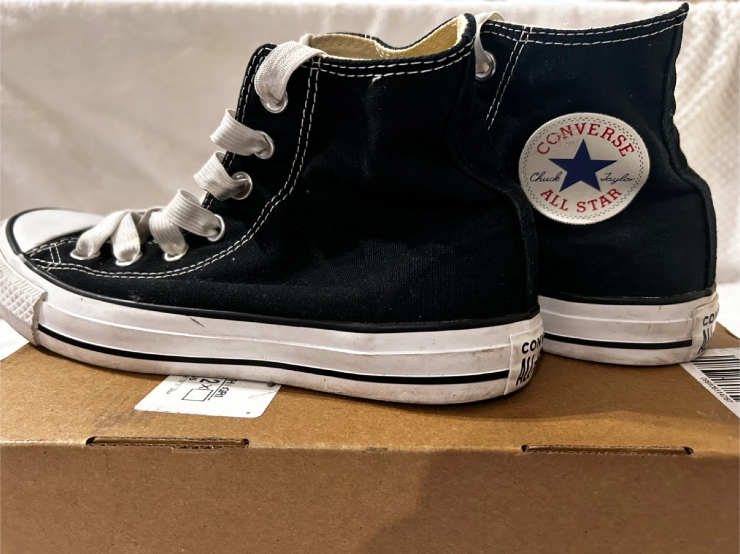 Selling a pair of Converse All Star high tops in black. They are a women's size 7.5 US. These classic sneakers are in good condition and ready for a new home!