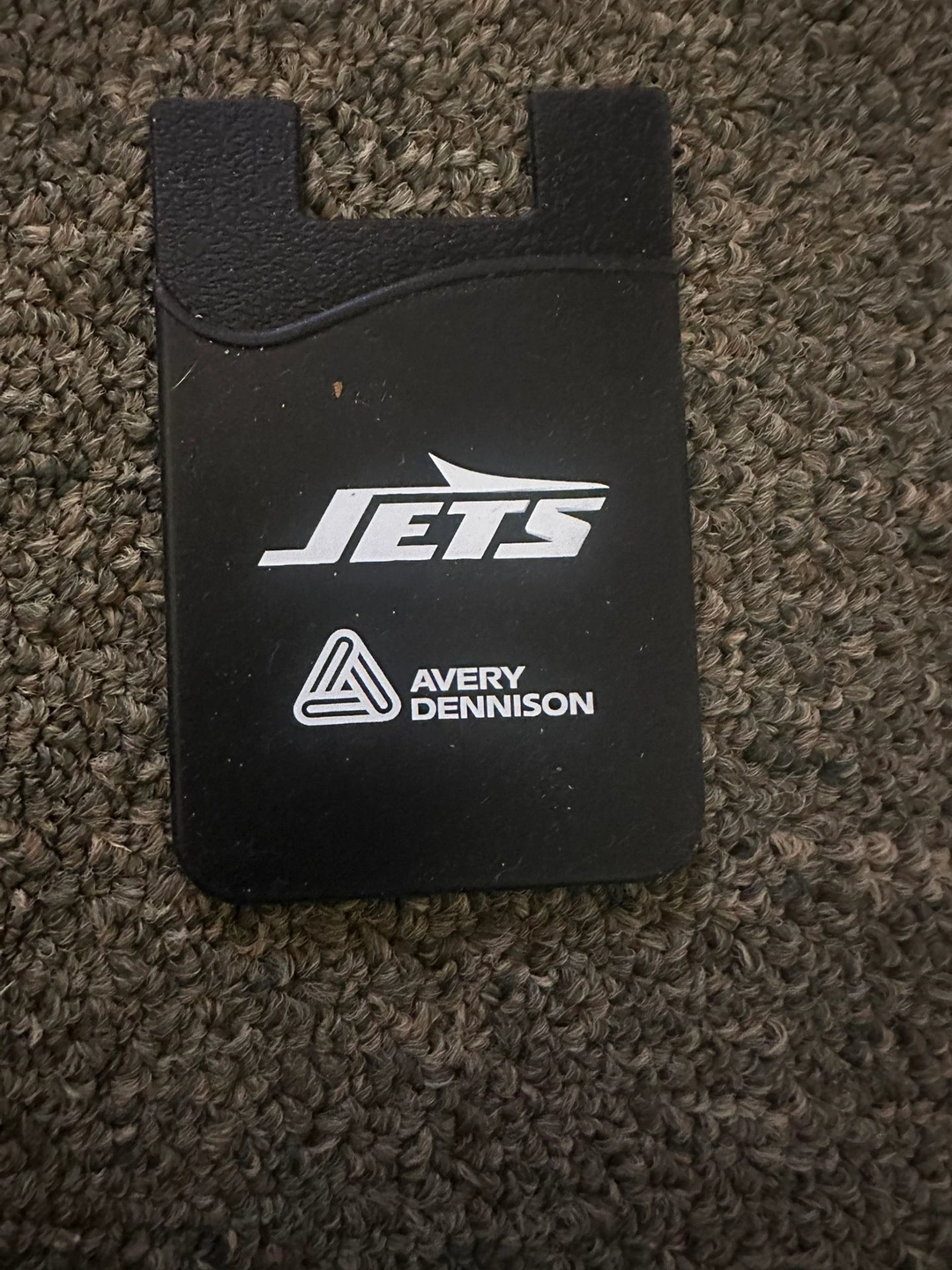 This is a credit card holder designed for cell phones, featuring New York Jets branding. It's a practical accessory for keeping your essentials together.