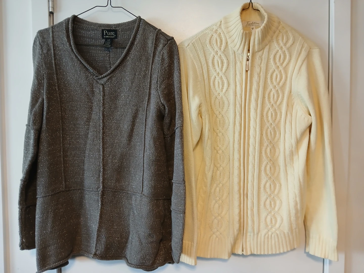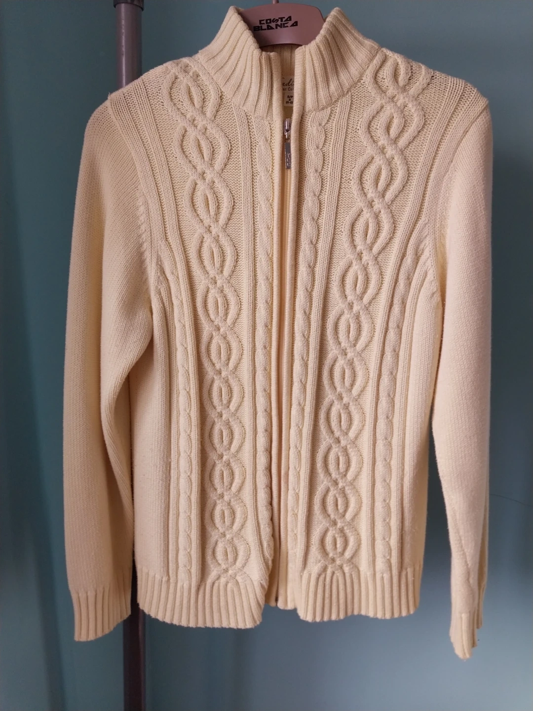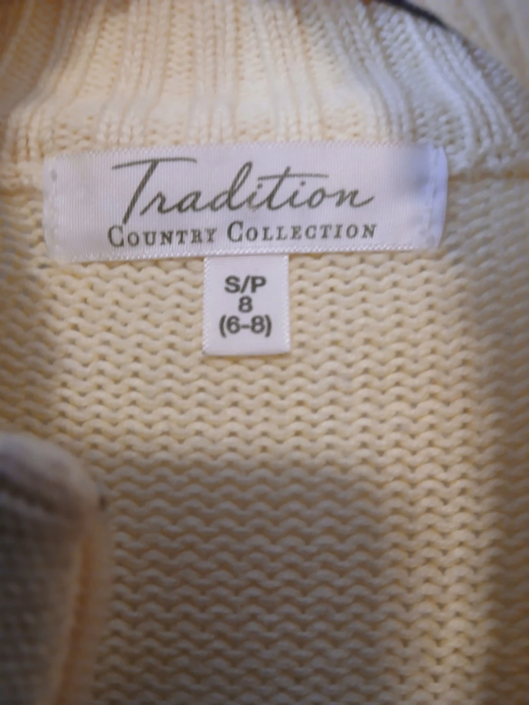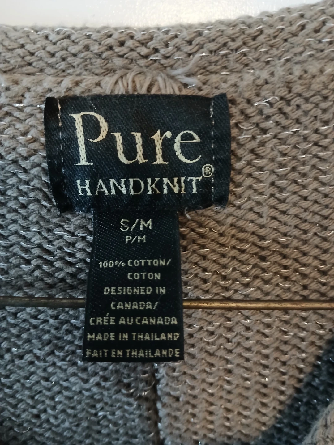 This Pure Handknit sweater is 100% cotton. It's designed in Canada and made in Thailand. This sweater is a size S/M. 2nd item is a Tradition Country Collection Cardigan with full zipper. Wear it open or zipped up! Size S/M.