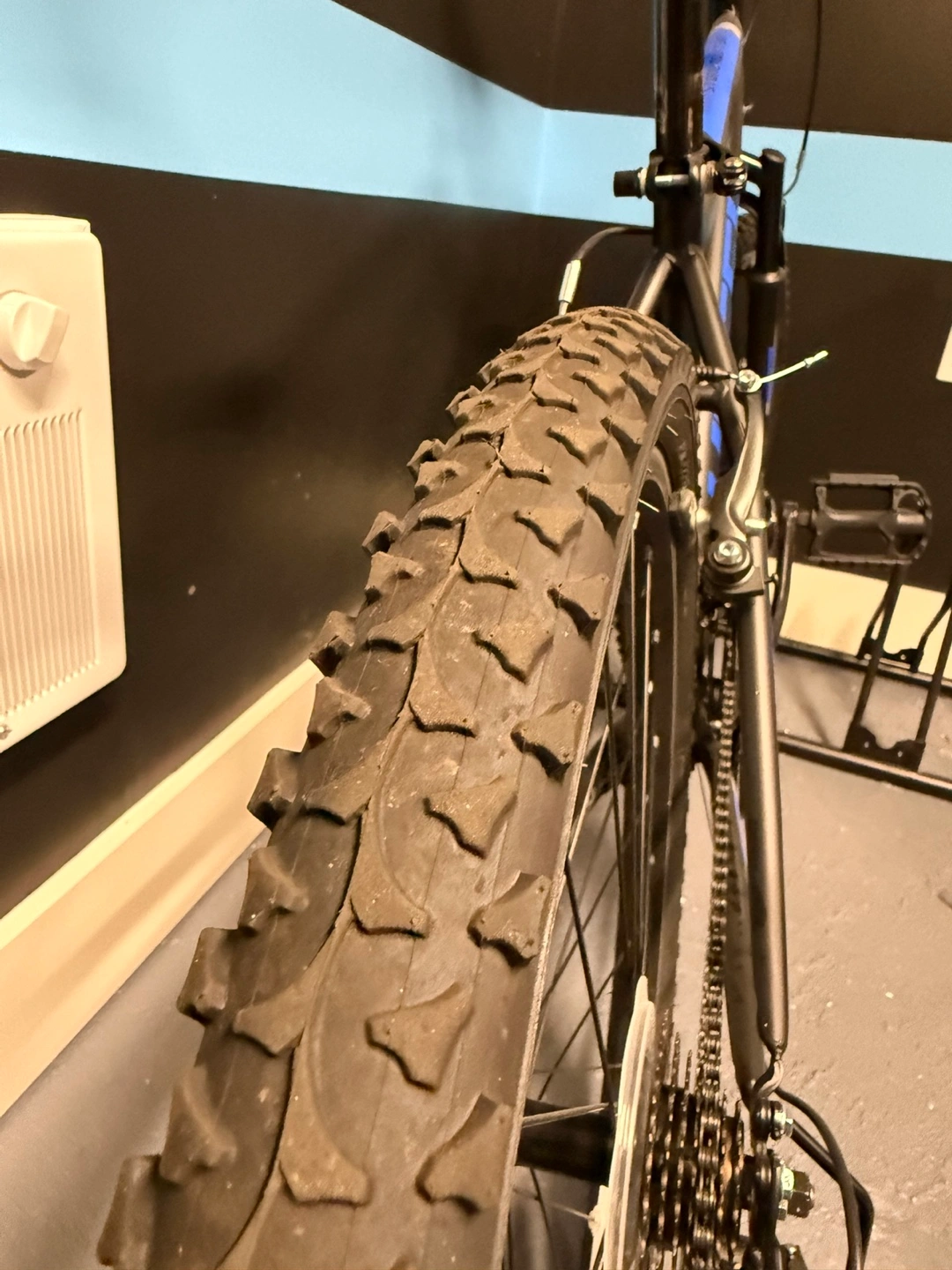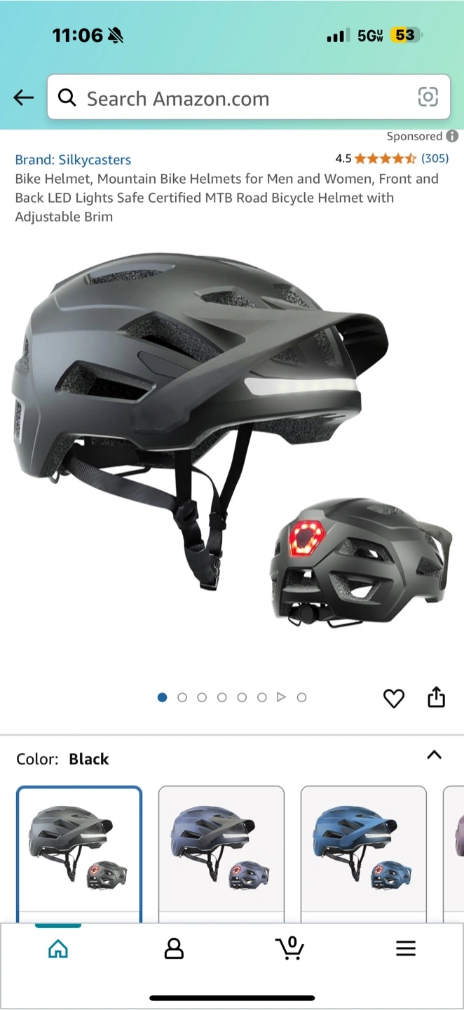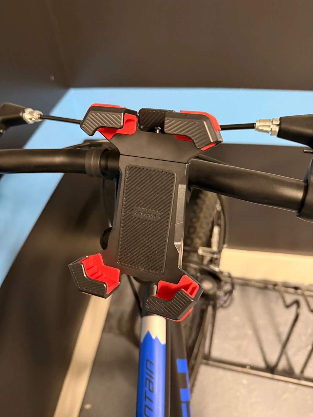 Adult mountain bike. Black frame with blue accents. Includes combination lock. Phone mount attached to handlebars and helmet with light.
