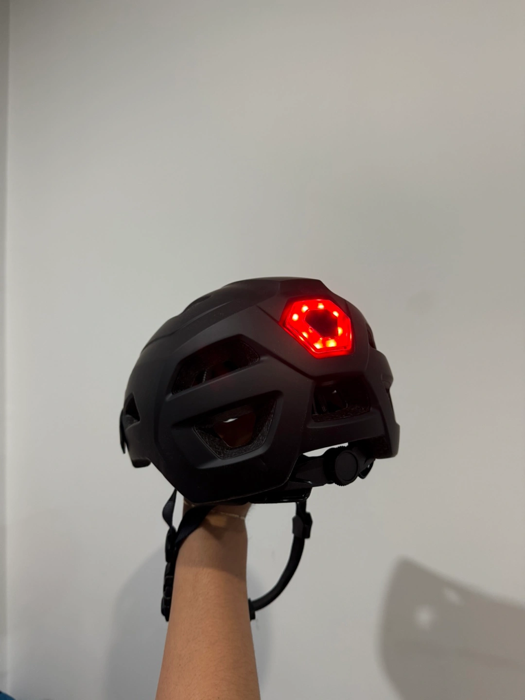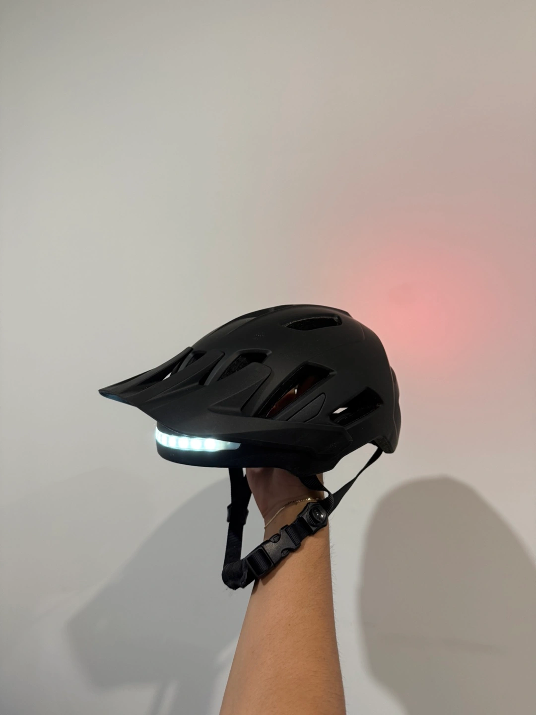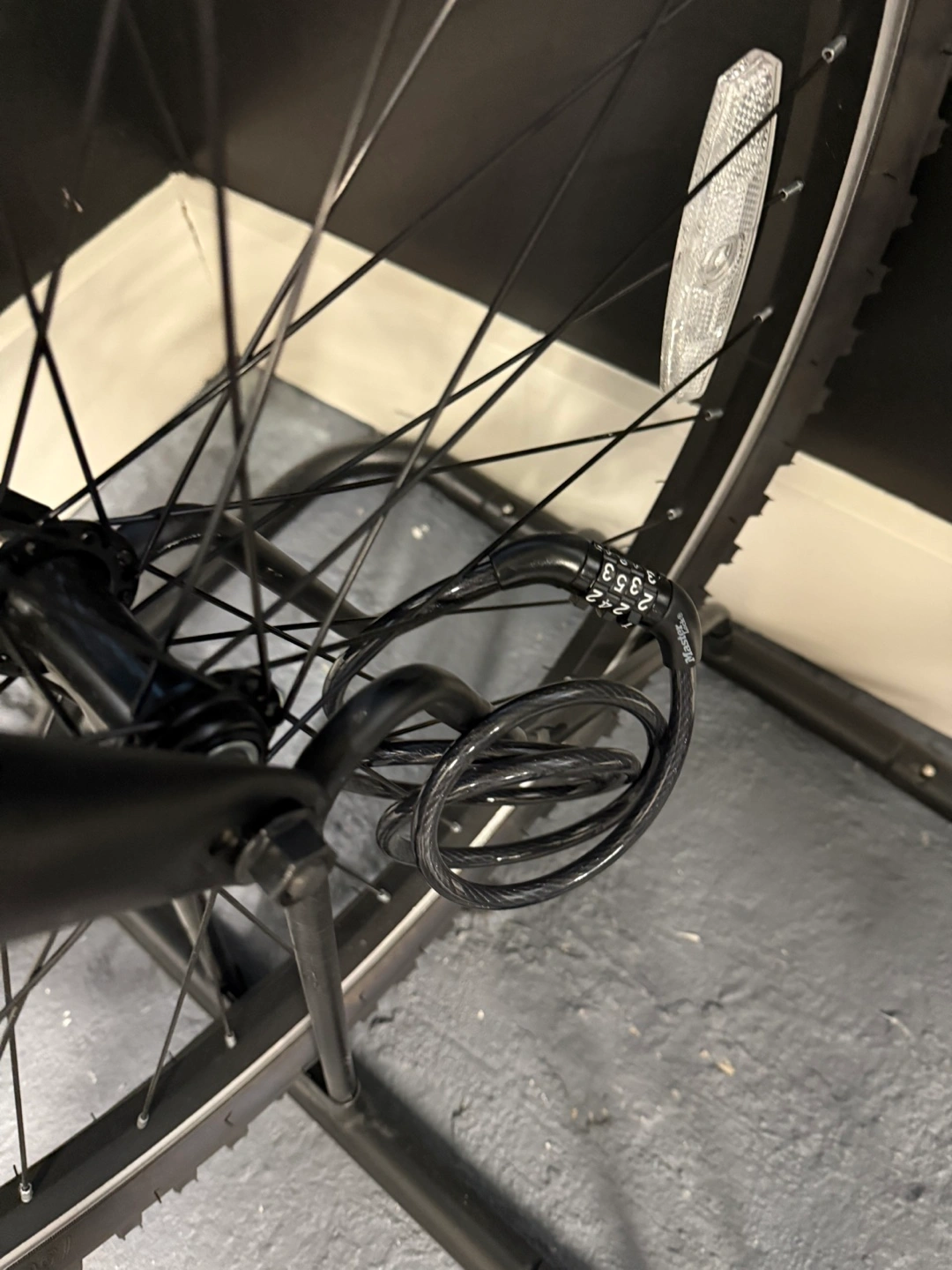 Adult mountain bike. Black frame with blue accents. Includes combination lock. Phone mount attached to handlebars and helmet with light.