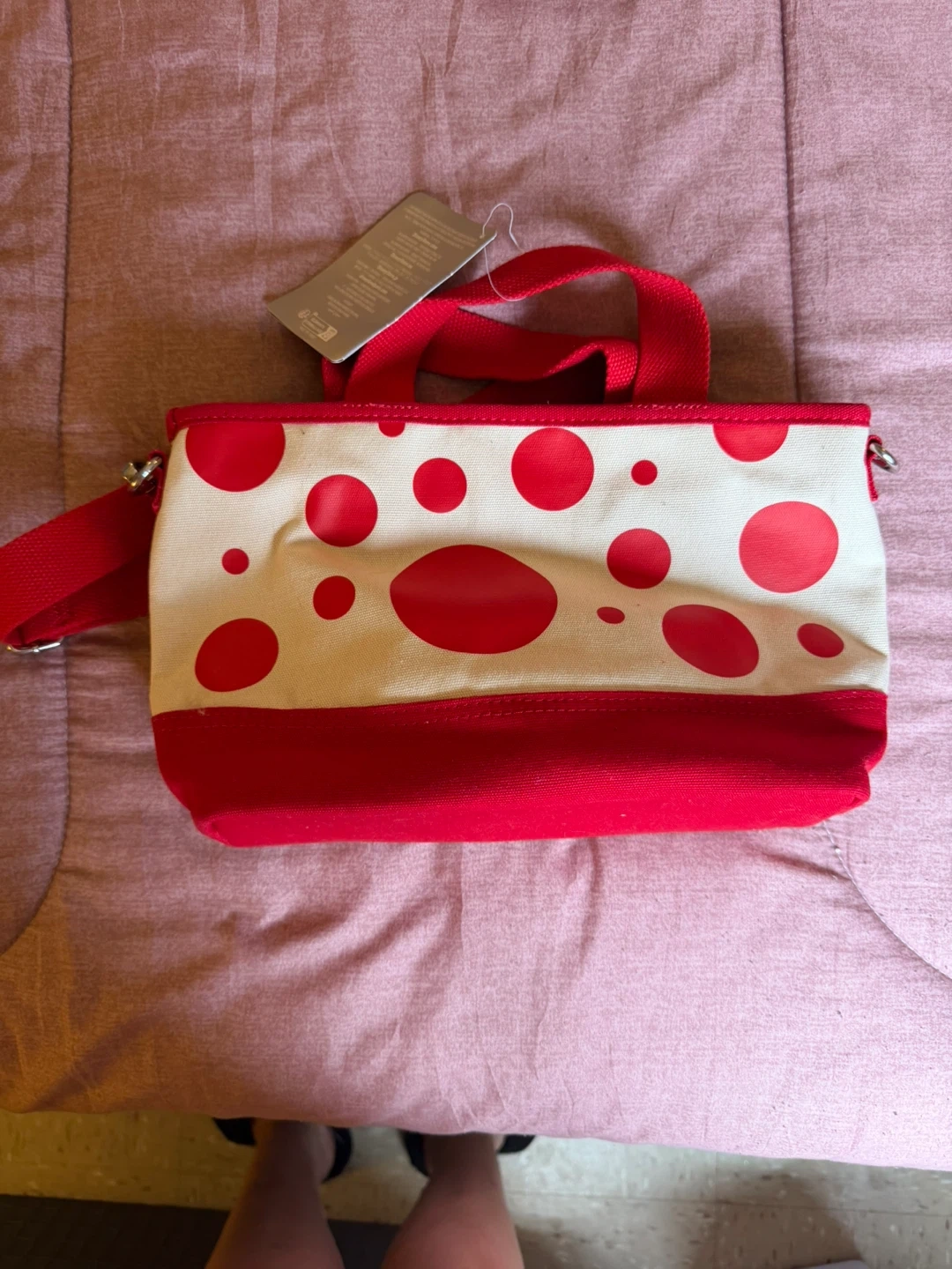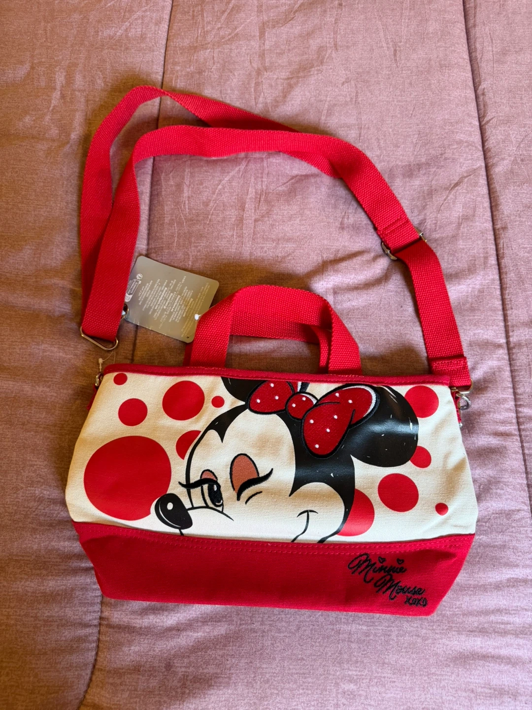This Minnie Mouse bag features a fun red polka dot design with Minnie's face on one side. It has a main zippered compartment and an adjustable crossbody strap. Canvas material.