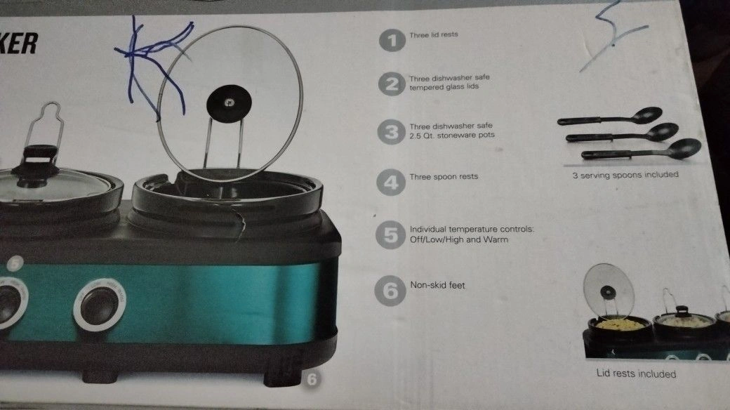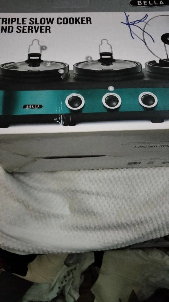 Triple slow cooker with 3 serving spoons and lid rest included. Dishwasher safe. Features: Portable, Timer, Easy clean, Grill. Color: Green. Finish: Stainless steel. Type: Electric cooktops & ovens. Brand: BELLA.