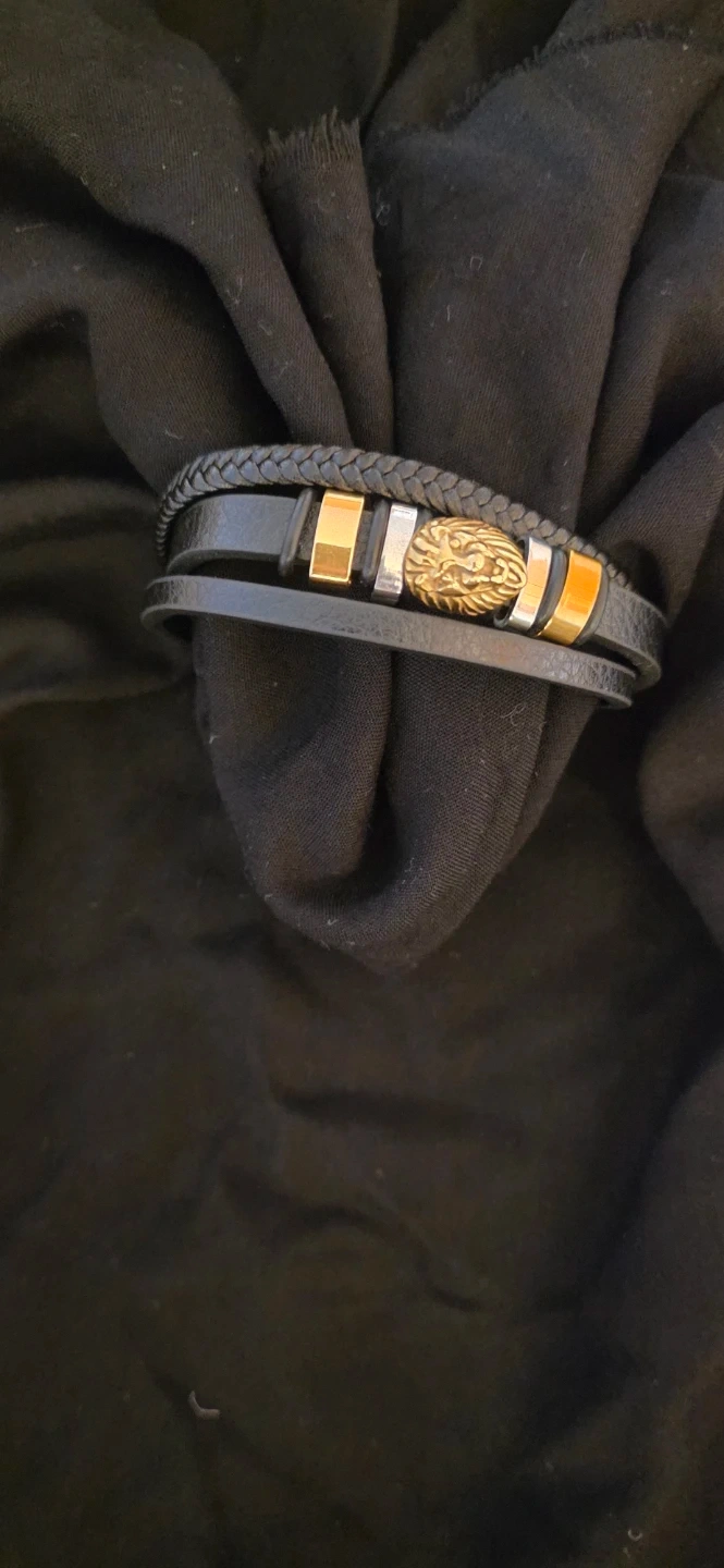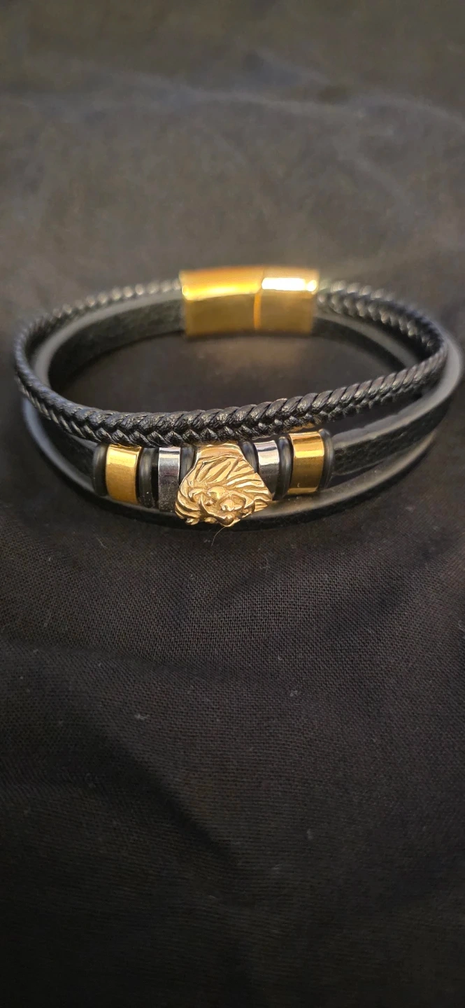 Stylish black leather bracelet featuring a distinctive lion head design with gold accents. Perfect for adding a touch of boldness to your look!