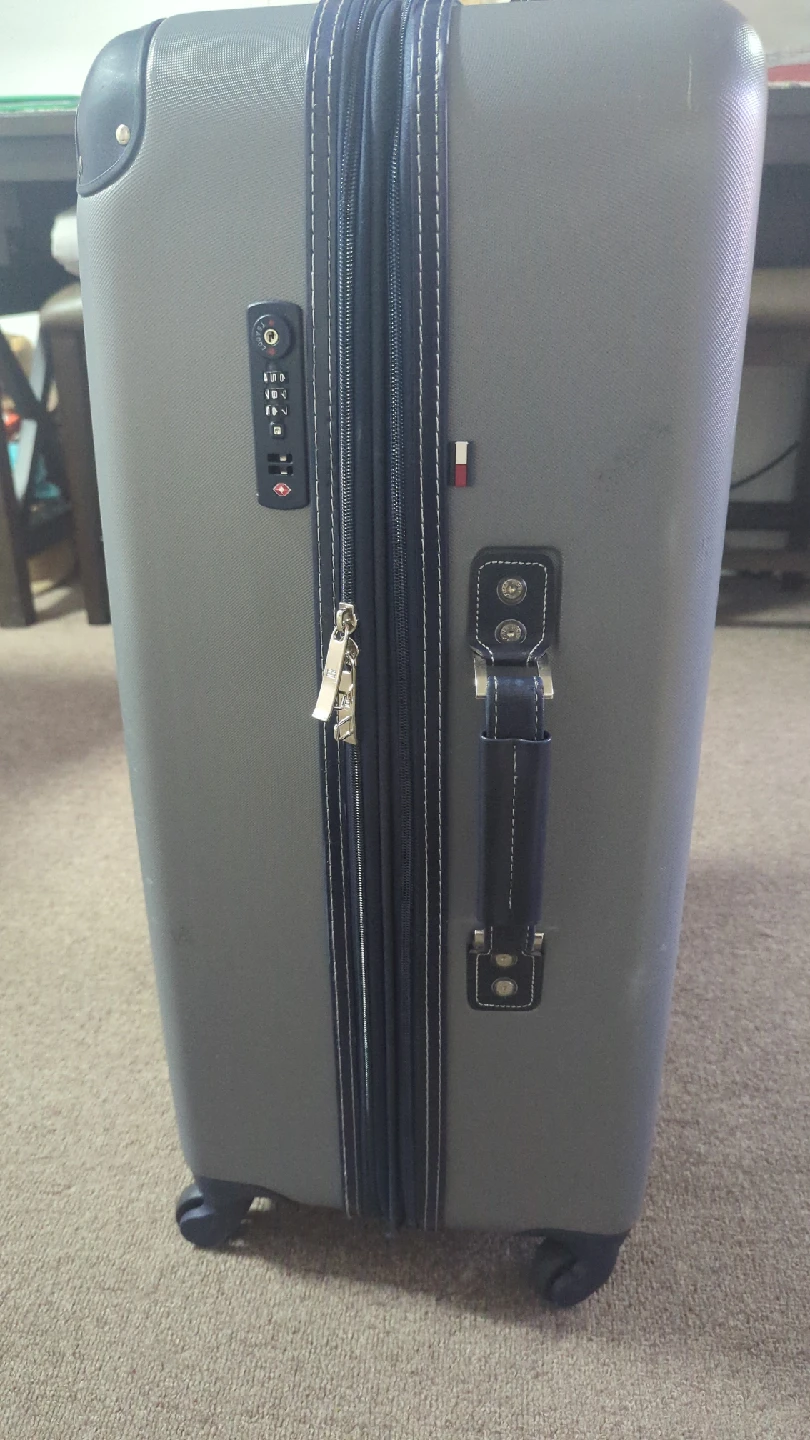 Selling a Tommy Hilfiger hardside suitcase in gray. It has a combination lock for security and a retractable handle for easy maneuvering. Perfect for travel! 25 kilograms size