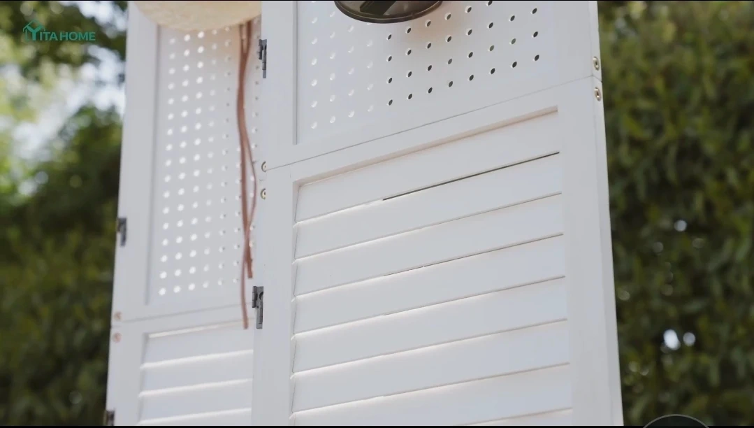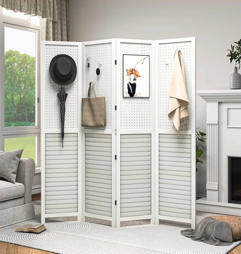 š„This 4-panel room divider screen is white and foldable. It's 63" wide and 66.9" tall. The panels are detachable, comes in 2 pieces for easy storage and delivery. It has a louvered base and a pegboard top section for hanging items.