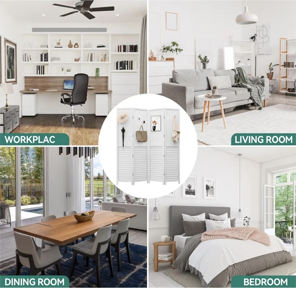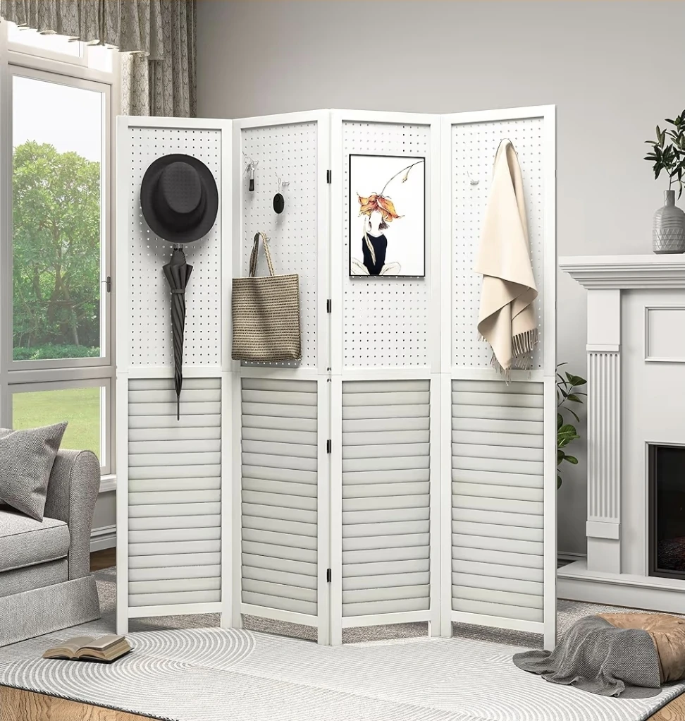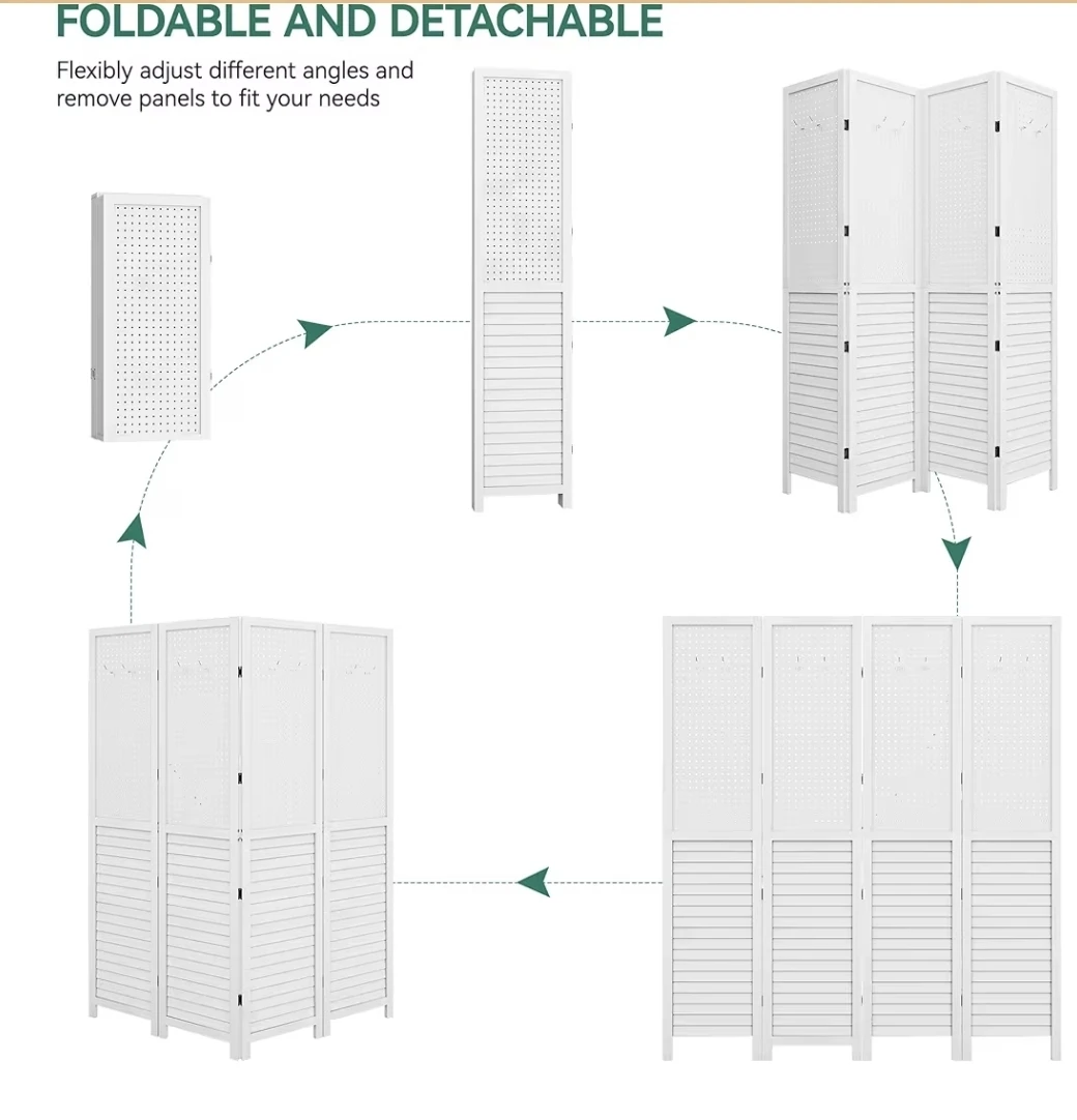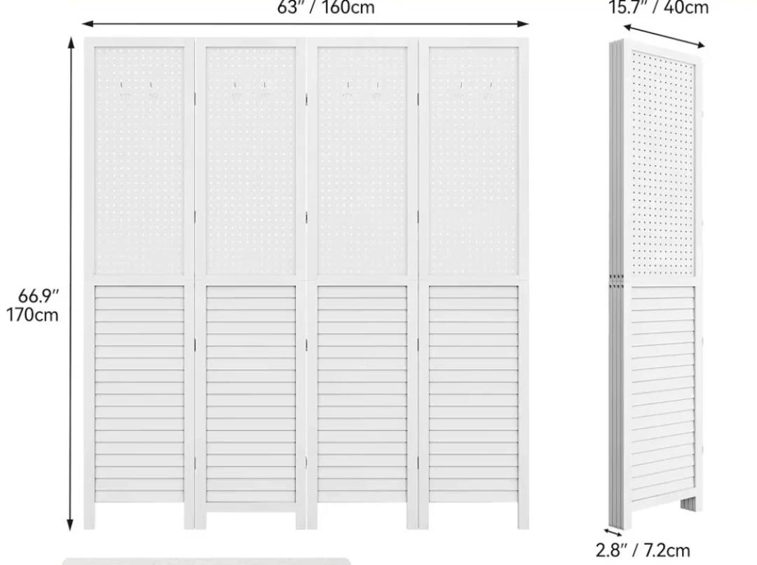 š„This 4-panel room divider screen is white and foldable. It's 63" wide and 66.9" tall. The panels are detachable, comes in 2 pieces for easy storage and delivery. It has a louvered base and a pegboard top section for hanging items.