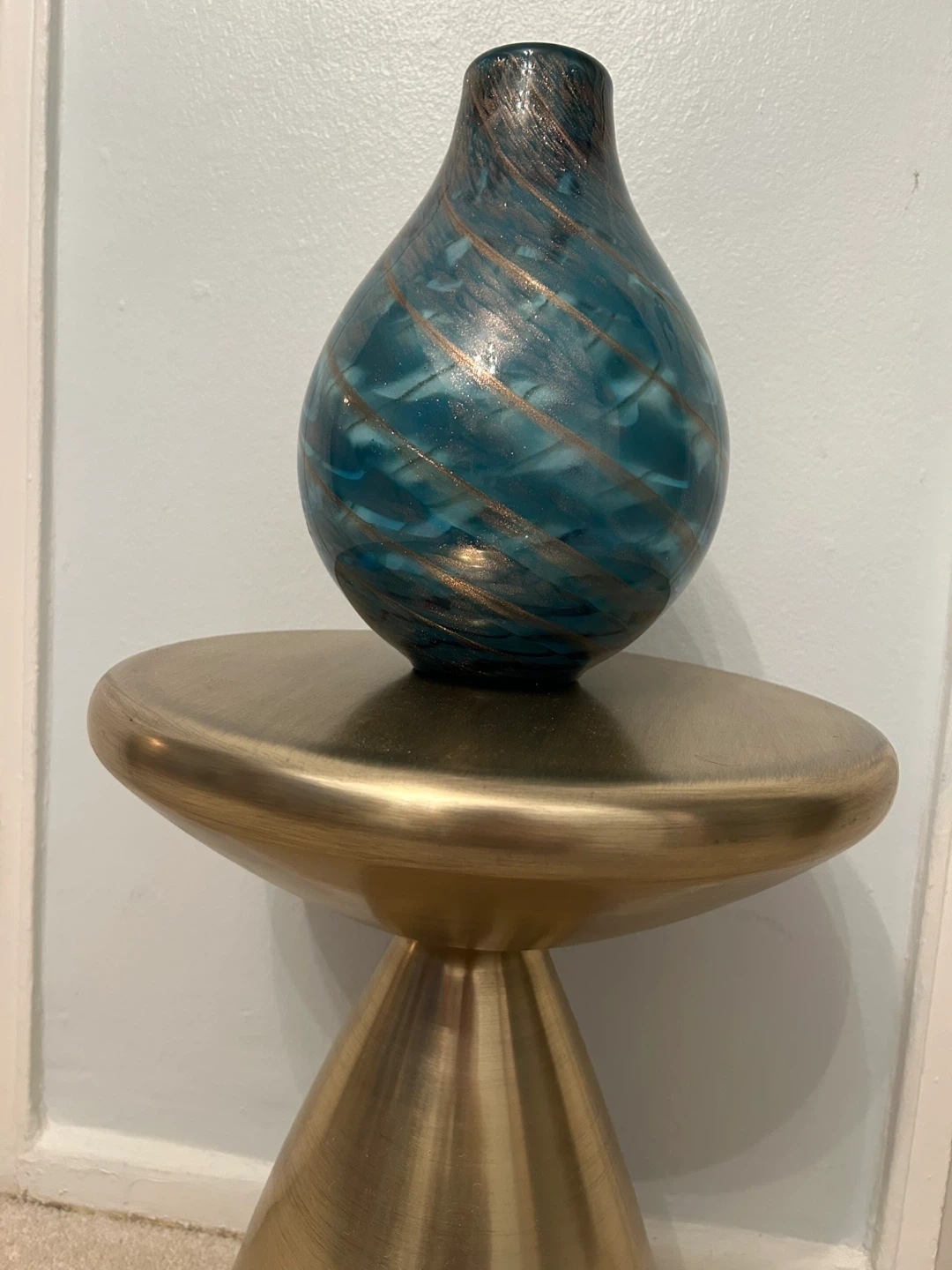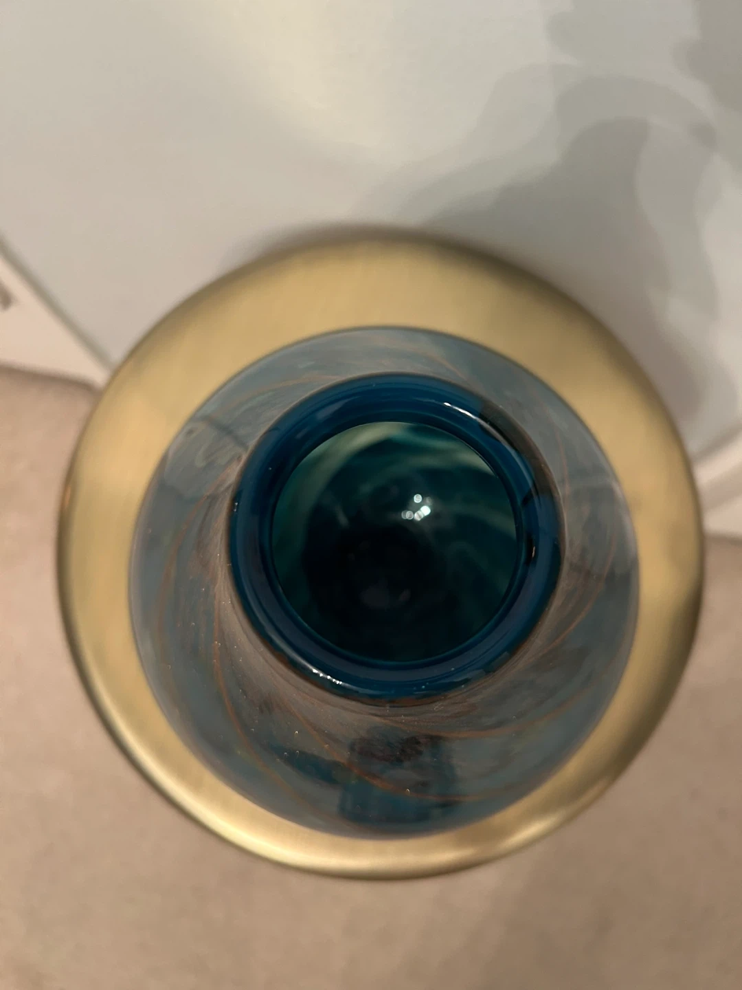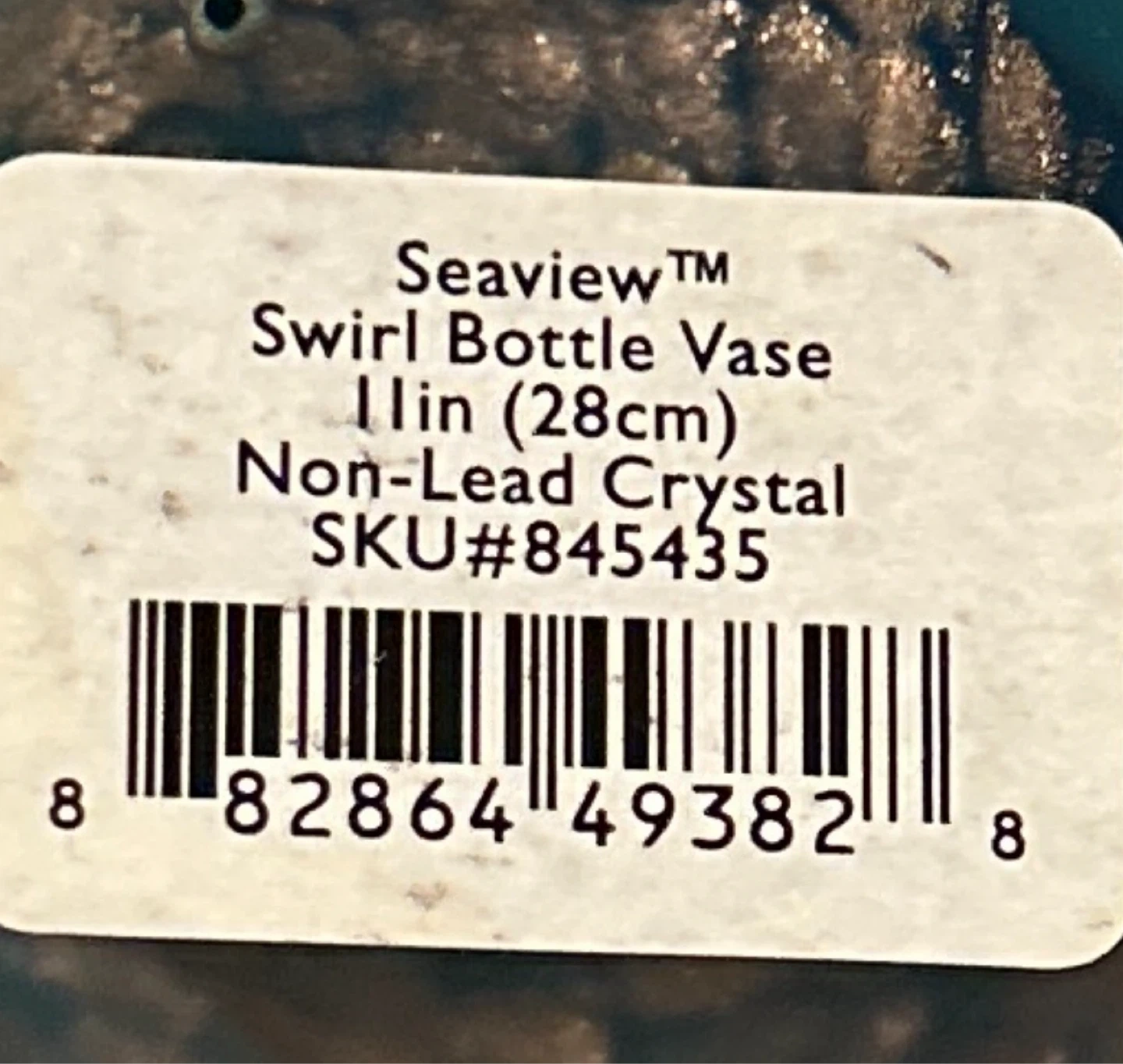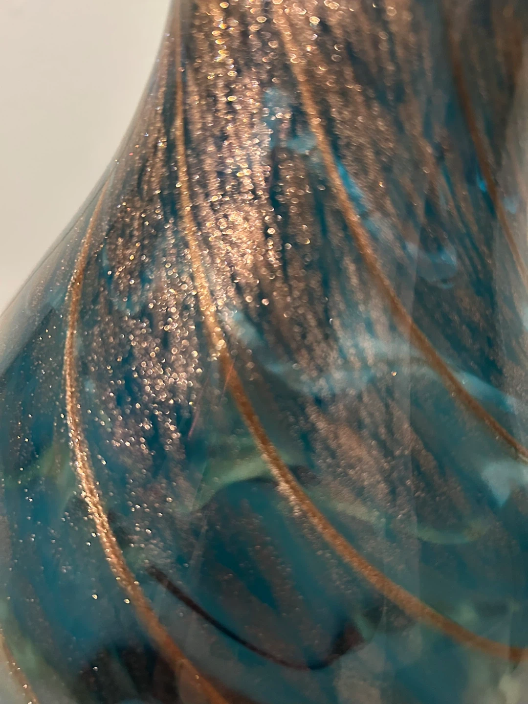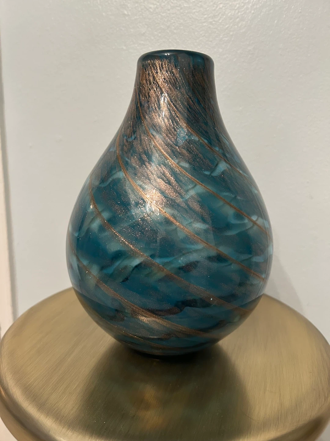 This Seaview vase is made of non-lead crystal. It features a beautiful teal swirl pattern with gold accents. 11 inches (28cm) tall.
