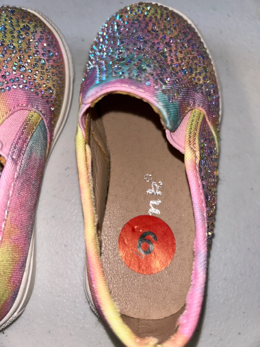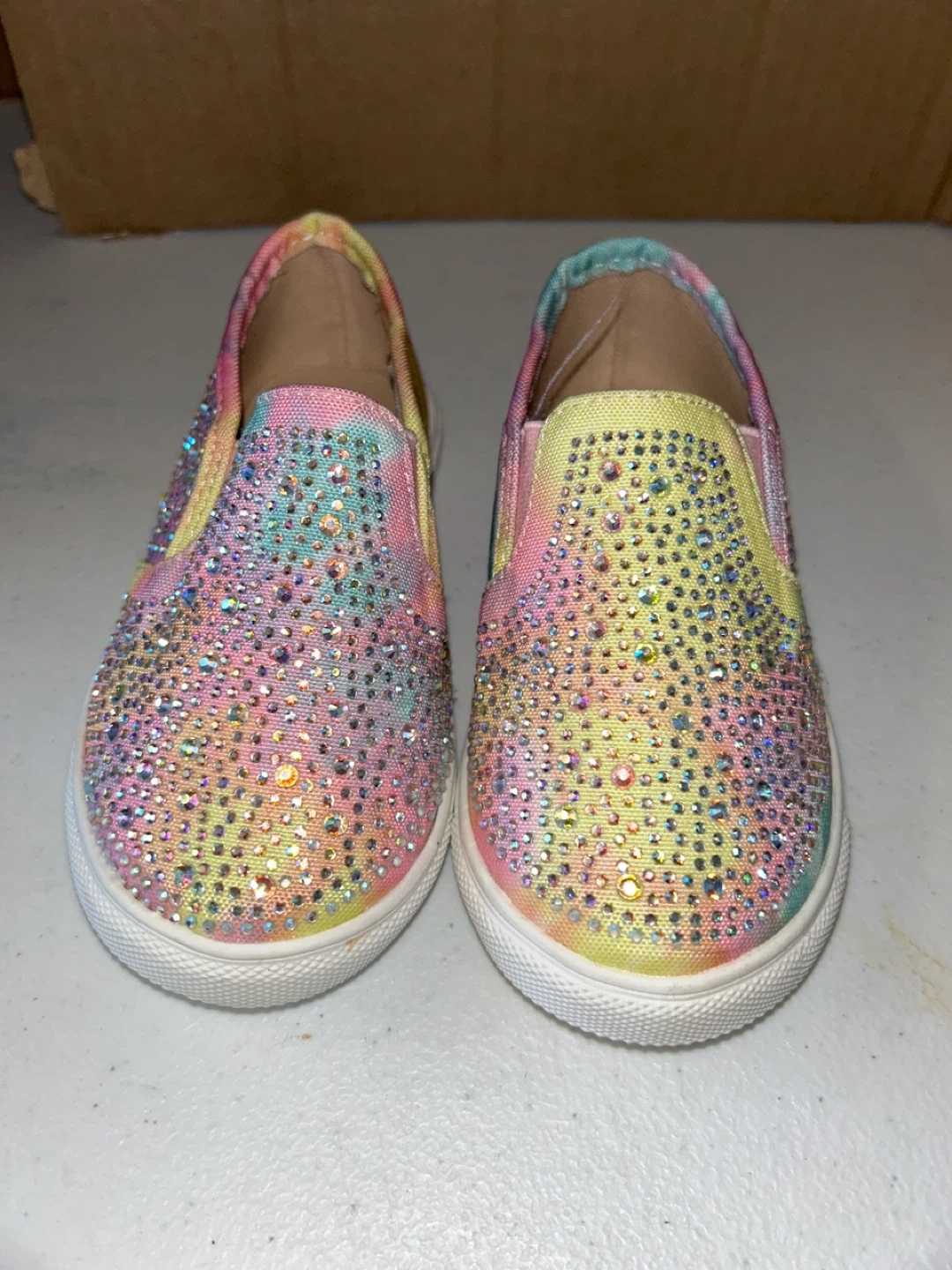 These adorable N.Y.L.A. slip-on shoes are perfect for your little one! They feature a colorful rhinestone design and are a size 6. Great for adding a touch of sparkle to any outfit!