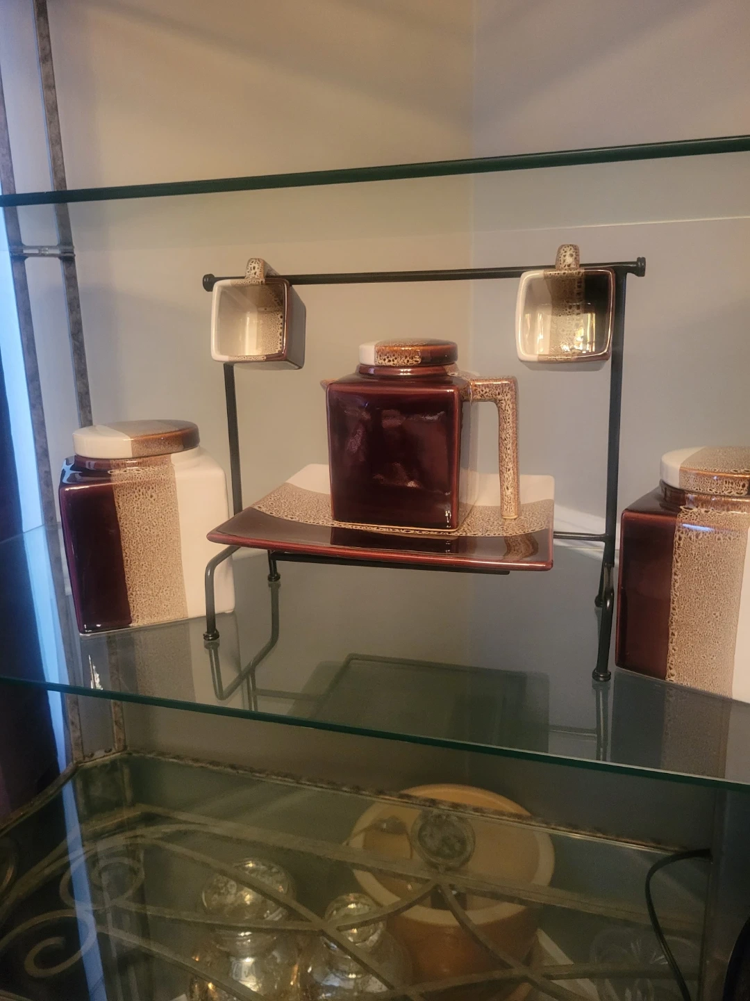 This vintage ceramic tea set features a deep brown teapot with a decorative lid and handle. It comes with two storage canisters adorned with a contrasting cream and brown speckled pattern. Two small decorative cups are also included, adding to its charm. This set's unique design makes it a lovely addition to any kitchen or display shelf!
