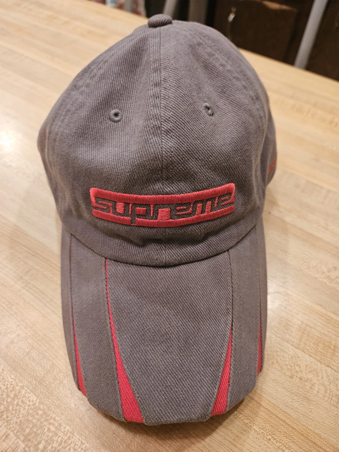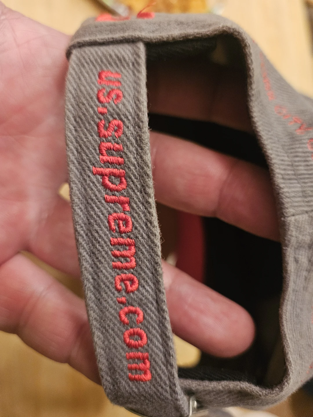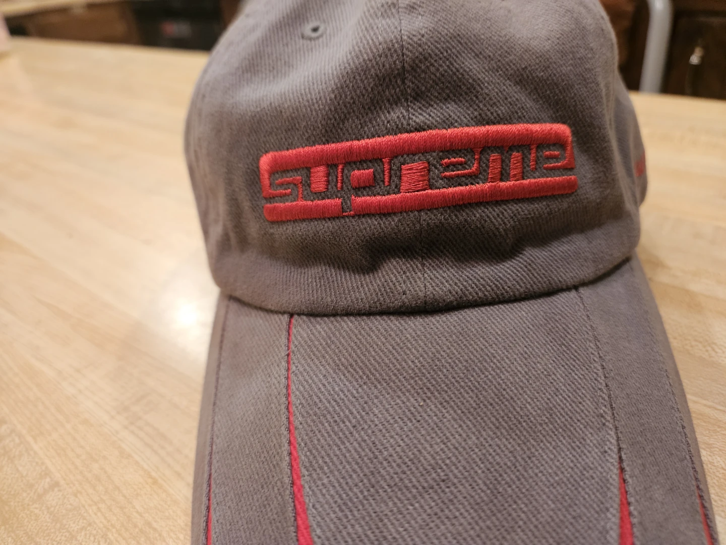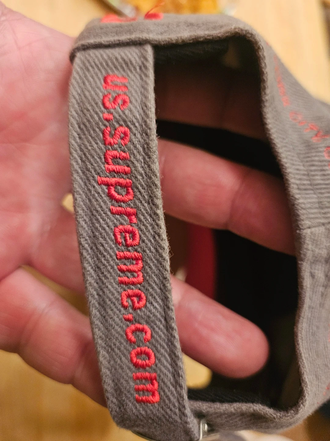 Gray baseball cap with red Supreme logo on the front. Features red stitching accents and 'Official Partners' embroidered on the side. Adjustable strap with 'us.supreme.com' embroidered. Original price $135.00 at web site.
