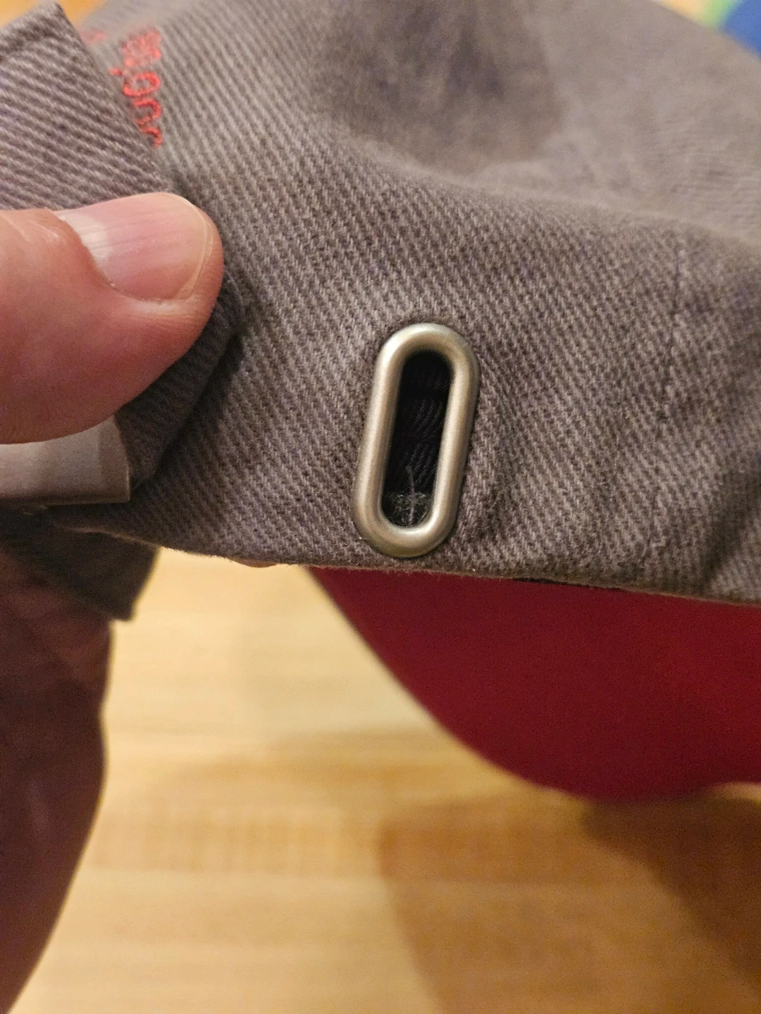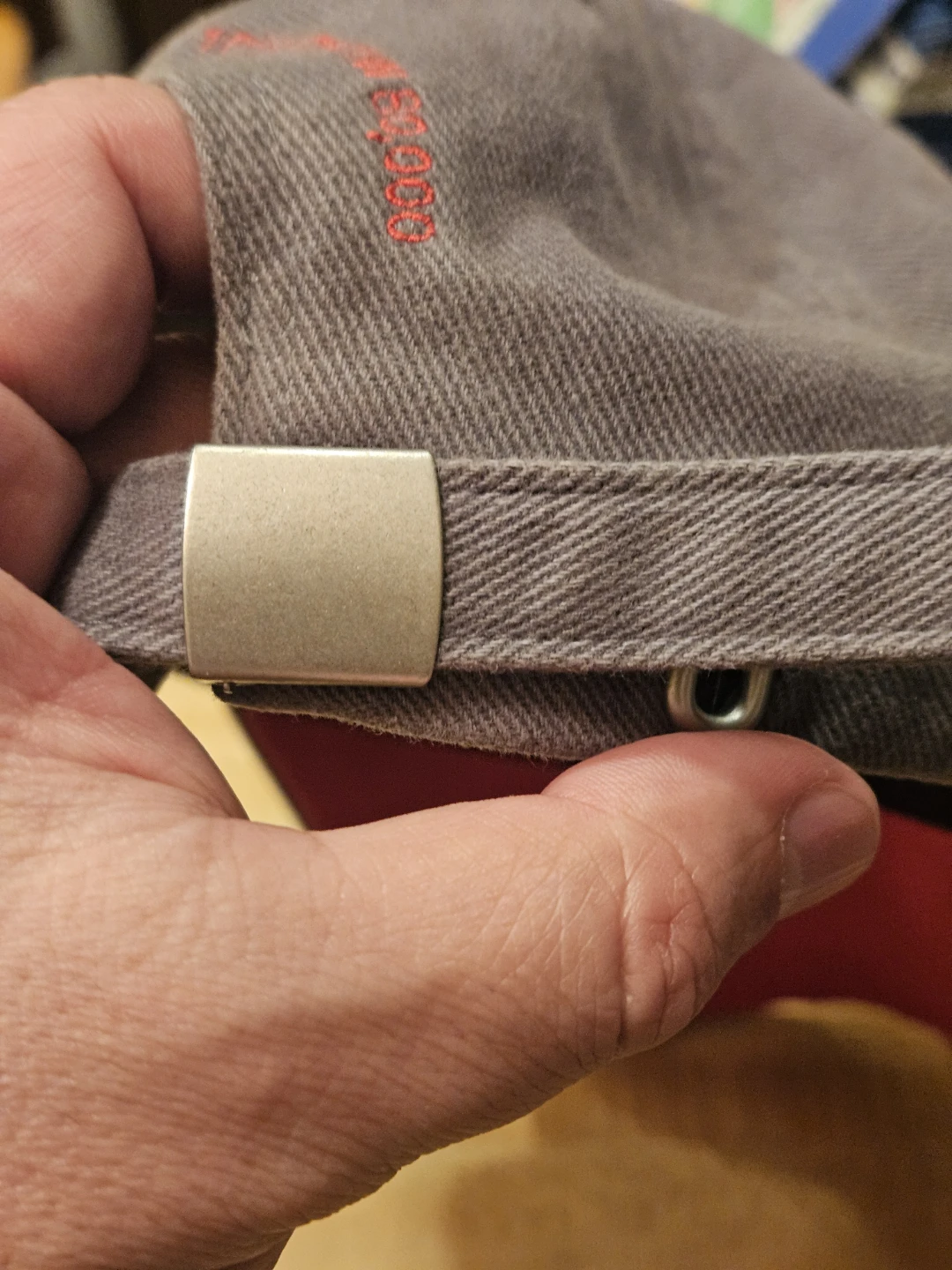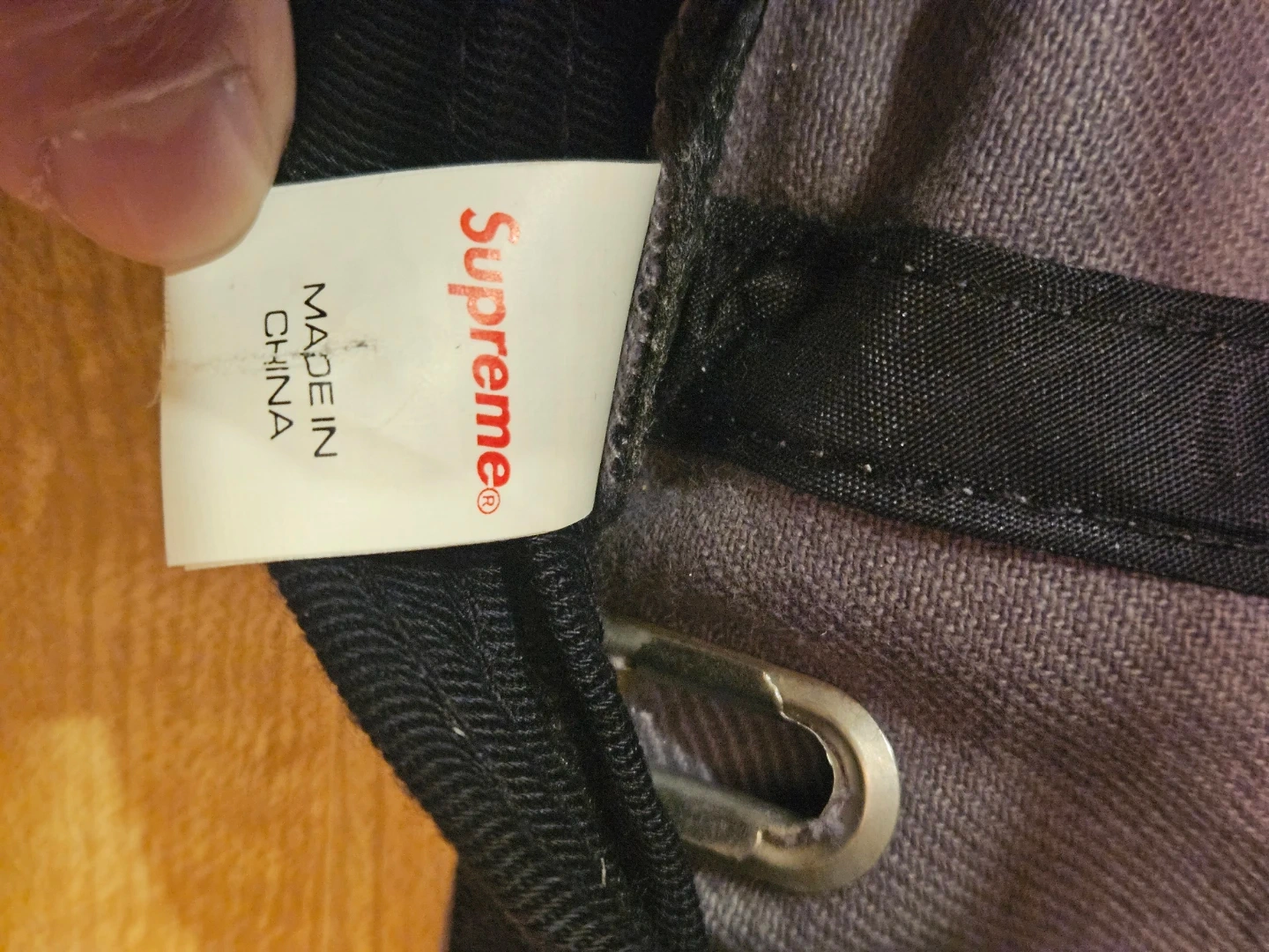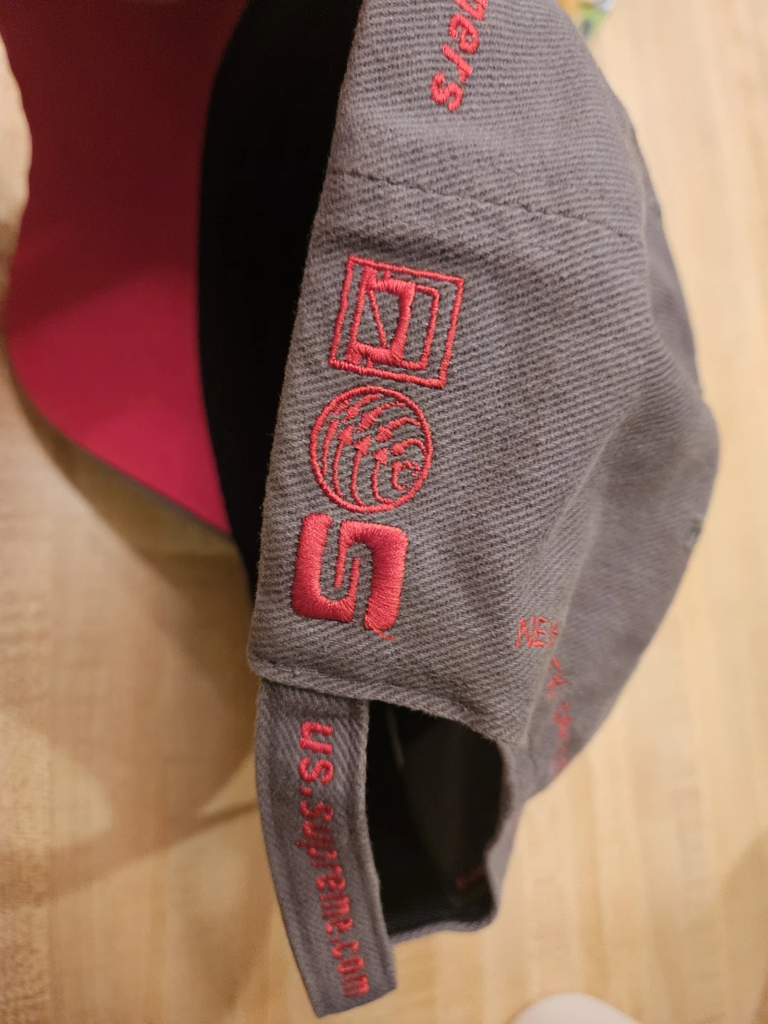 Gray baseball cap with red Supreme logo on the front. Features red stitching accents and 'Official Partners' embroidered on the side. Adjustable strap with 'us.supreme.com' embroidered. Original price $135.00 at web site.