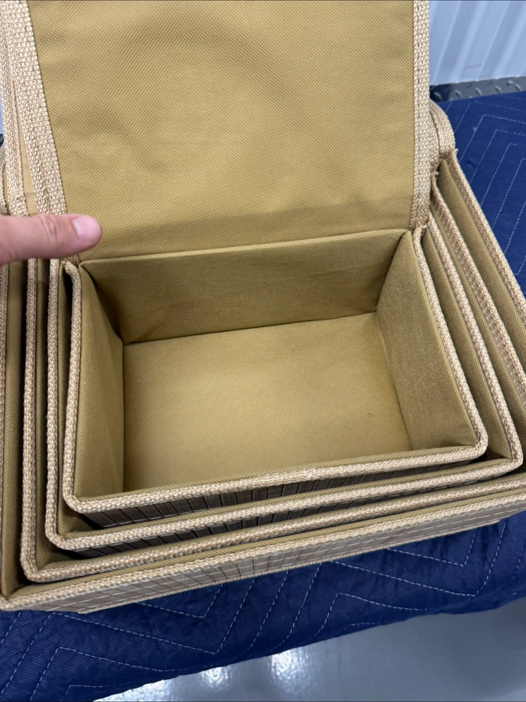 Here's a set of four nesting storage bins, perfect for organizing your space. They're a nice tan color and in great condition. They're great for storing anything from clothes to toys to household items new new