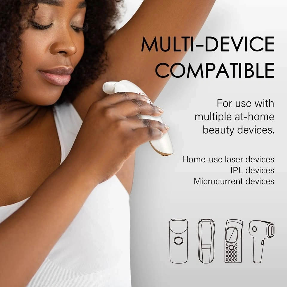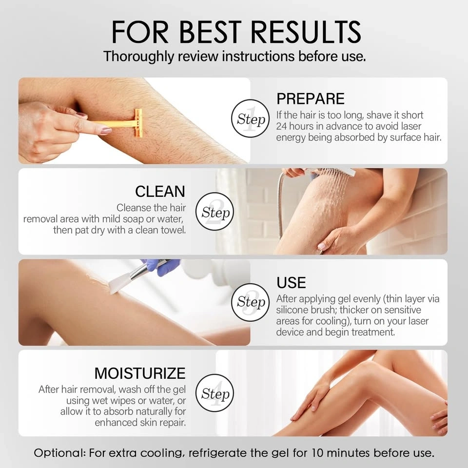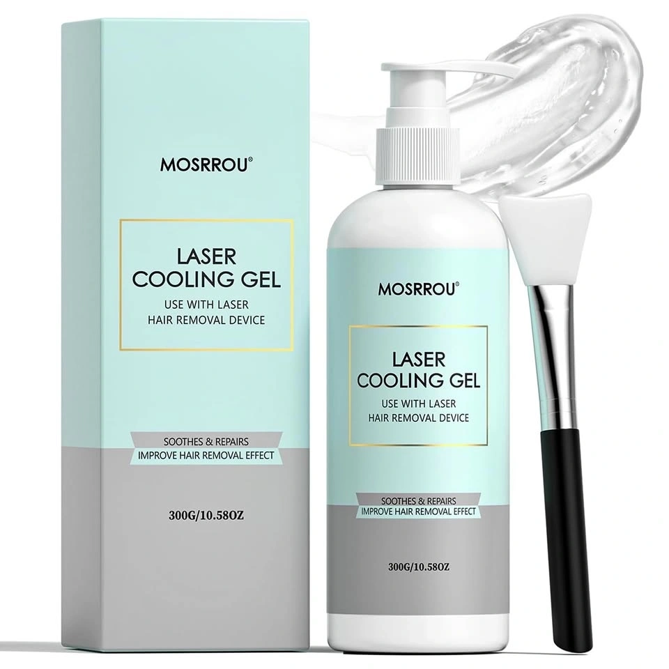 Cooling MOSRROU Laser Cooling Gel. Perfect partner for your home laser hair removal device. This gel helps lower skin temp to avoid burns, soothes redness and calms irritation after hair removal. Transparent and fragrance-free formula for even laser energy distribution. Enhances laser transmission for precise follicle targeting. Has great ingredients like Sodium Hyaluronate, Ceramide NP, Aloe Vera Extract, and Centella Asiatica Extract for long-lasting soothing. Comes in a 300G (10.58OZ) bottle with a pump and includes an application brush. Multi-device compatible, works with home-use laser, IPL, and microcurrent devices.