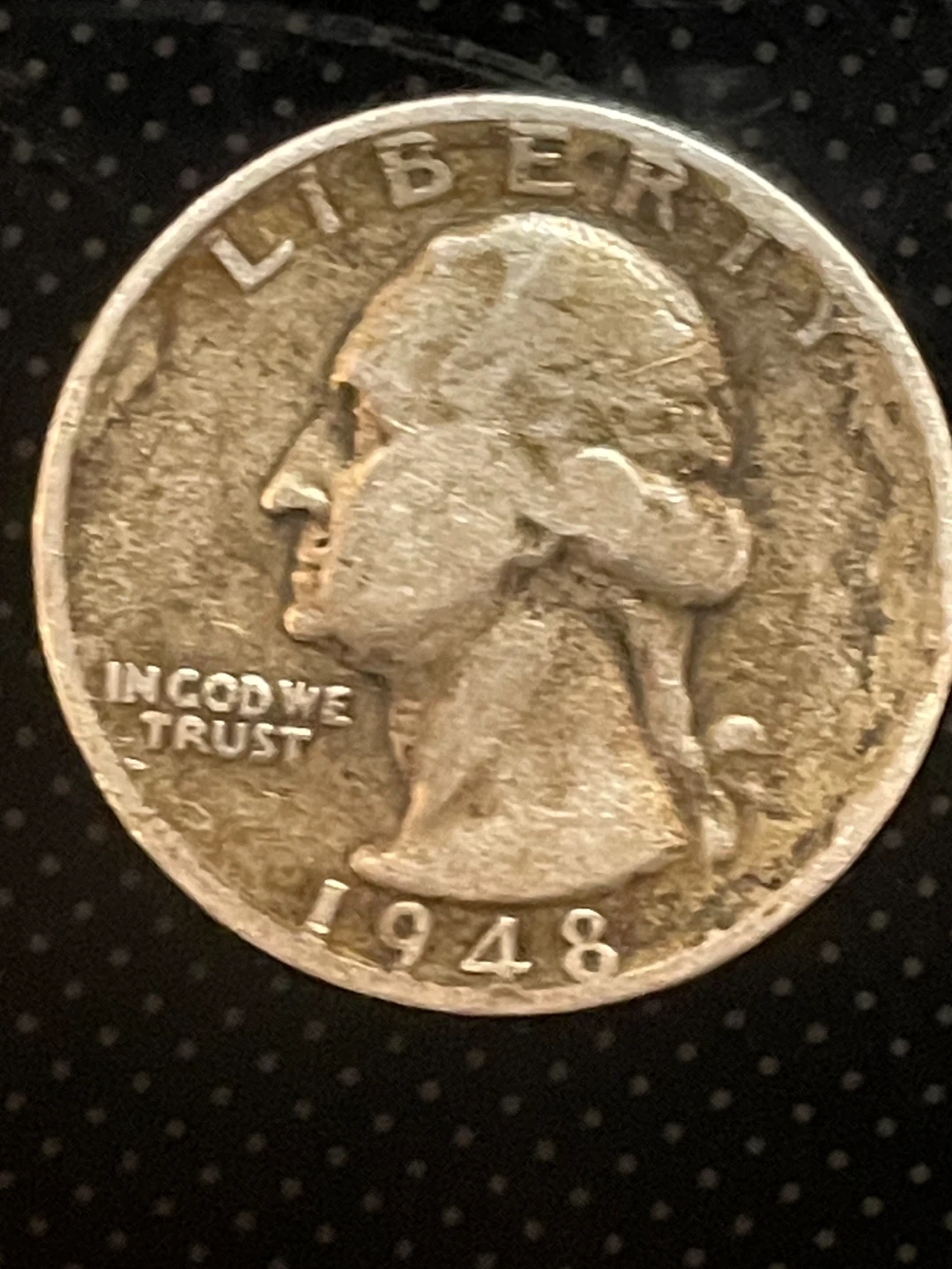 This is a 1948 quarter dollar coin featuring George Washington on the obverse and an eagle on the reverse. It reads "United States of America," "E Pluribus Unum," and "Quarter Dollar." The coin is made of silver. This is a nice piece for any coin collector!