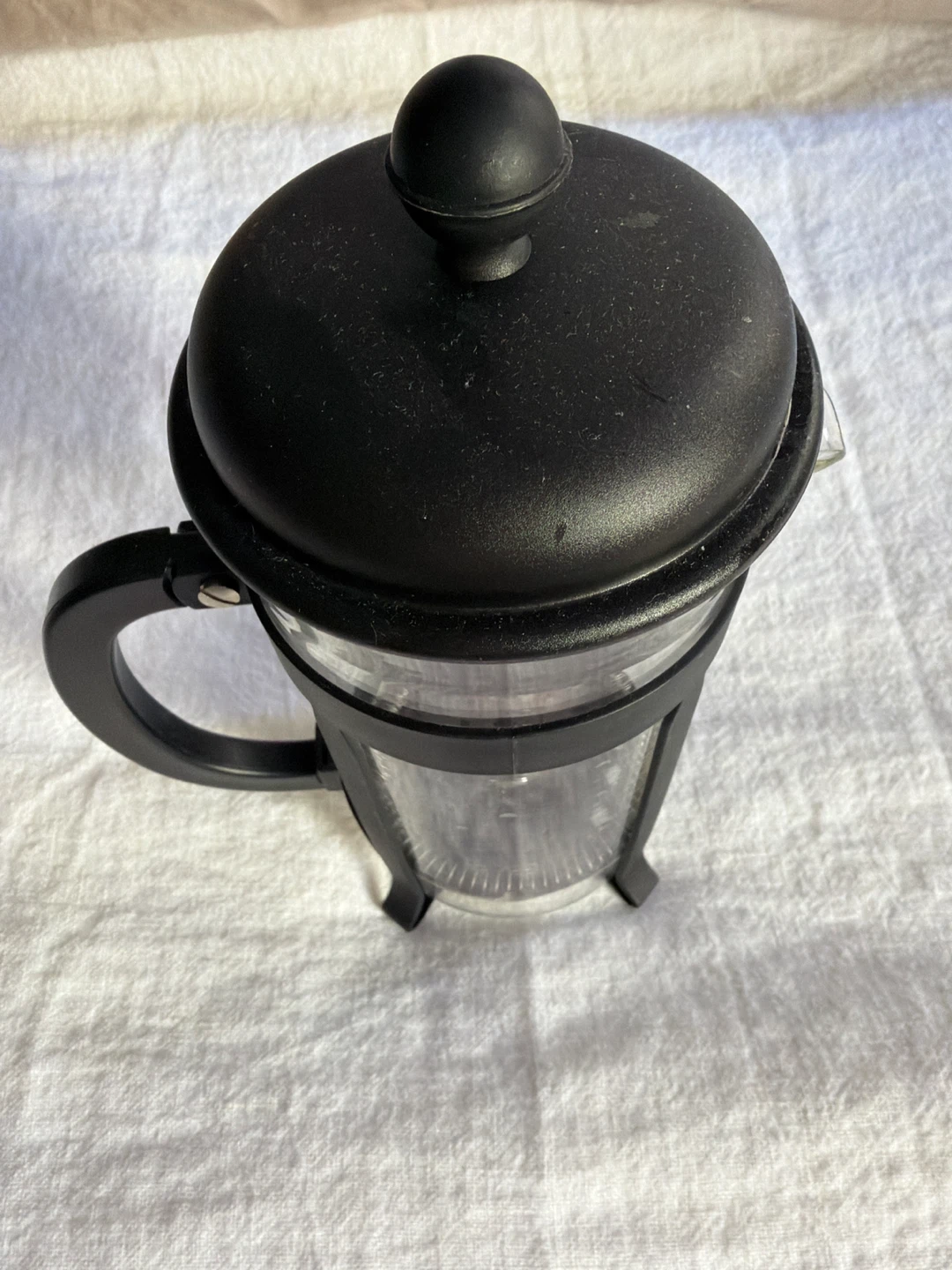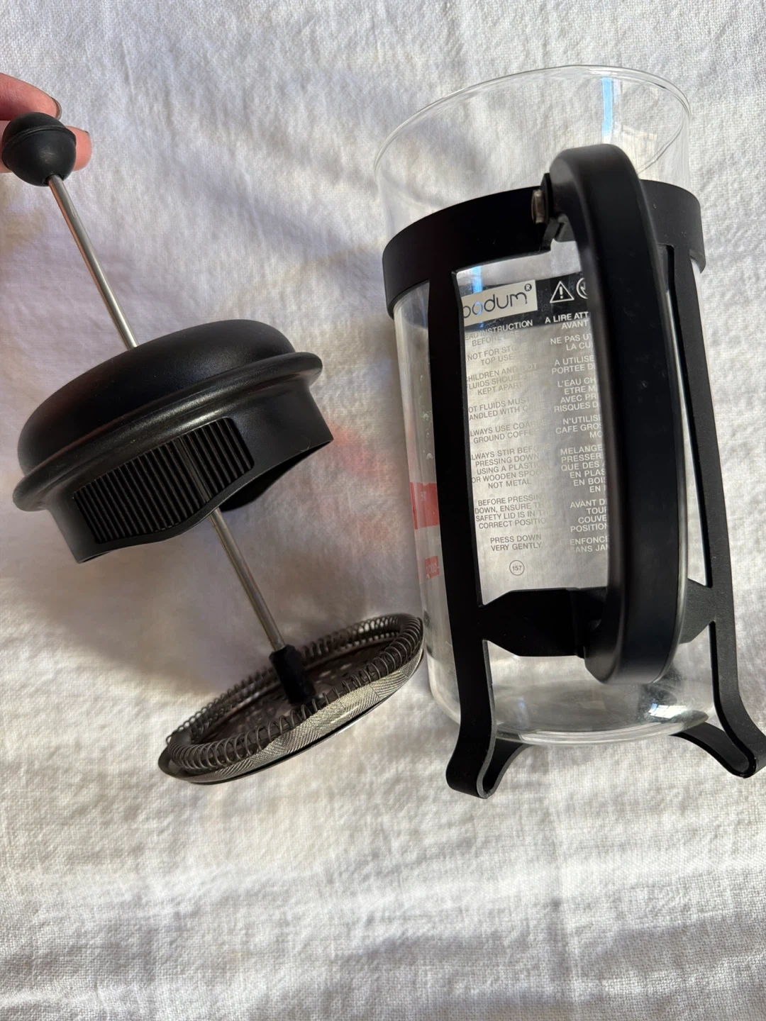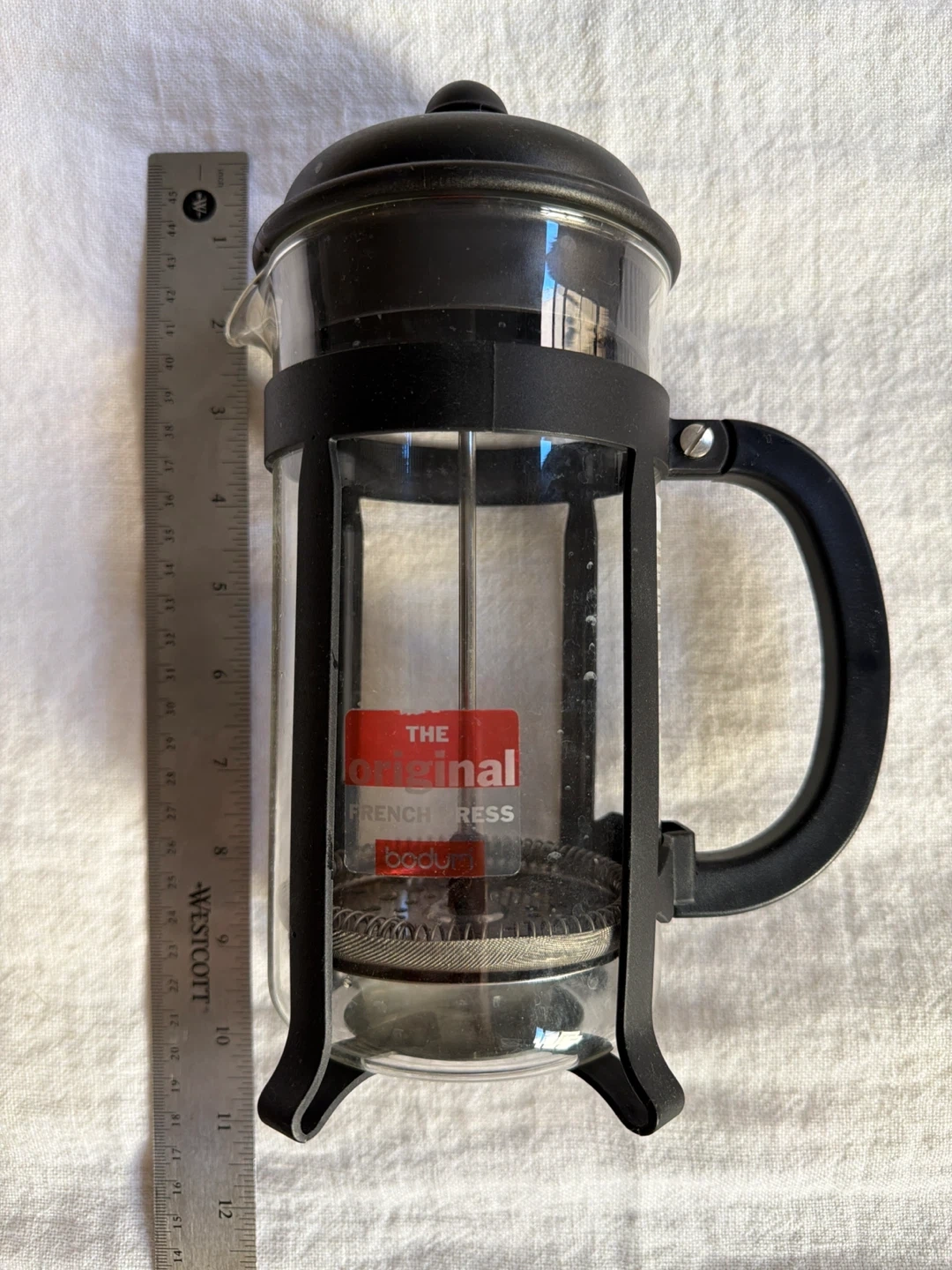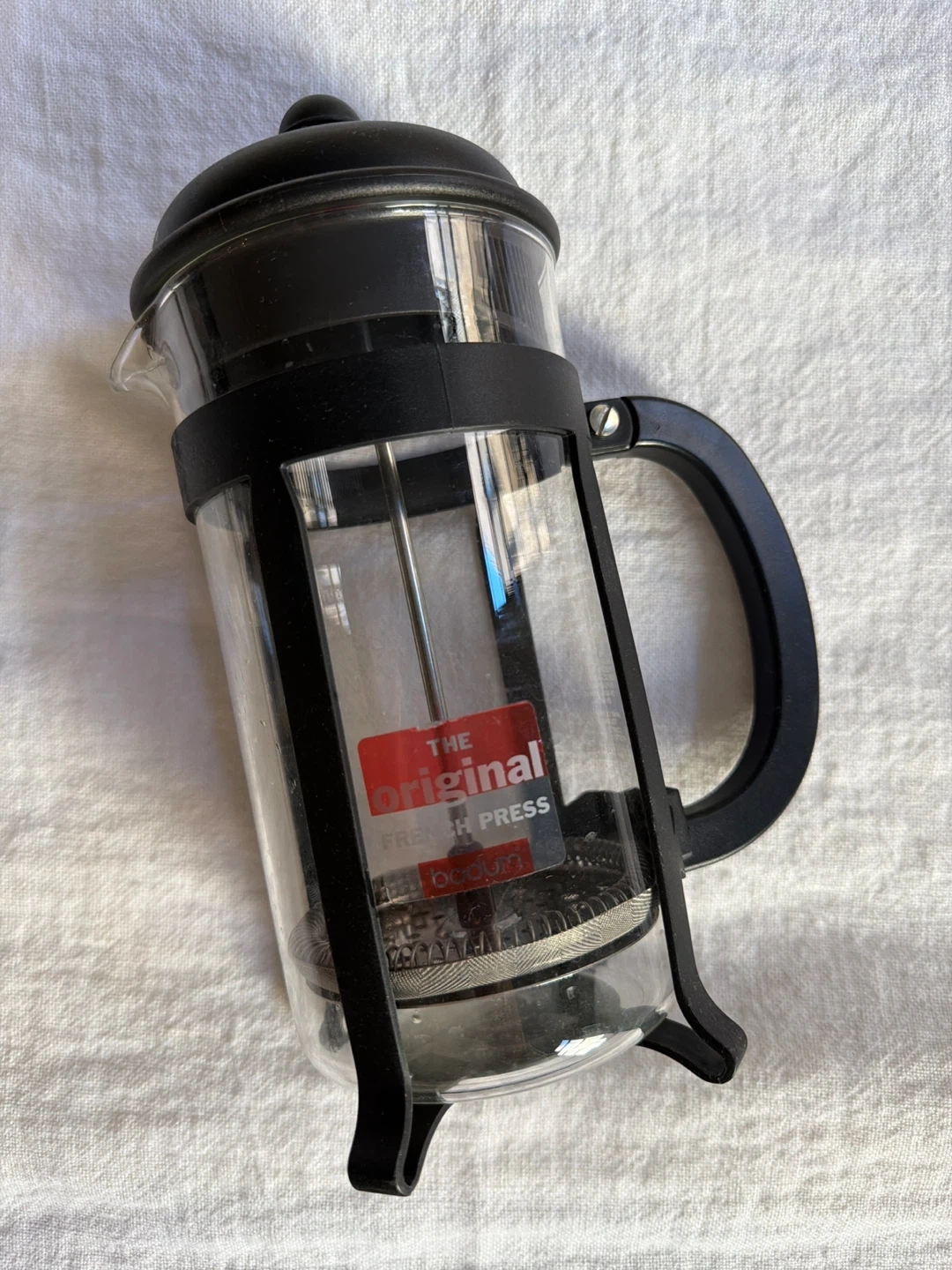 This is the original Bodum French press coffee maker. It's made with a durable glass carafe and a black plastic frame and handle. Includes the plunger assembly with a mesh filter.