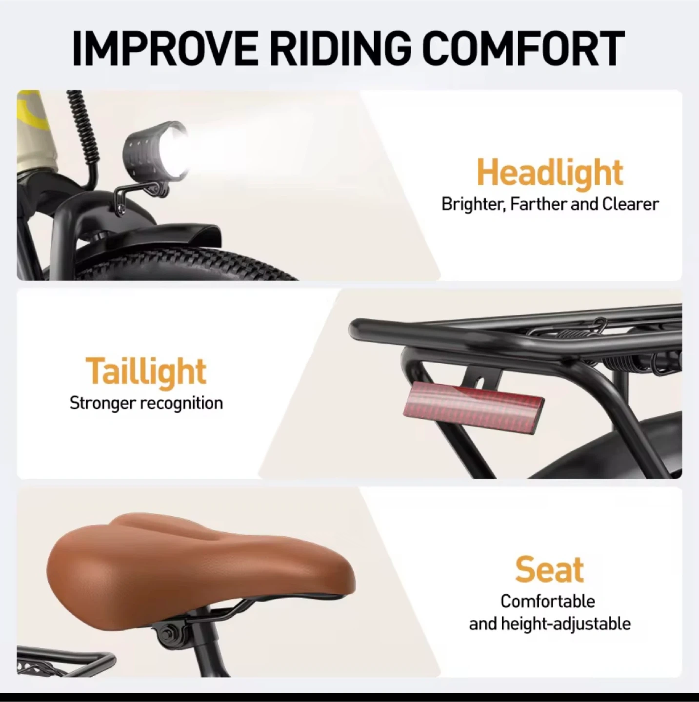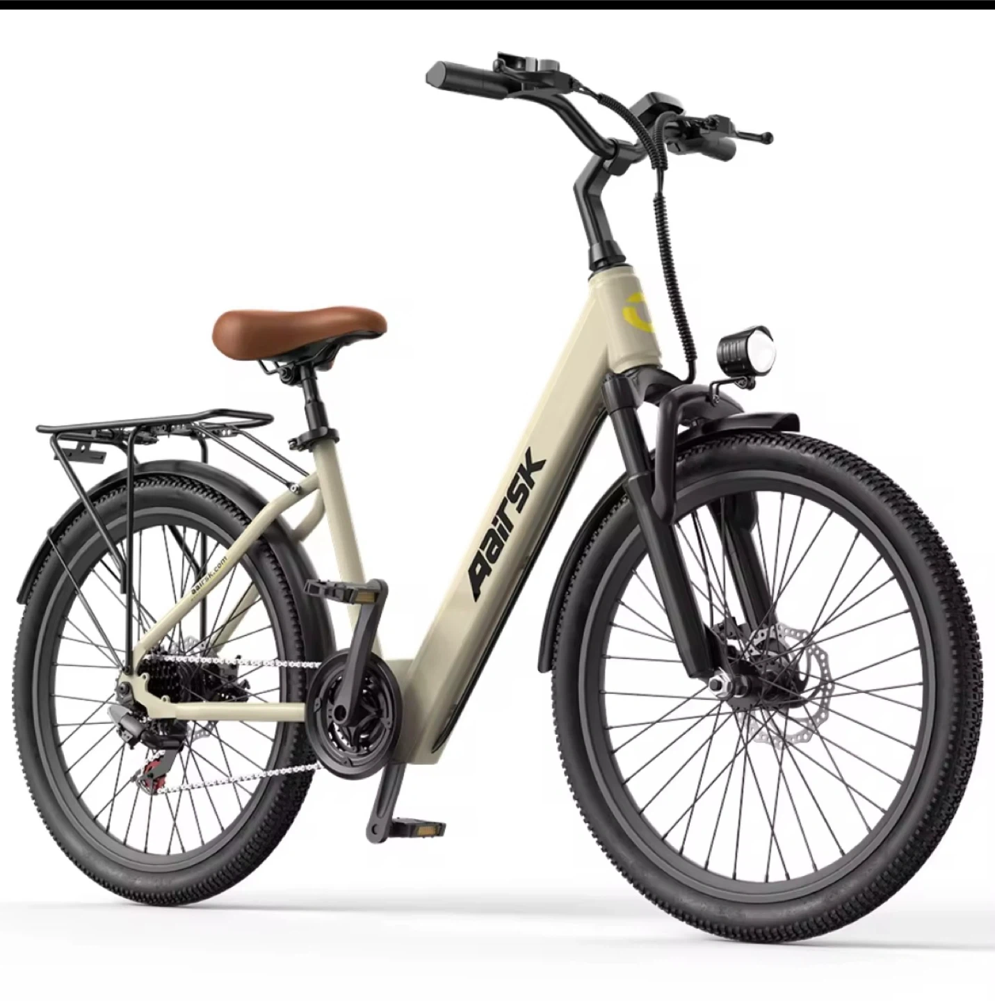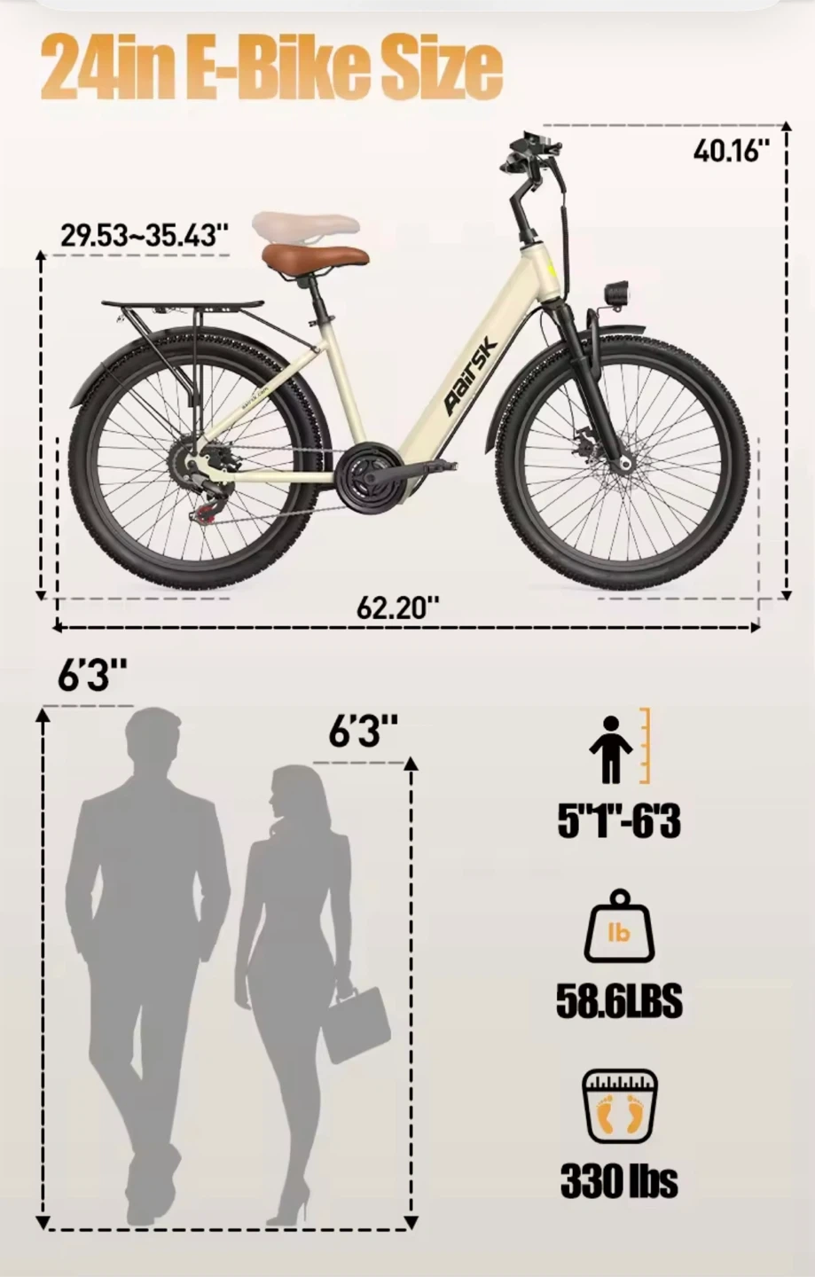 This is an AATSBK electric bike with a 36V 468WH Li-ion battery. It has a 24-inch wheel size and offers three riding modes. Features include a brighter headlight and a comfortable, height-adjustable seat. The pedal-assist range is 25-40 miles.