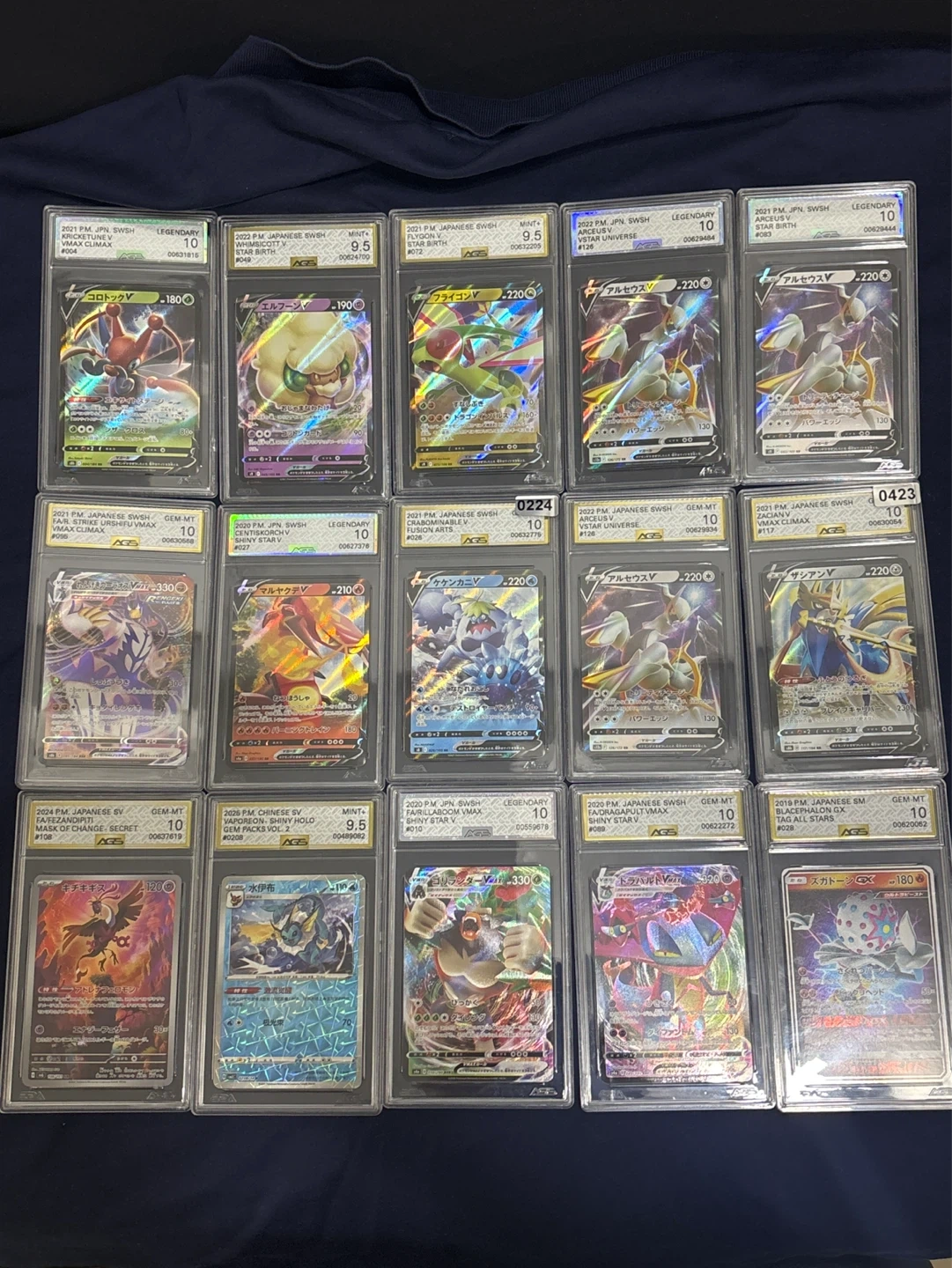 Collection of graded Pokemon trading cards from various sets. Features include V, VMAX, VSTAR, and GX cards, with grades ranging from 9.5 to 10. A great addition for any serious collector!