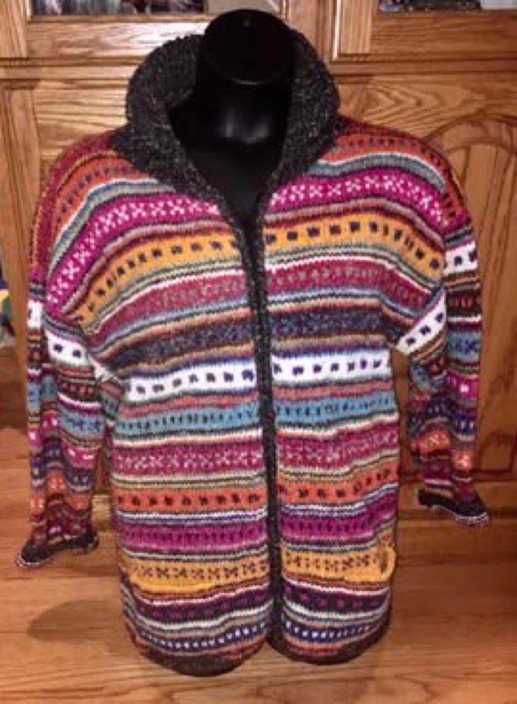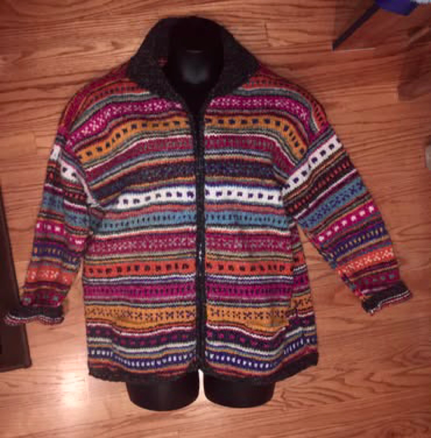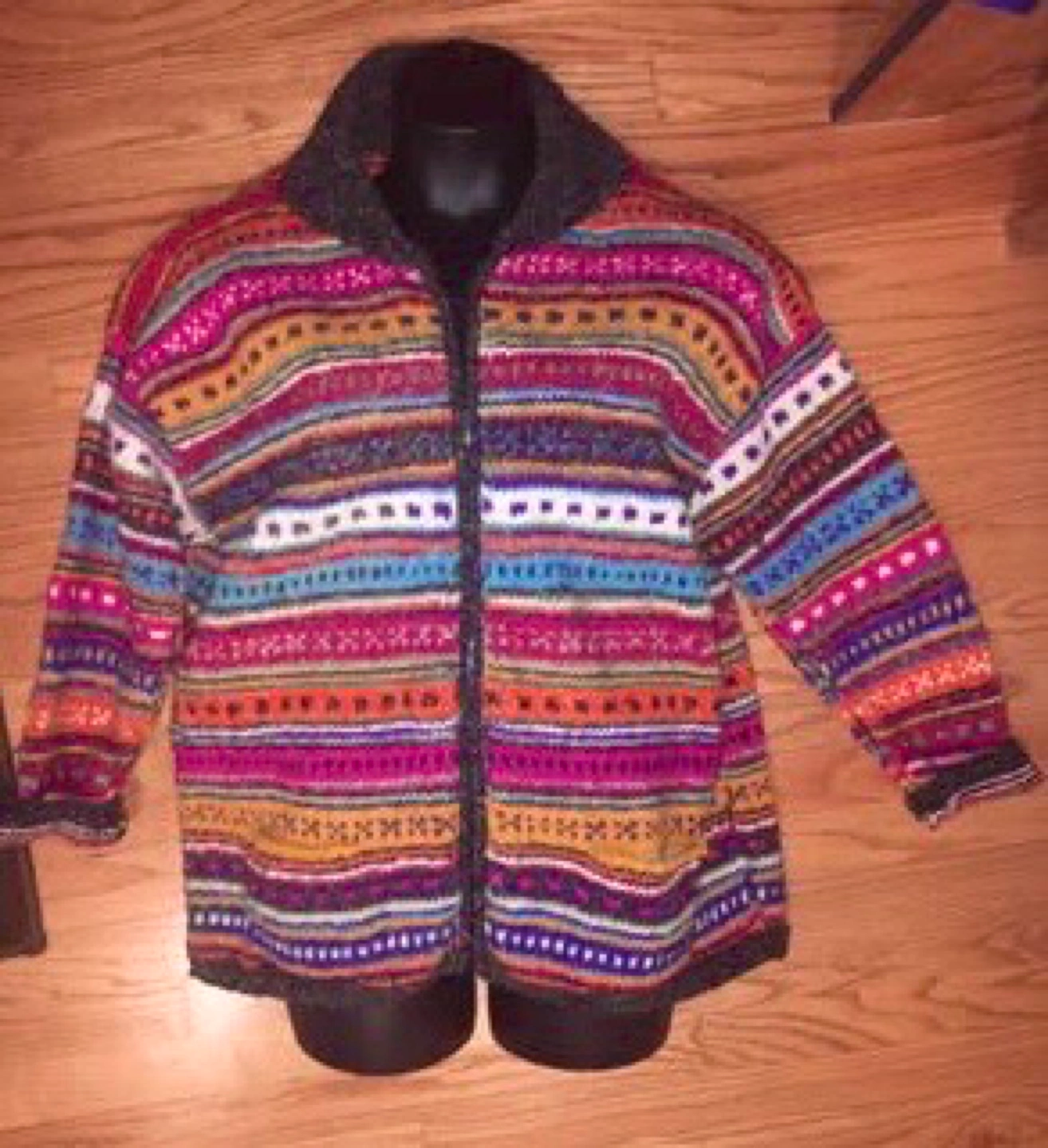 Warm and cozy, zip up front with front pockets as well. Beautiful colors bright and warm perfect for a cold winters.