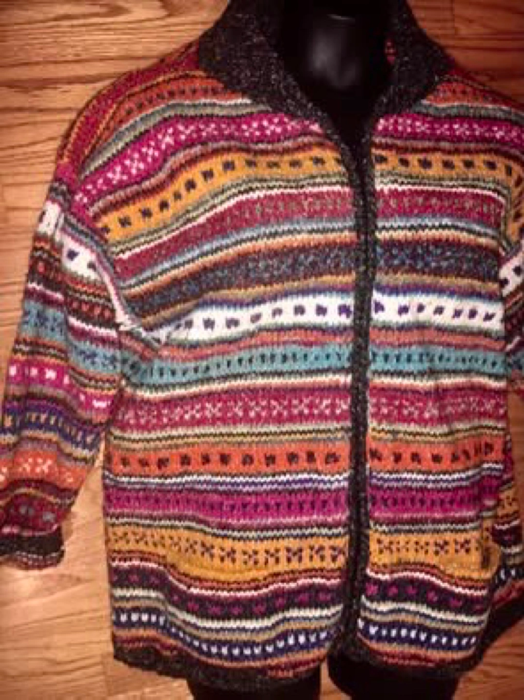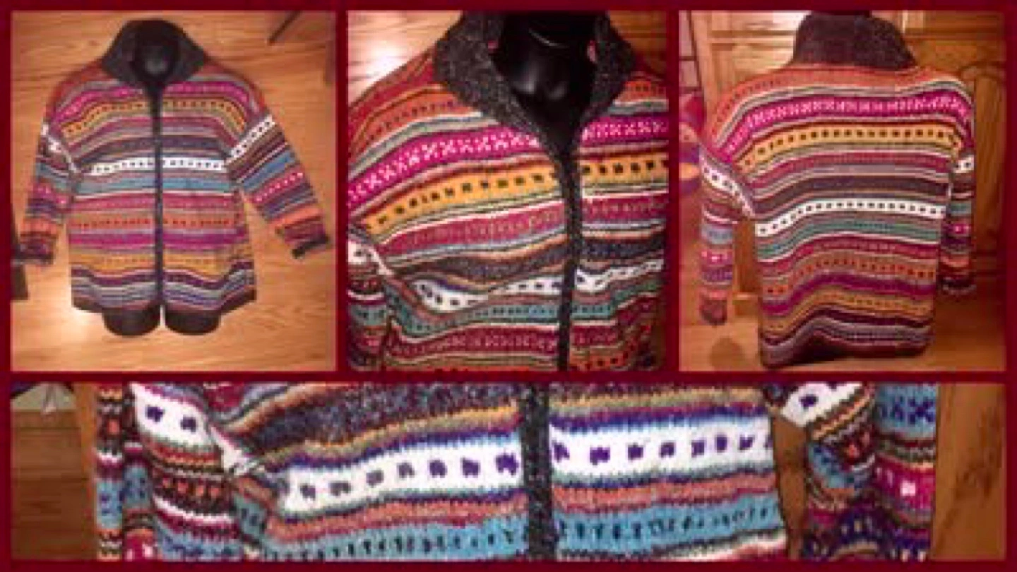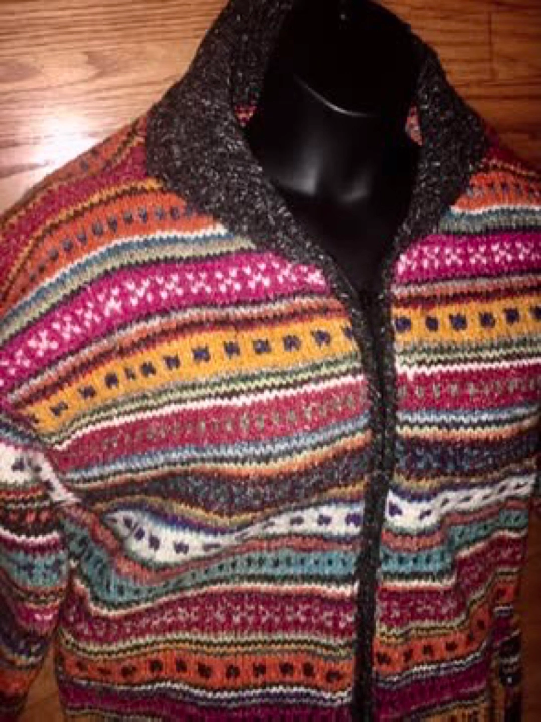 Warm and cozy, zip up front with front pockets as well. Beautiful colors bright and warm perfect for a cold winters.
