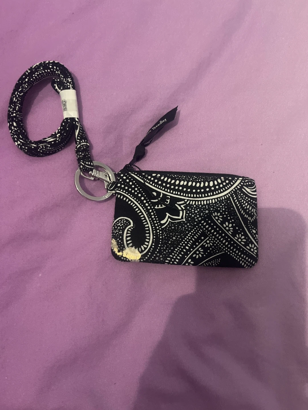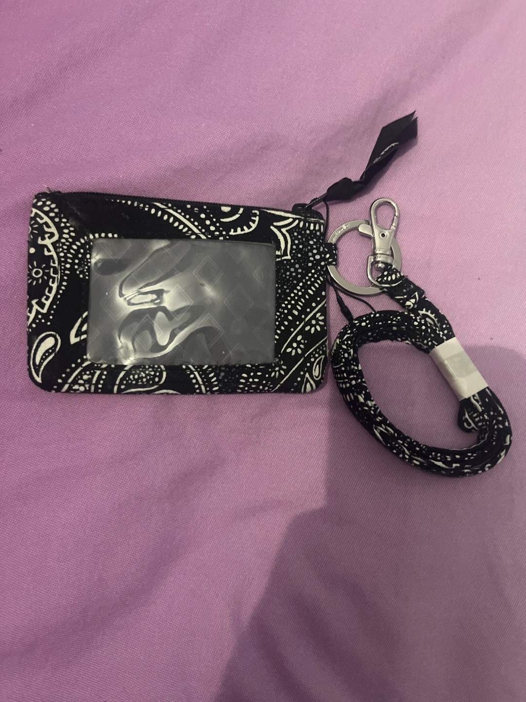 This is a Vera Bradley Zip ID Case with a lanyard in a black paisley pattern. It's perfect for carrying your ID and cards on the go! The case has a zip closure to keep your items secure.