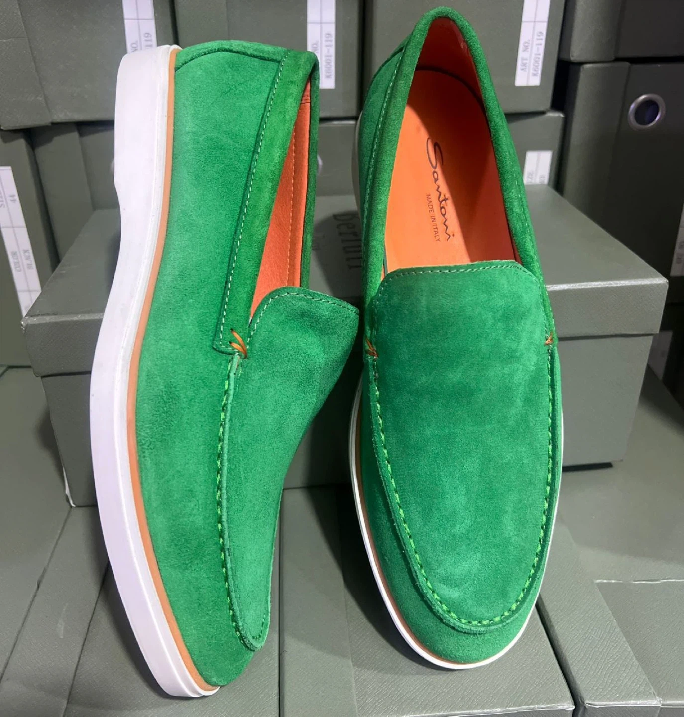 These are stylish green suede loafers from Santoni. They feature a classic moc-toe design with contrast stitching. The interior is lined with orange leather.
