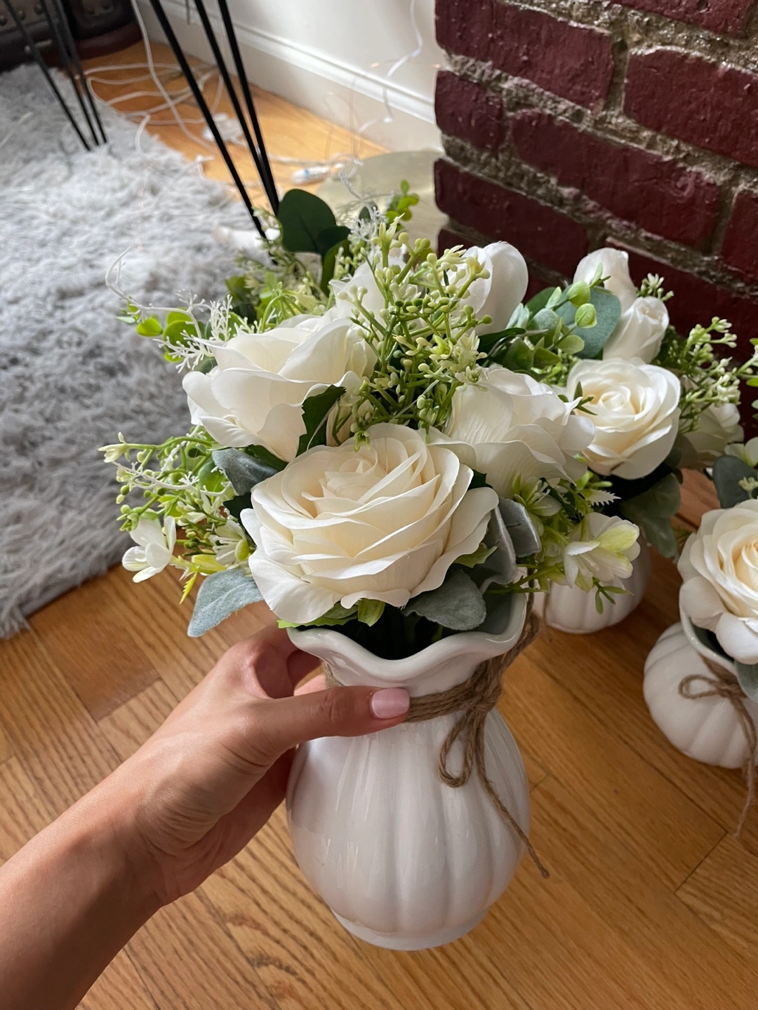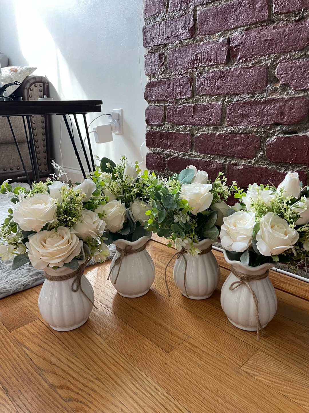 15Artificial white roses in white ceramic vases. Each vase is adorned with a twine bow. These centerpieces are an excellent way to bring a touch of nature into your space.