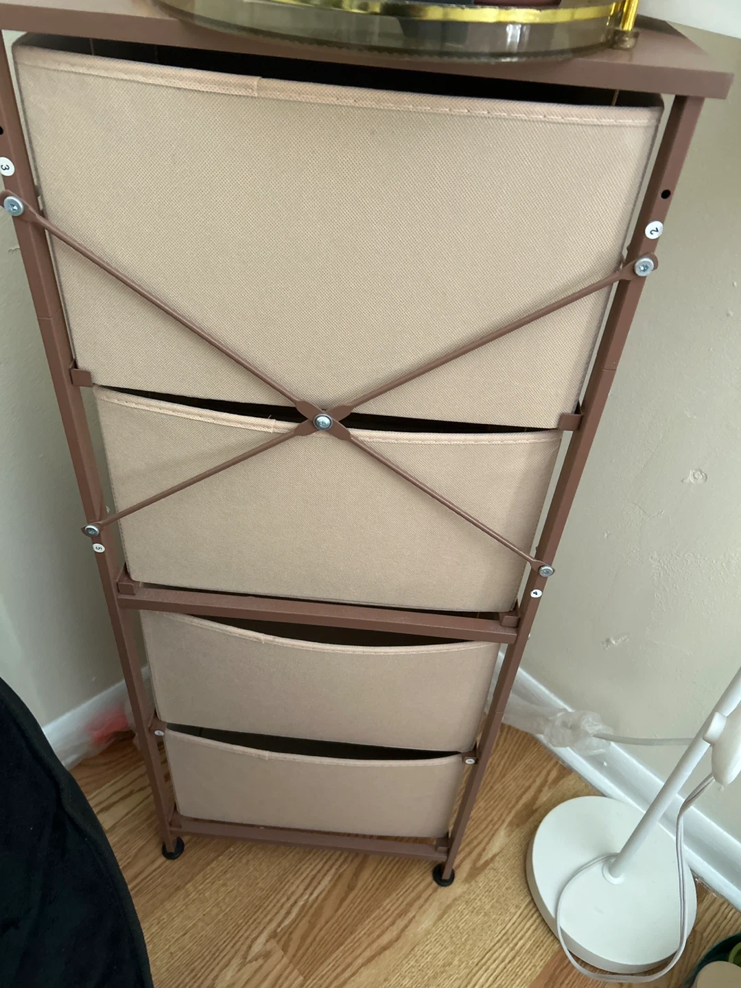 Here's a handy 4-drawer storage tower! It's perfect for organizing your space and keeping things tidy. The drawers are a neutral color, so it'll fit right in with any decor