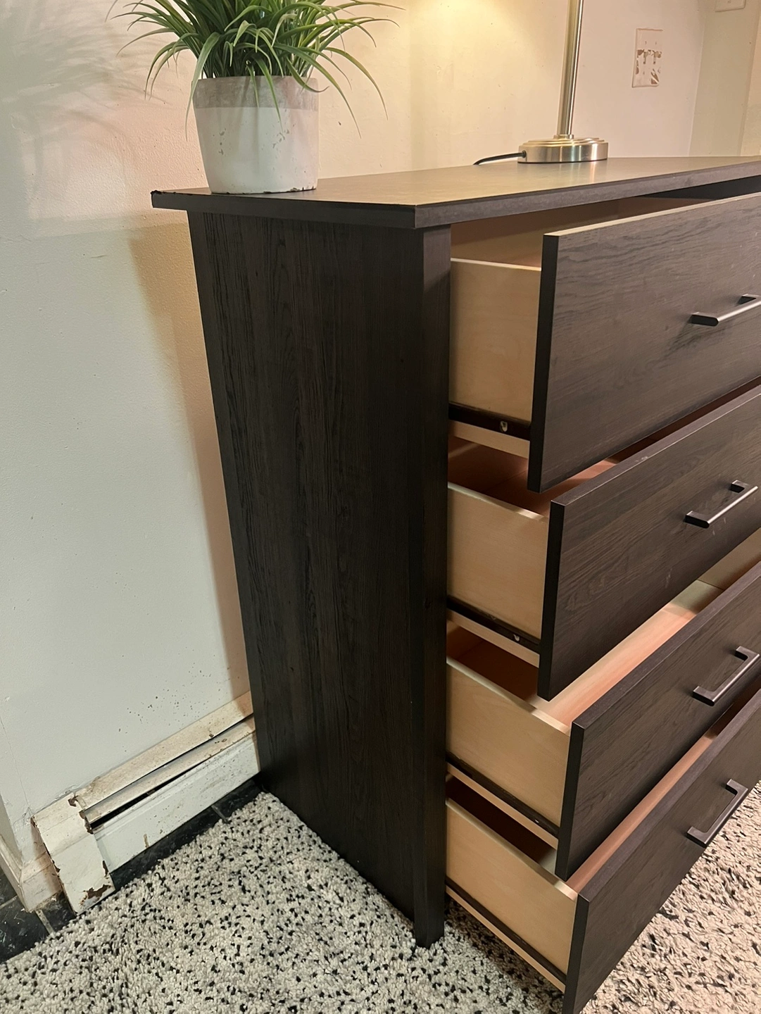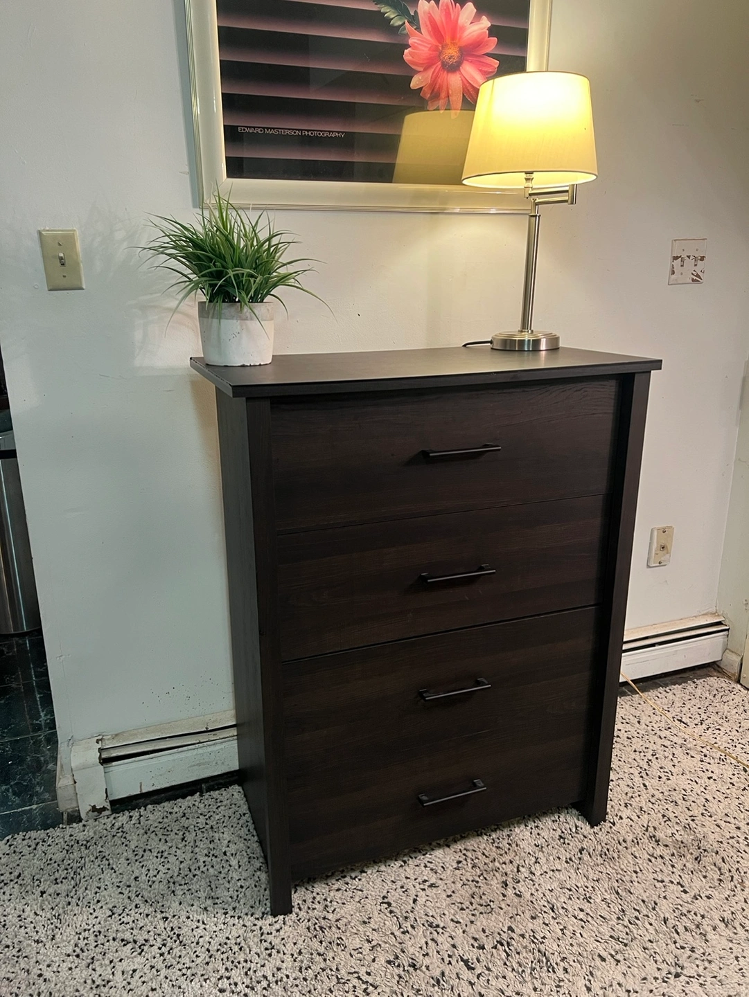 Selling four drawers dresser in espresso or dark brown color. Drawers open and close as they should. Sturdy and may have very minor wear.