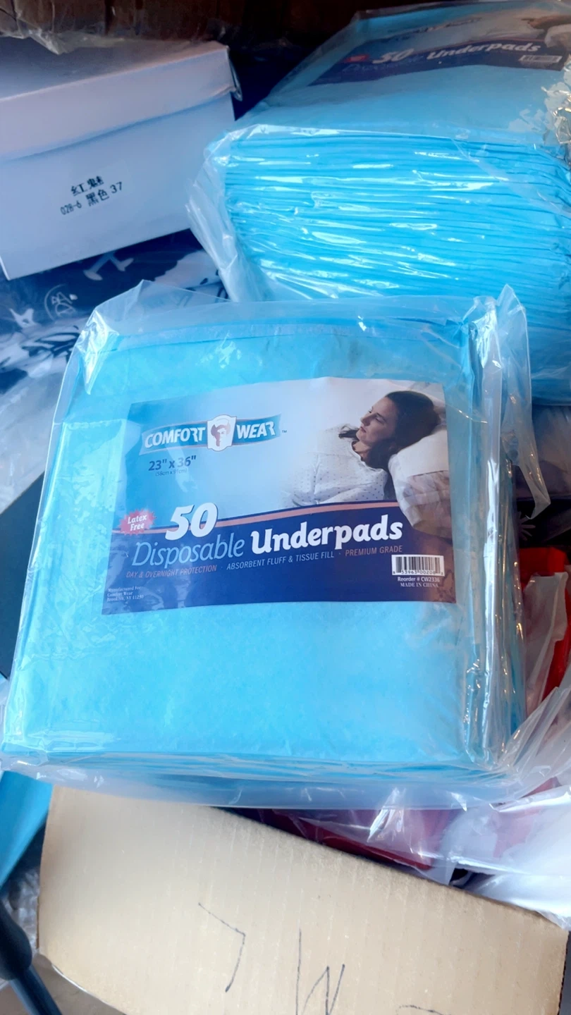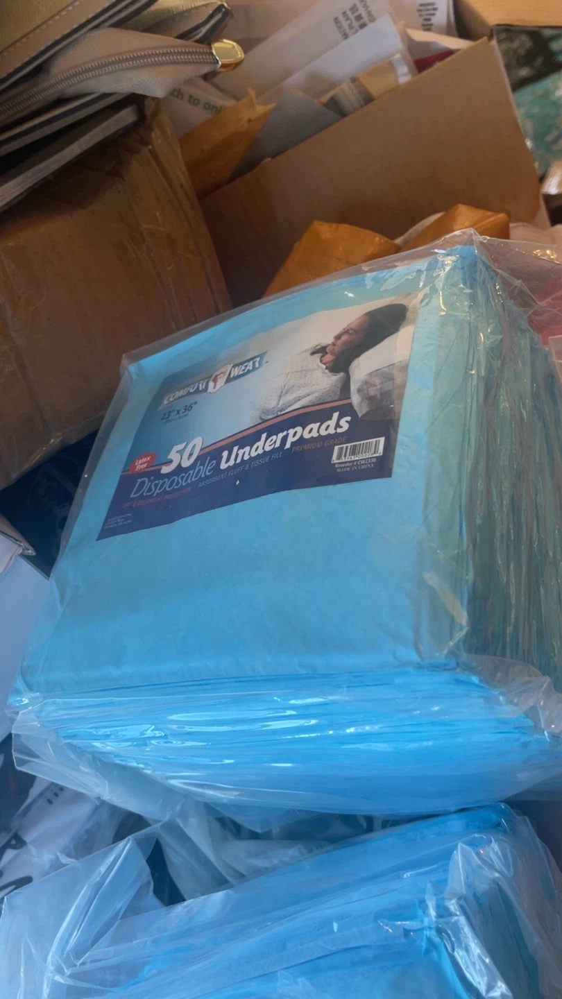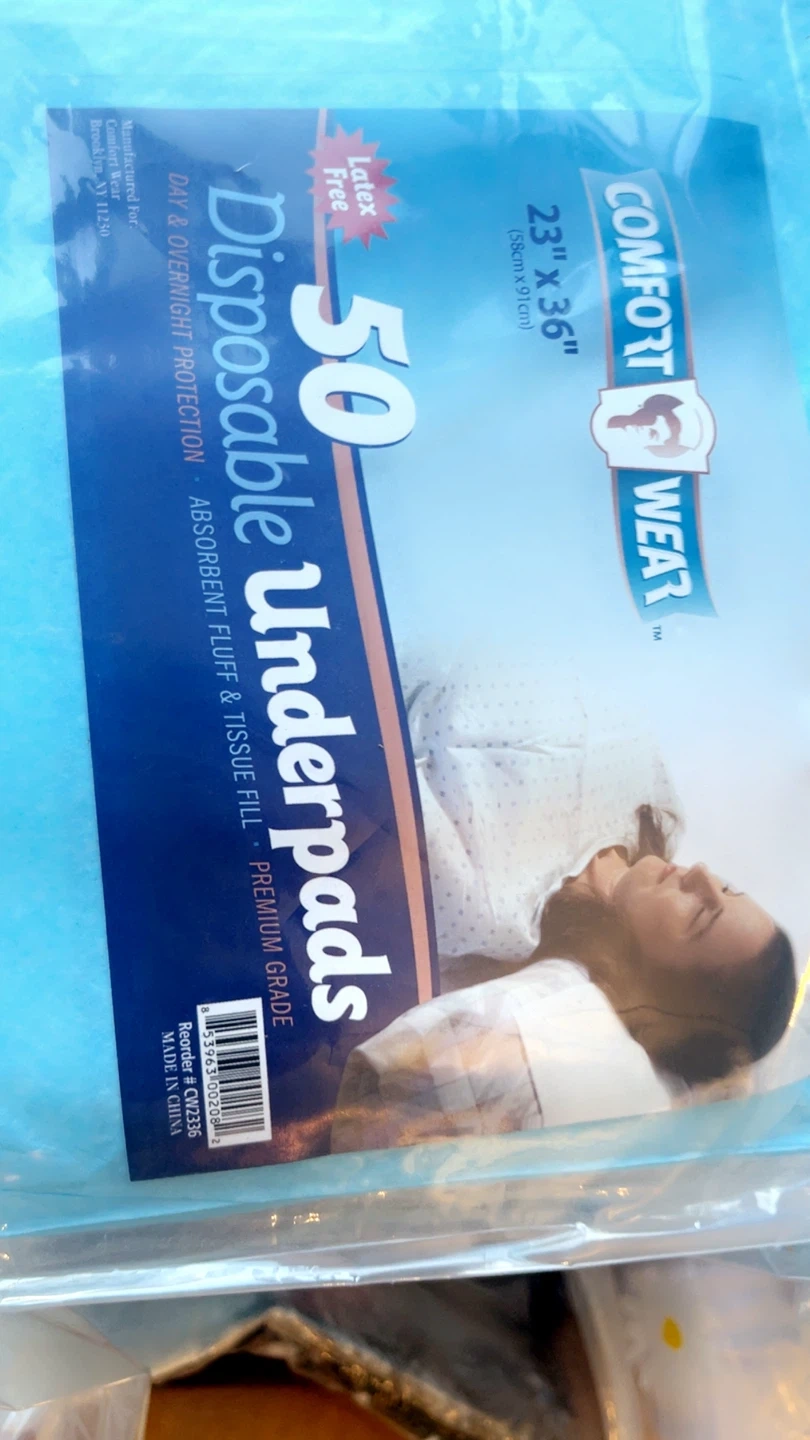 I'm selling Comfort Wear disposable underpads. They are 23" x 36" in size and come in a pack of 50. These underpads are latex-free and designed for day and overnight protection. They feature absorbent fluff and tissue fill, and are premium graduated I have a lot