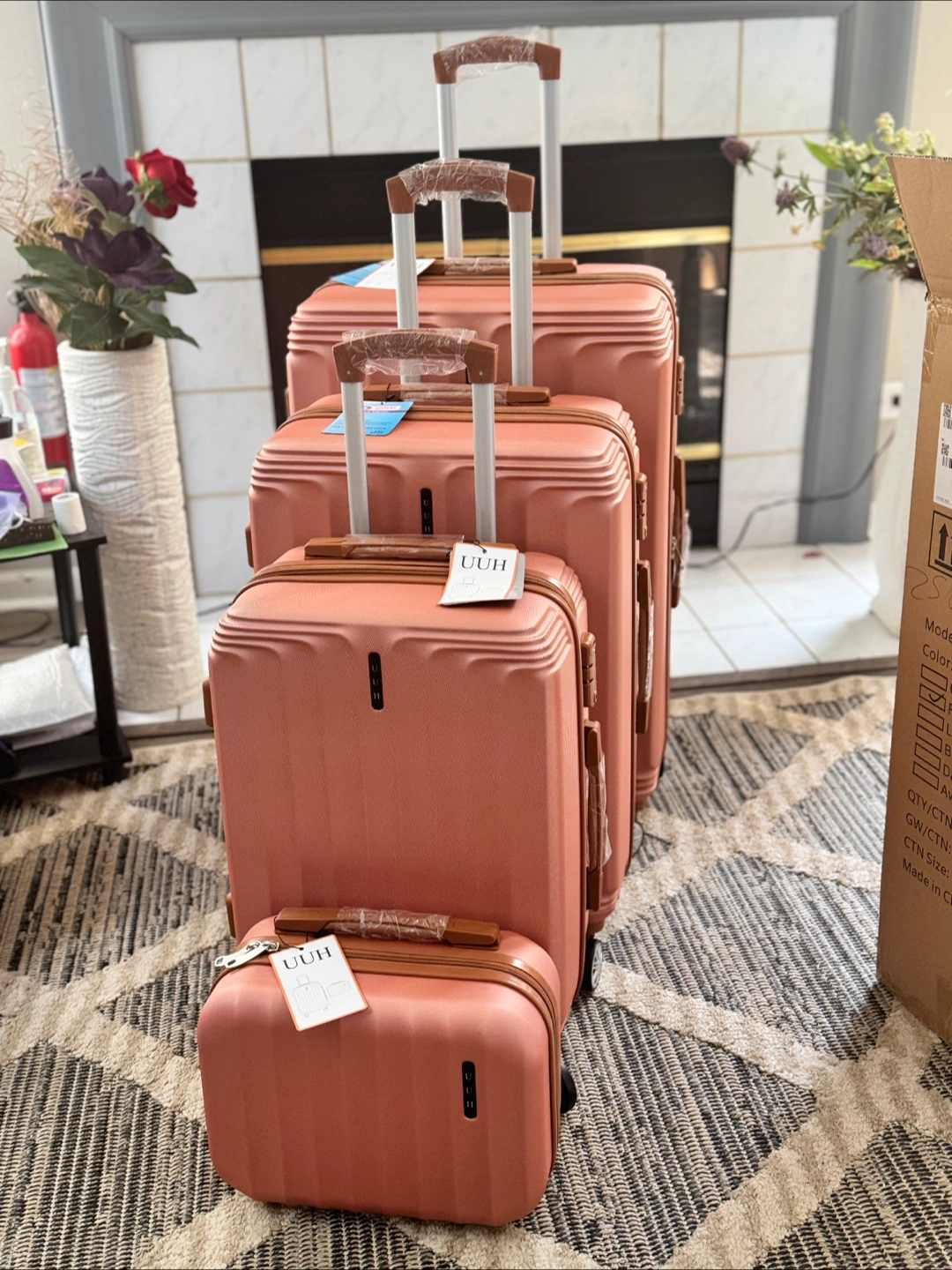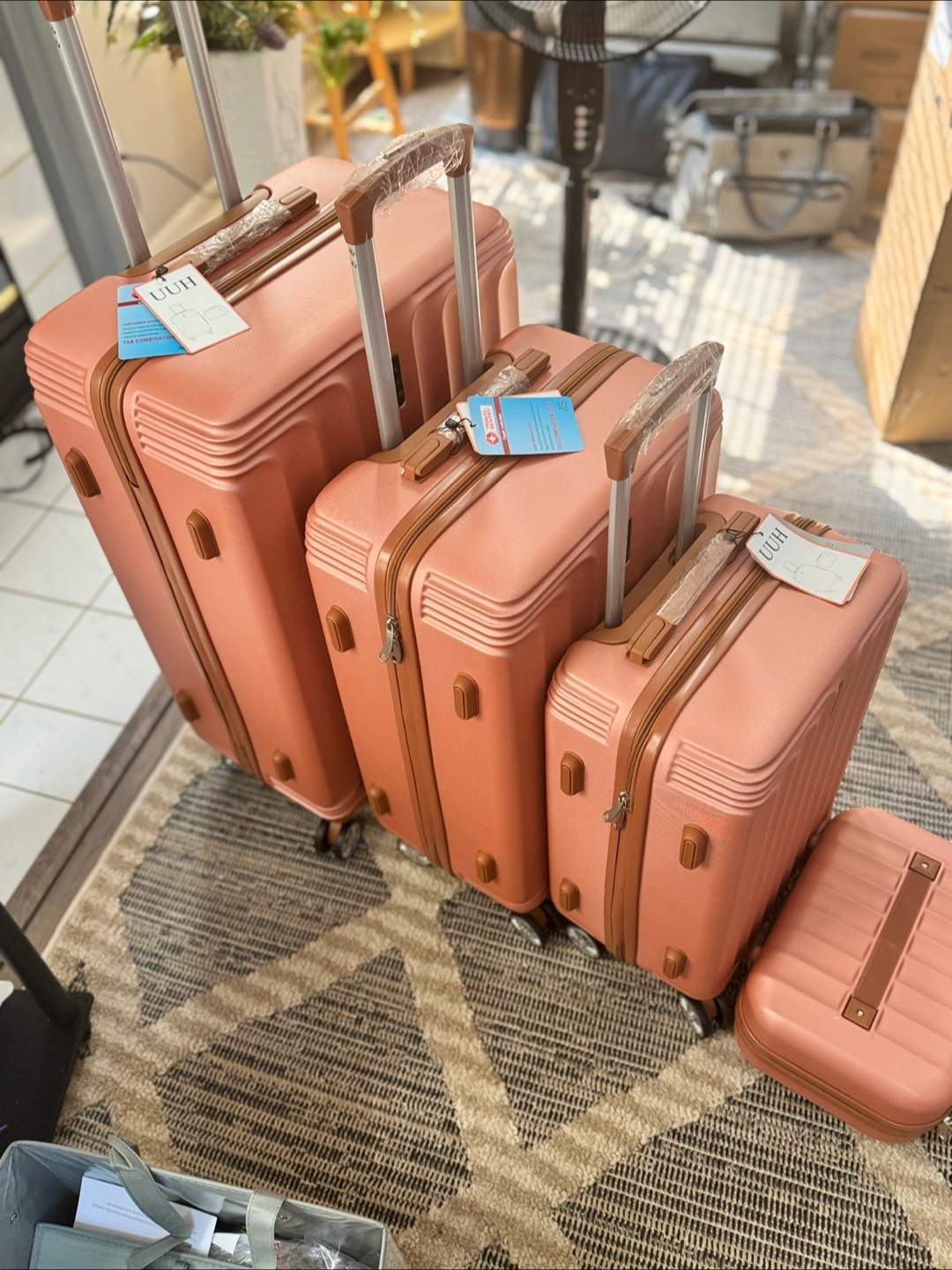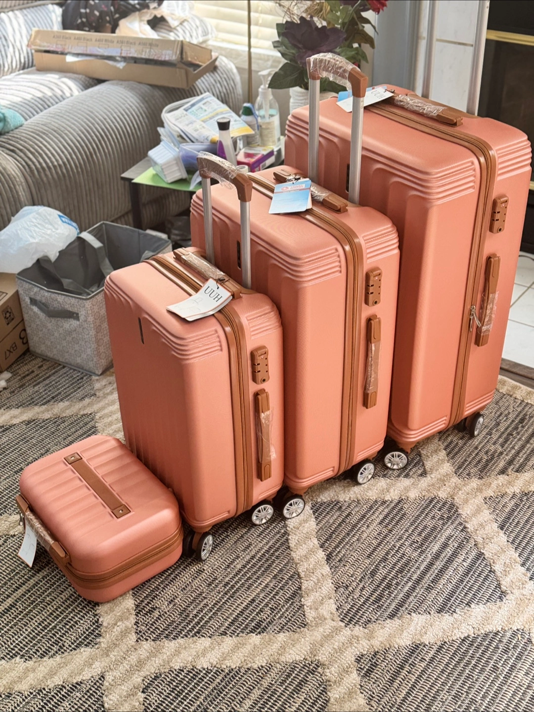 103I am offering a set of luggage in a lovely coral color. There are four different sized pieces to choose from. They all have handles and wheels. It will be perfect for a peaceful getaway. A 4 piece travel luggage set made of hard rugged ABS plastic, with TSA approved combination locks and 4 spinner wheels on each suitcase so that you could walk each one along with you instead of dragging them like in the old style. They come in world airlines and sea ports approved check in sizes of 28 inches, 24 inches and a guaranteed 20 inch size carry on bag plus a carrying makeup bag all in a matching pink color. I’m selling them as I bought them for a cruise that we were scheduled to go in summer but now had to be canceled due to a conflict of timing. These are still packed in the plastic and box as they can be nestled inside each other as a space saver. I paid $150 plus tax thinking it was a great deal but am selling them cheaper just to get rid of them and my memory of a canceled cruise. They come from a virus free, smoke free and pet free home so no odors. Pickup is by Schaumburg and Barrington Road in Schaumburg IL 60194.