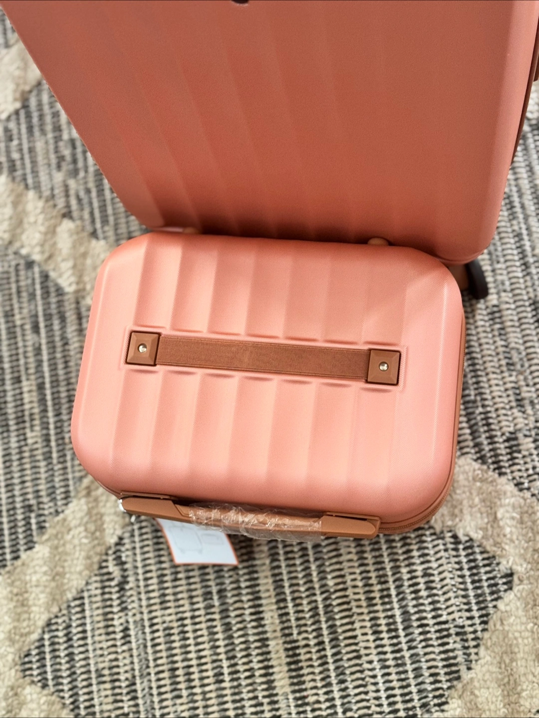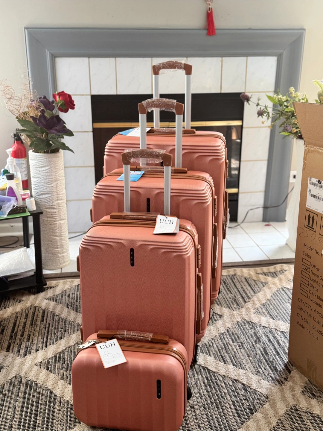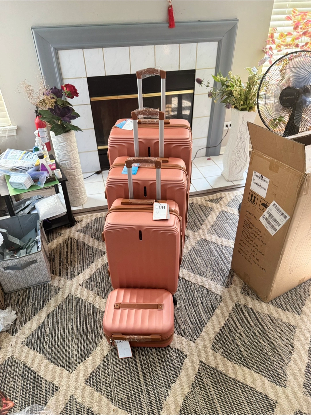 103I am offering a set of luggage in a lovely coral color. There are four different sized pieces to choose from. They all have handles and wheels. It will be perfect for a peaceful getaway. A 4 piece travel luggage set made of hard rugged ABS plastic, with TSA approved combination locks and 4 spinner wheels on each suitcase so that you could walk each one along with you instead of dragging them like in the old style. They come in world airlines and sea ports approved check in sizes of 28 inches, 24 inches and a guaranteed 20 inch size carry on bag plus a carrying makeup bag all in a matching pink color. I’m selling them as I bought them for a cruise that we were scheduled to go in summer but now had to be canceled due to a conflict of timing. These are still packed in the plastic and box as they can be nestled inside each other as a space saver. I paid $150 plus tax thinking it was a great deal but am selling them cheaper just to get rid of them and my memory of a canceled cruise. They come from a virus free, smoke free and pet free home so no odors. Pickup is by Schaumburg and Barrington Road in Schaumburg IL 60194.
