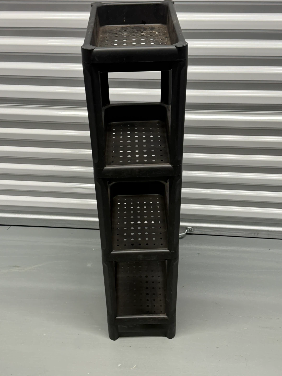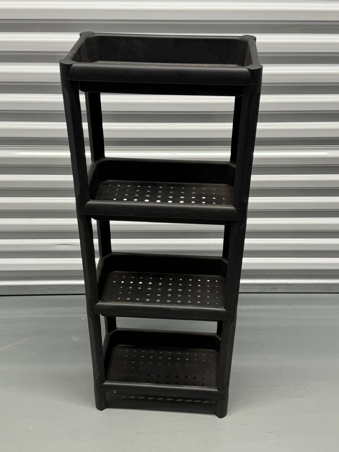 I'm selling a 4-tier black plastic storage shelf. It's perfect for organizing items in your bathroom, kitchen, or closet. It's lightweight and easy to move around