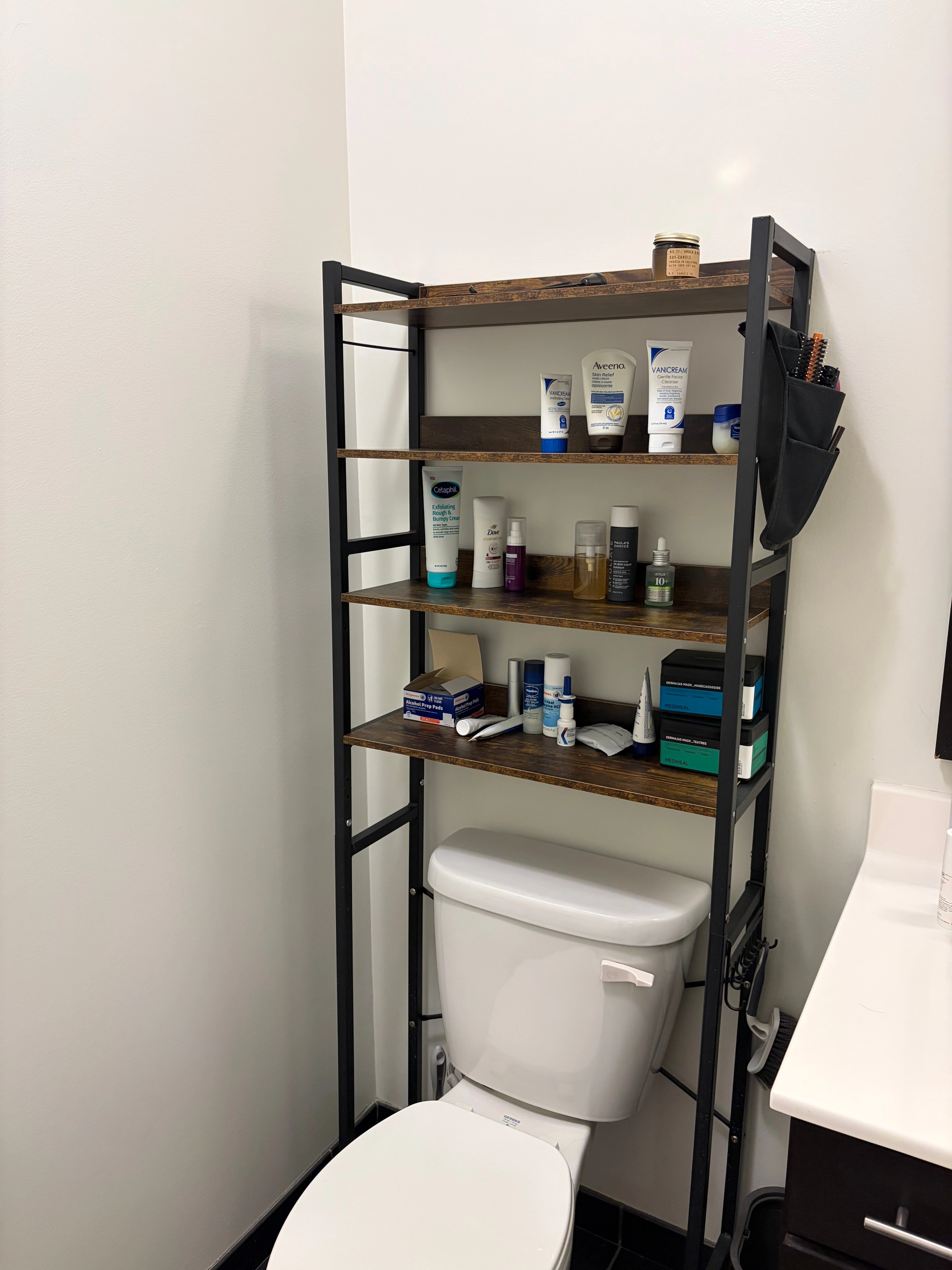 29Space-saving 4-tier storage shelf that fits over most standard toilets. Perfect for organizing a small bathroom or laundry room. Features a rustic brown wood-look finish with a sturdy black metal frame and X-shape design for stability. Also includes detachable hooks and cloth storage bags for extra items. Condition: Gently used, like new. Used briefly, no major damage or scuffs. Original Price: $90. Asking Price: $55 OBO. Pickup: Local pickup only in the Lake View East / Wrigleyville area. Item can be partially disassembled for easy transport. Payment: Cash or Venmo
