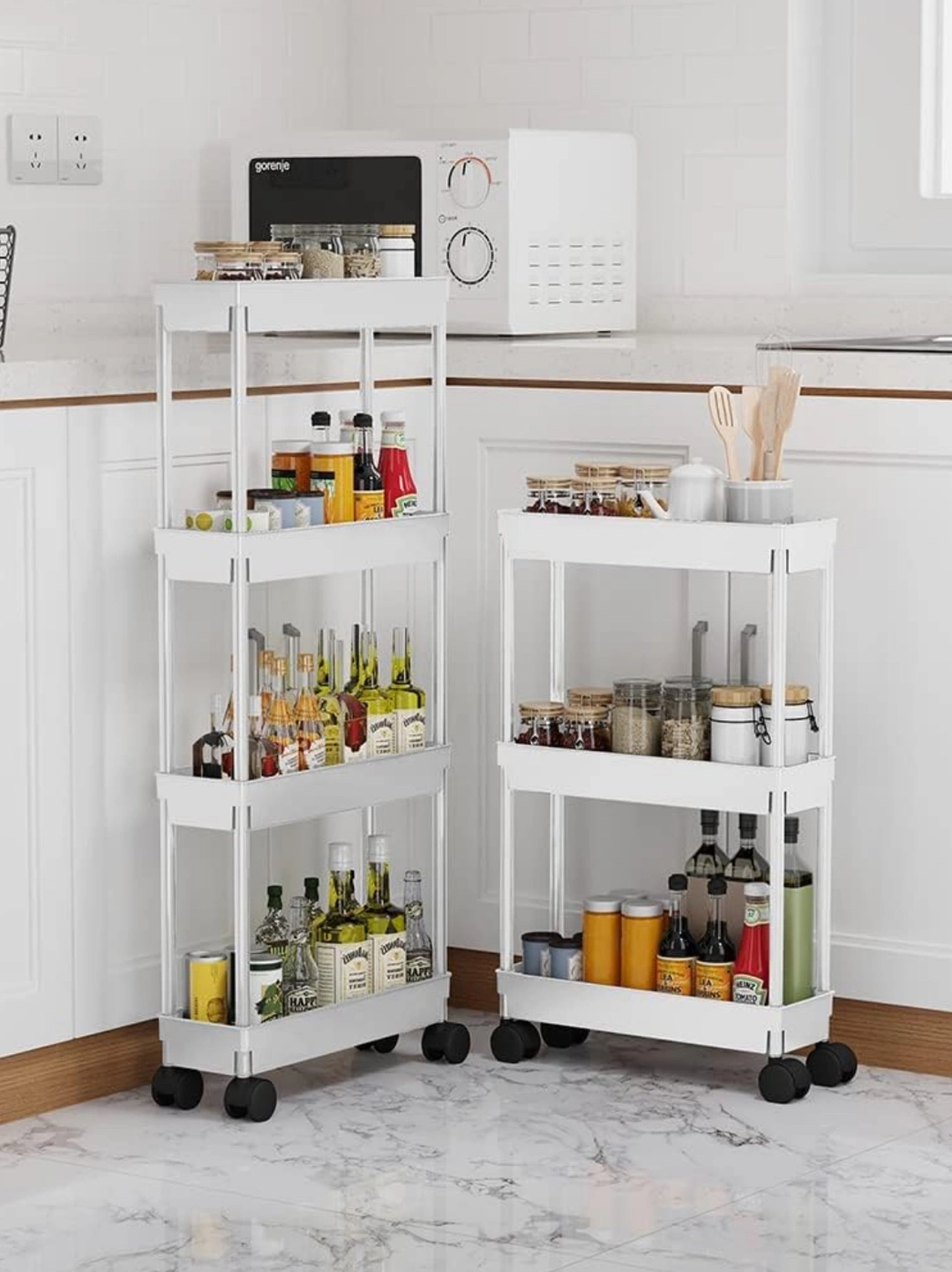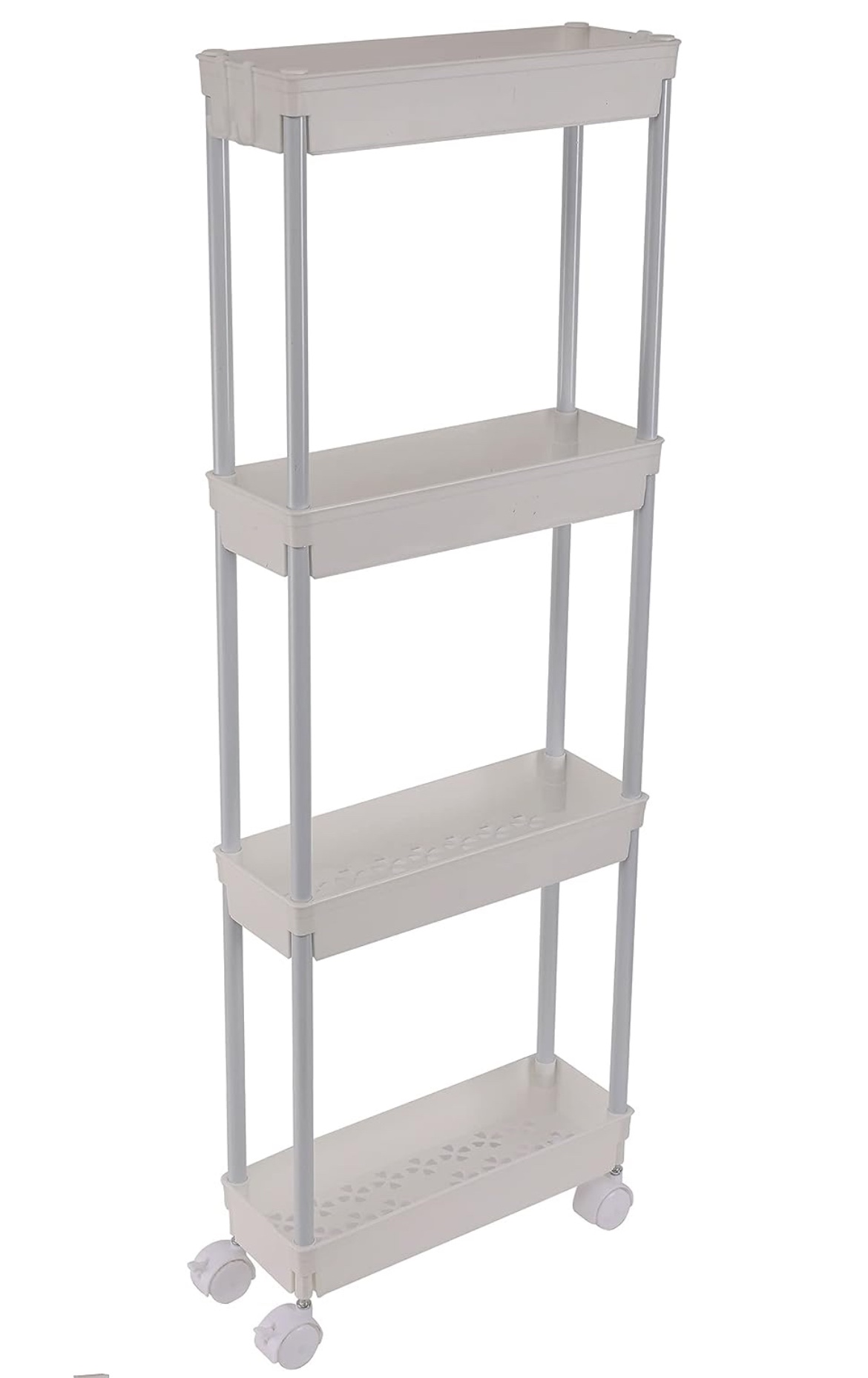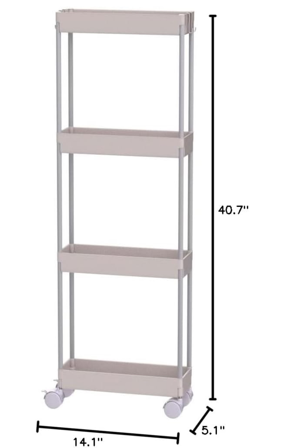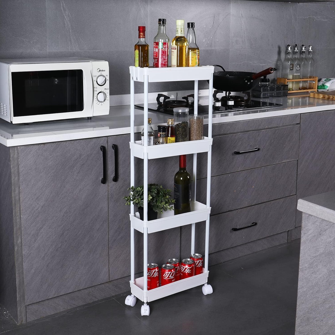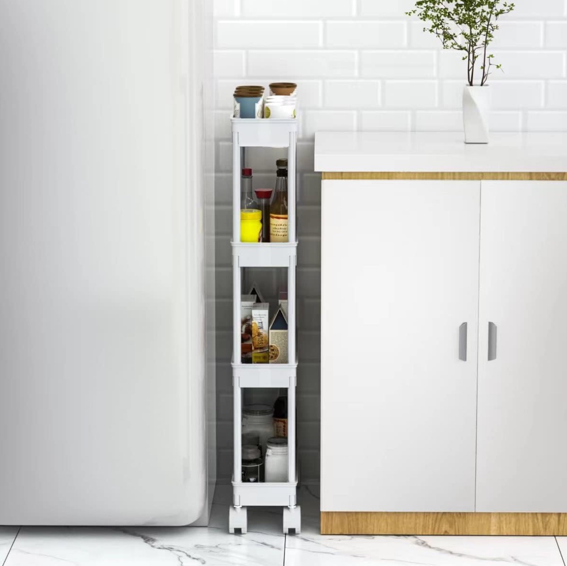 4 Tier Slim Storage Cart Mobile Shelving Unit Organizer Slide Out Storage Rolling Utility Cart Tower Rack for Kitchen Bathroom Laundry Narrow Places, Plastic & Stainless Steel,White