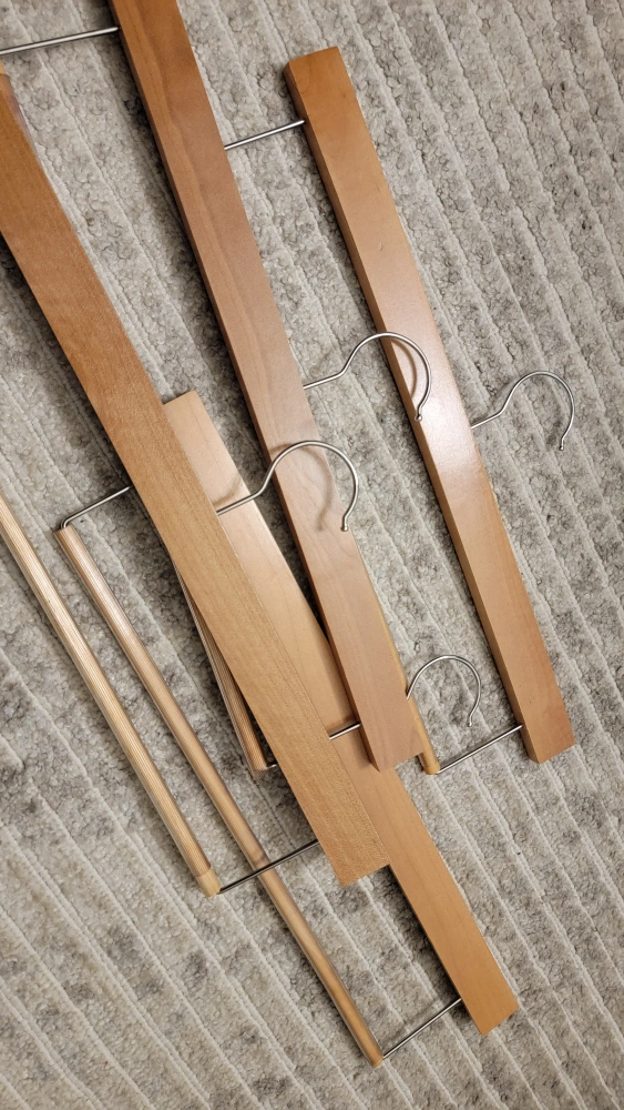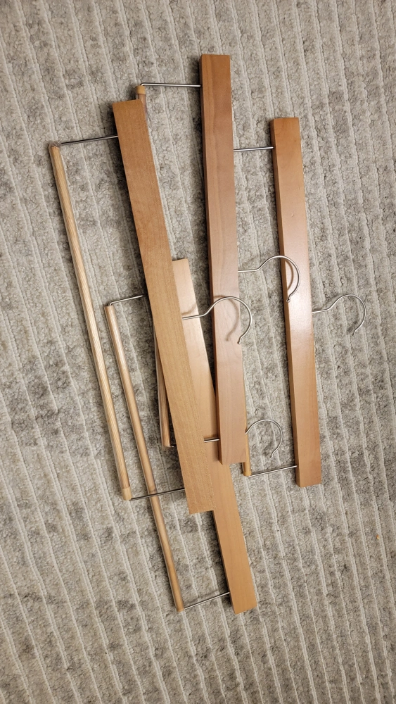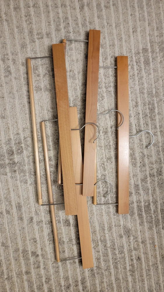 4 wood hangers. gently used. rubber bar for pants