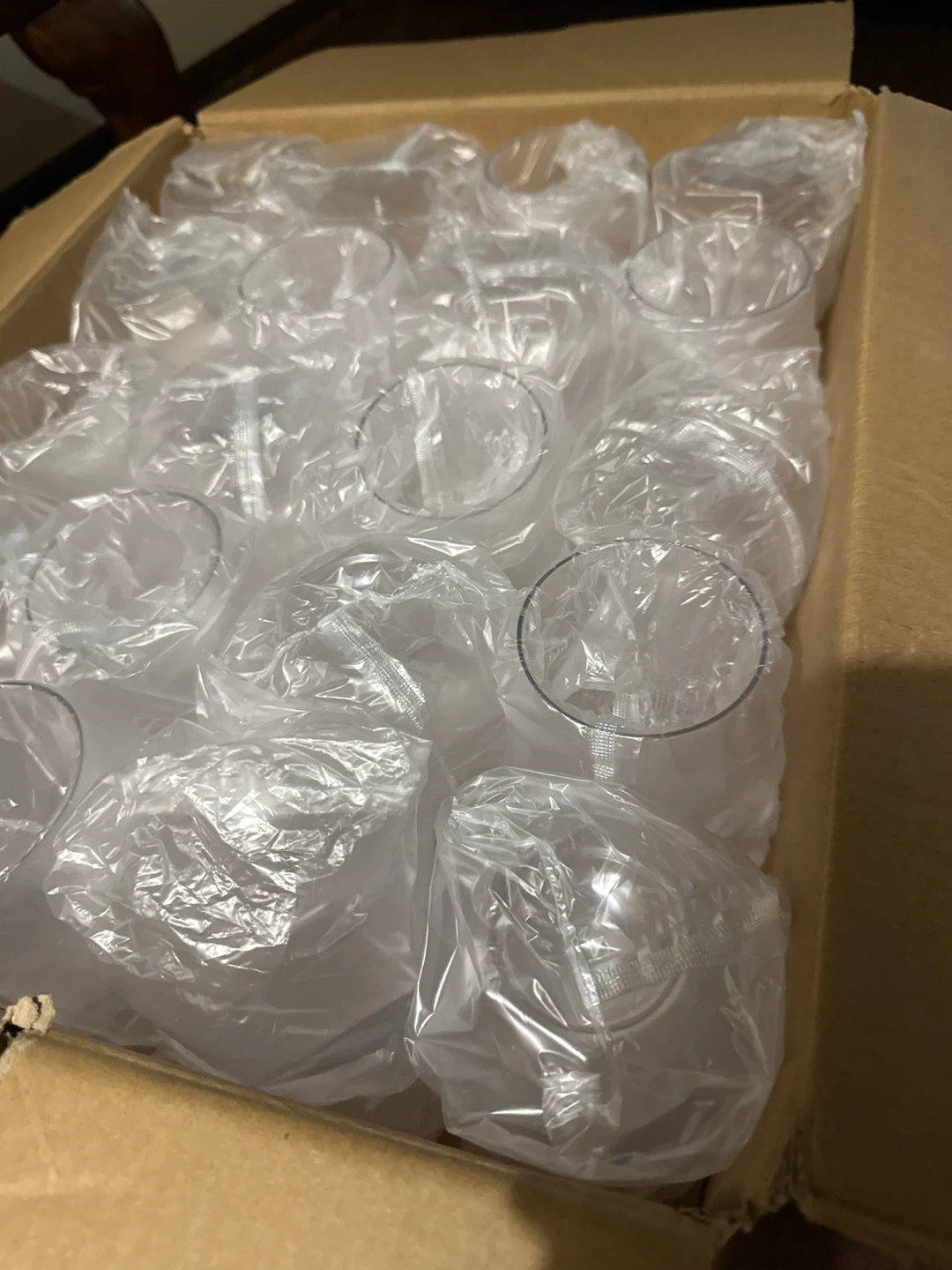 Selling a set of 40 unbreakable plastic stemless glasses! These glasses feature an elegant design and are durable, with a 12-ounce capacity. They are disposable for easy cleanup! It’s brand new I bought it for one party around 4 boxes which contains 40 pcs each but we only ended up using 2 of them so I have 2 whole unused boxes of 40 pcs each party glasses they are very good and easy to use one is for 30$ and 2 for 55$ if you are willing to buy both we can work up the price and it also has 40 sticker like shown in picture to name them