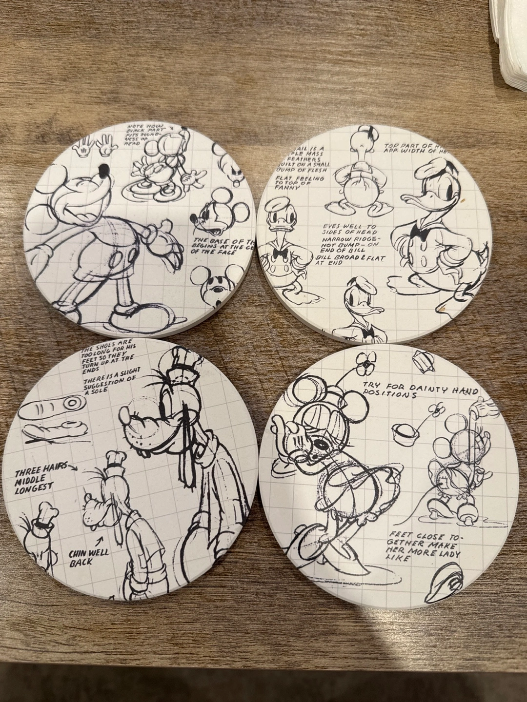 Set of four coasters. Features sketches of Mickey Mouse, Minnie Mouse, Goofy, and Donald Duck. Coasters show character design notes.