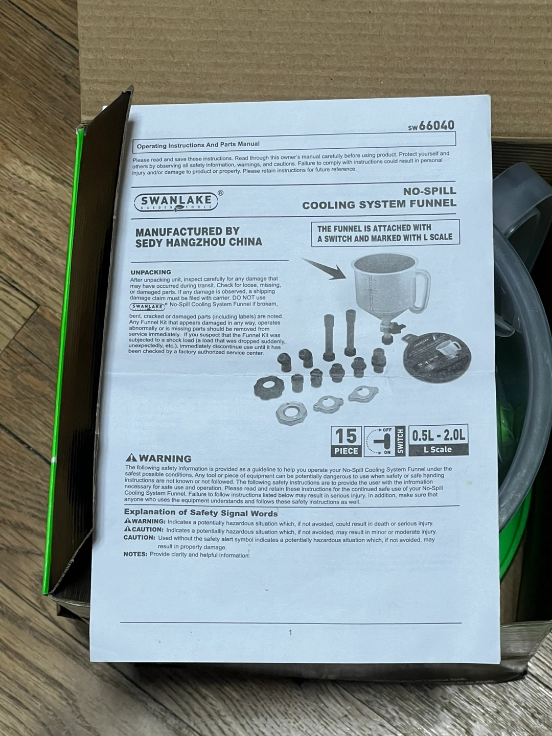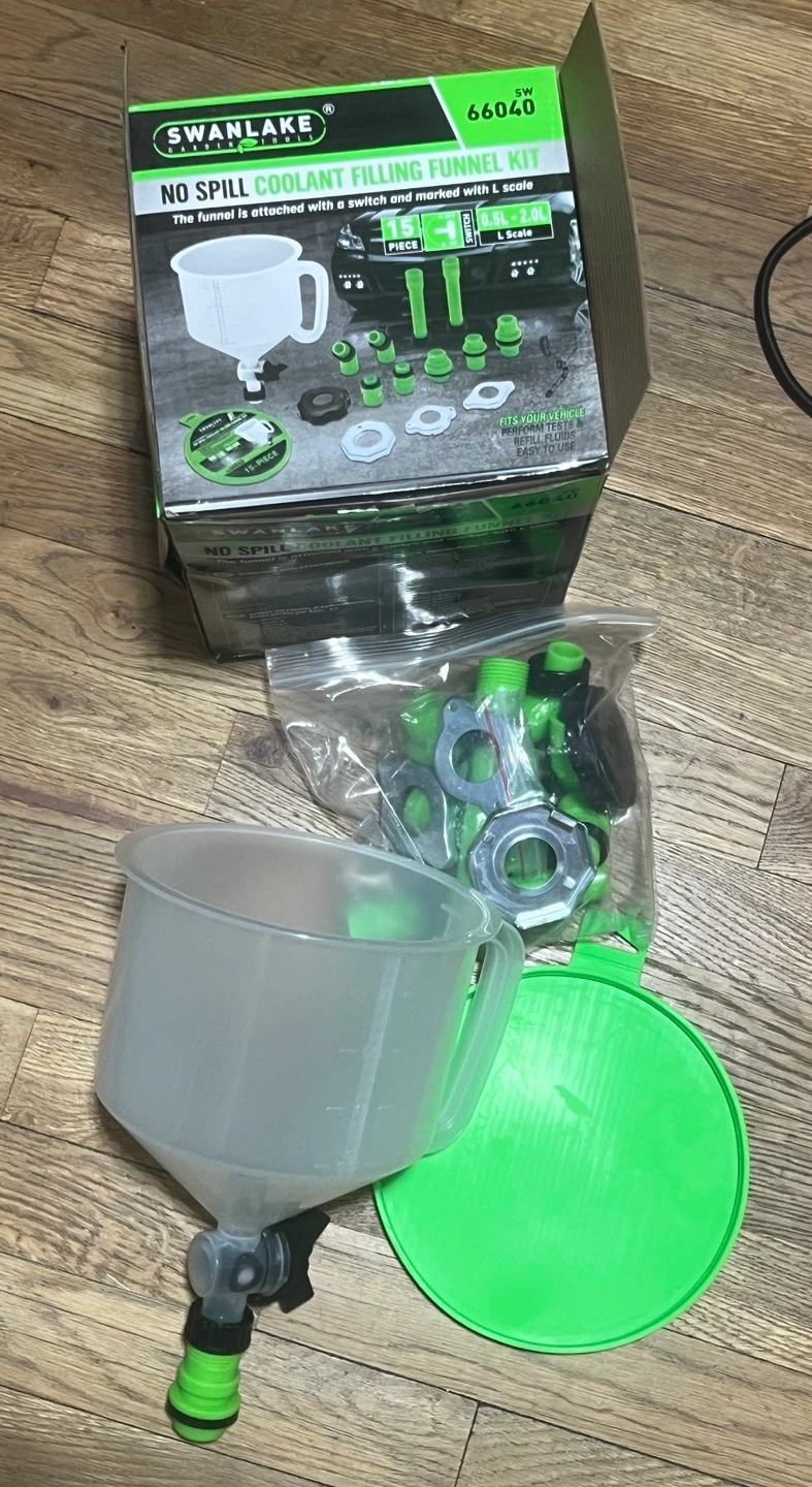 SWANLAKE No-Spill Coolant Funnel Kit,Spill Proof Funnel Bleeder with Adapters. 15Pcs with universal fitment. Includes funnel, adapters, and other components. Opened box with all pieces and instructions included. Works great when adding coolant properly for maintenance.